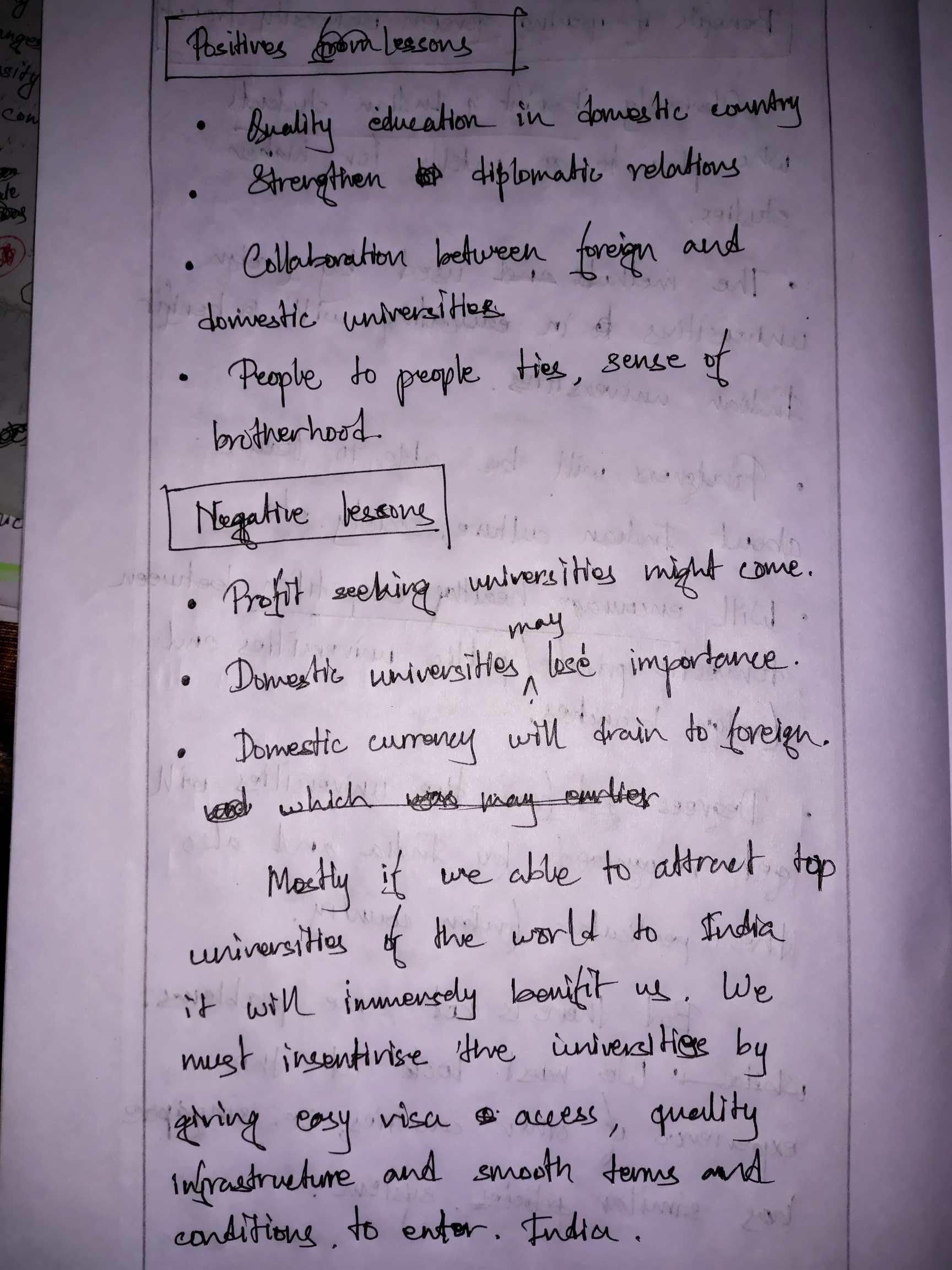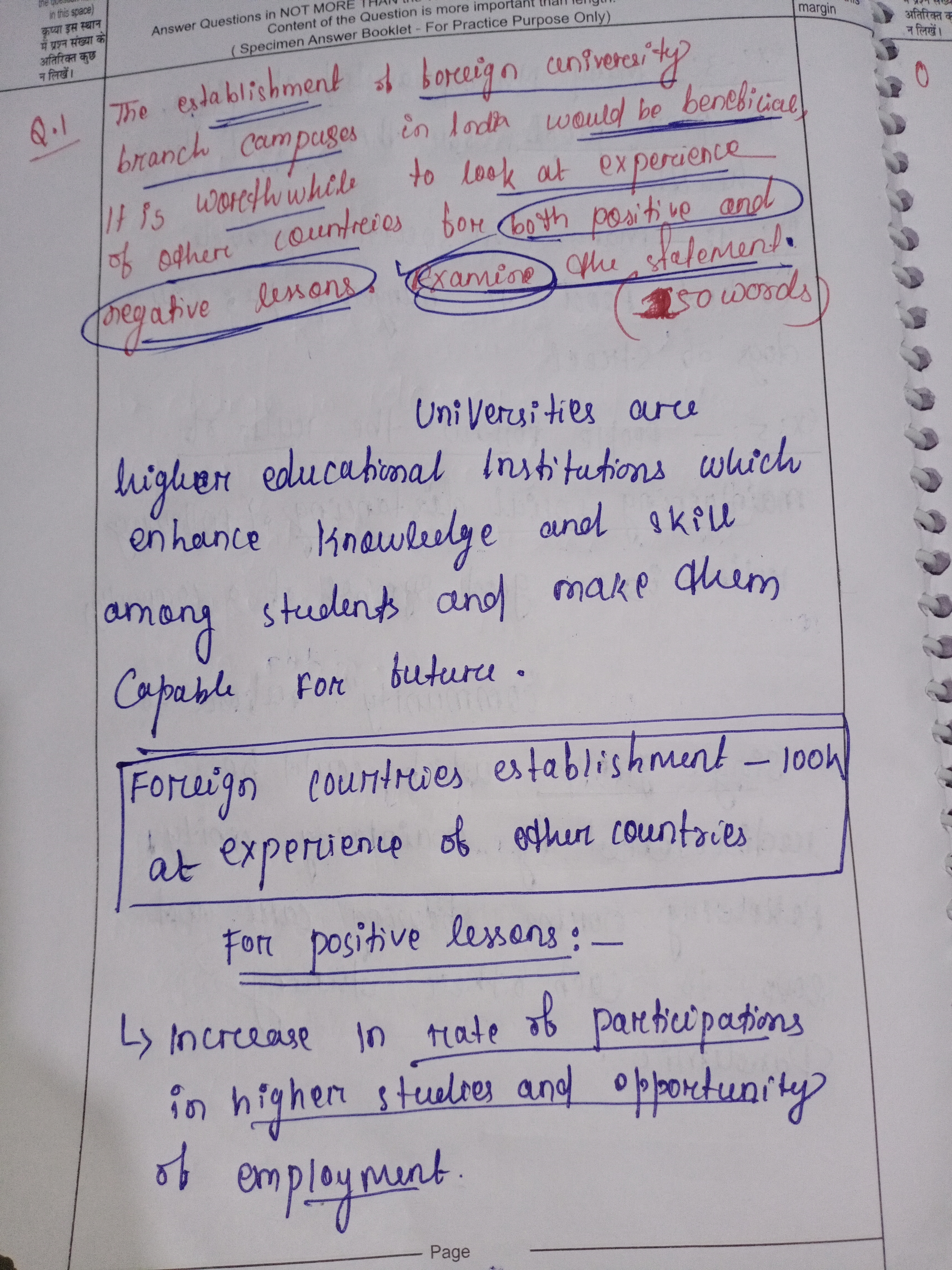 Just some more refinement is required in expression. Don’t take these suggestions as nitpicking, but the choice of words can actually distinguish your answers from others, e.g., (a) The statement “NEP has rigid laws”, you can write “more flexibility is required in provisions of NEP” (avoid the word law); (b) Increase political relations, you can use “enhance India’s ‘soft power'”; (c) “sharing their professors” can be reworded as faculty exchange, student exchange, idea exchange etc. The small changes will help you get extra credit.