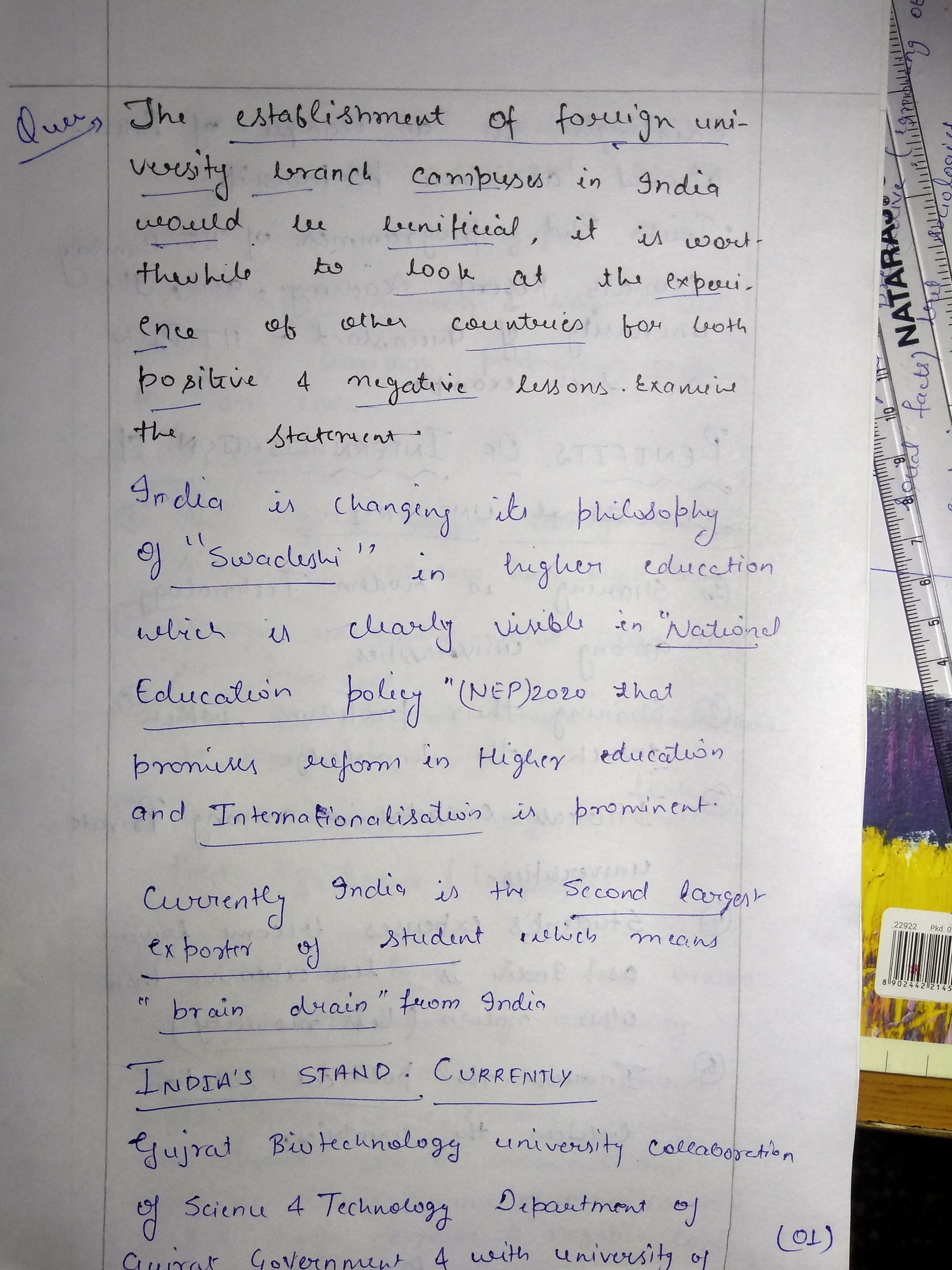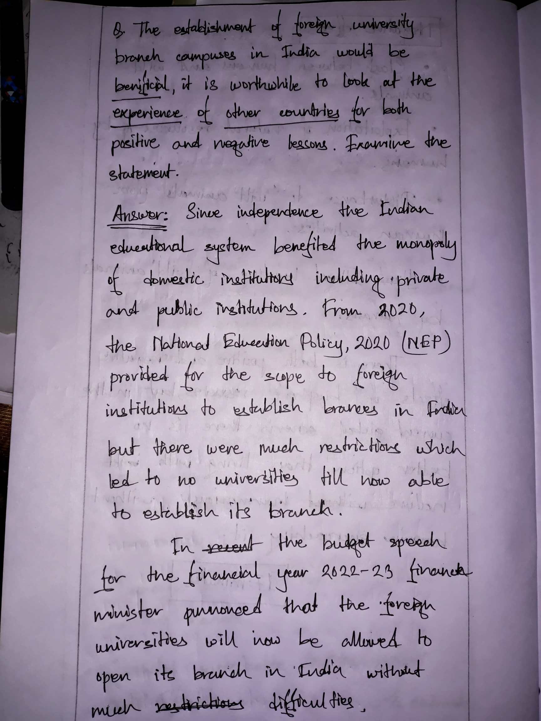 1.) The establishment of foreign university branch campuses in India would be beneficial, it is worthwhile to look at the experience of other countries for both positive and negative lessons. Examine the statement.