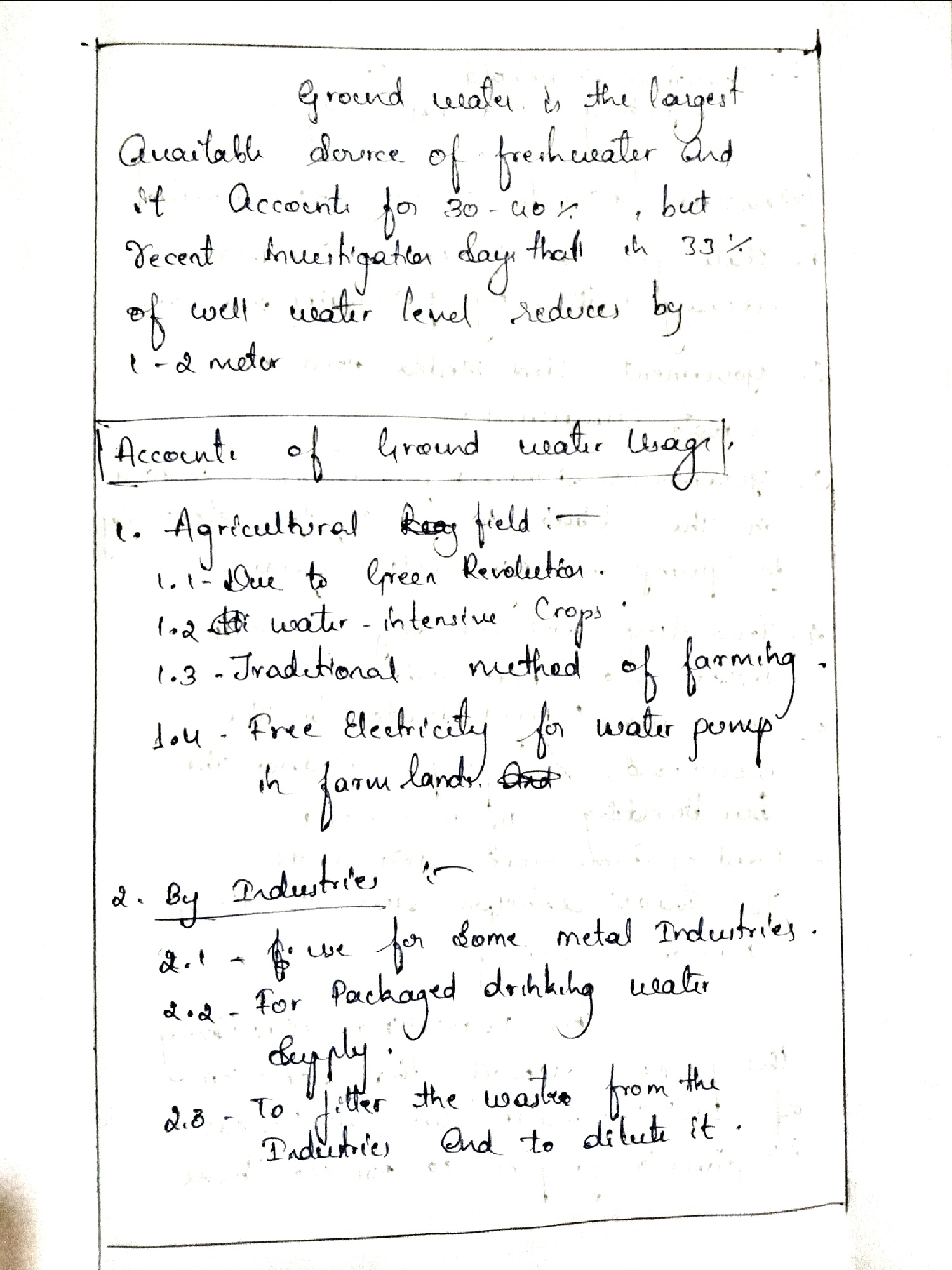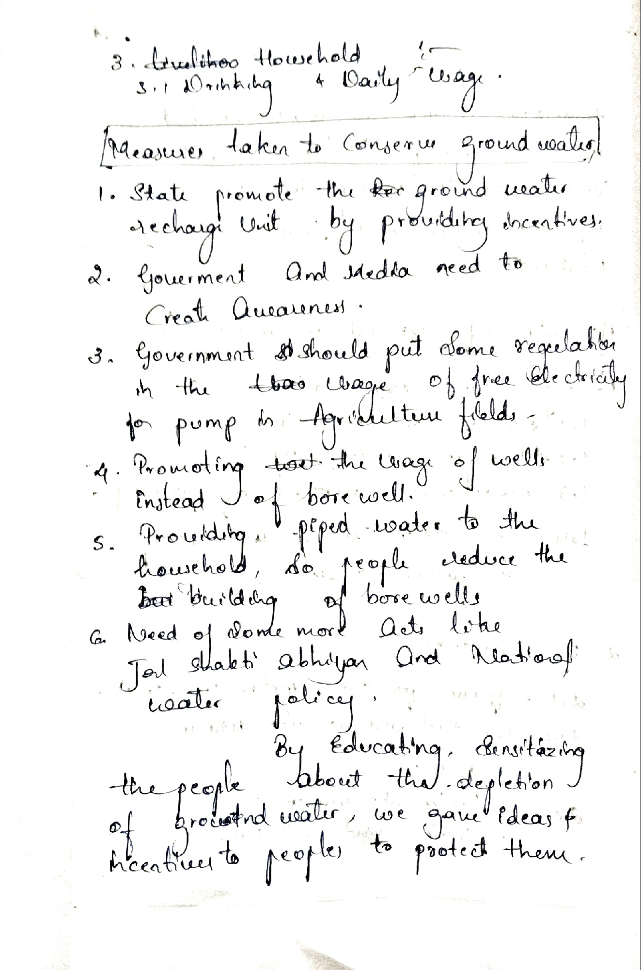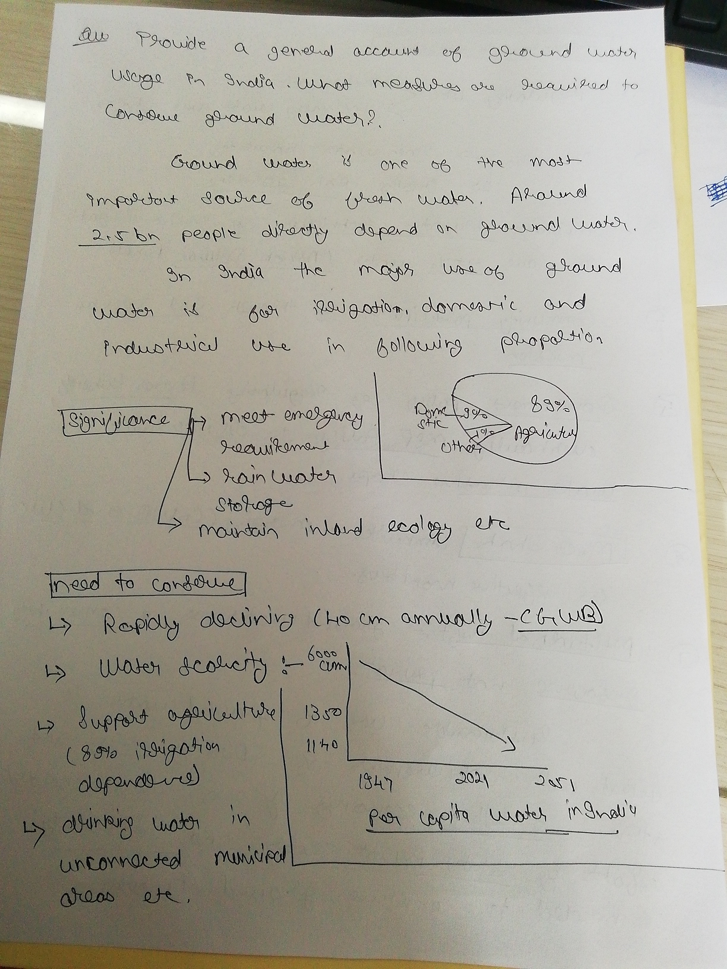 The introductory statement, please confirm the source of info once (groundwater accounting for 20-30% of water resources in India). Question is about groundwater, so don’t mention hydel power (it is surface water). In measures, include steps like judicious use in agriculture, regulation of groundwater extraction through law etc.