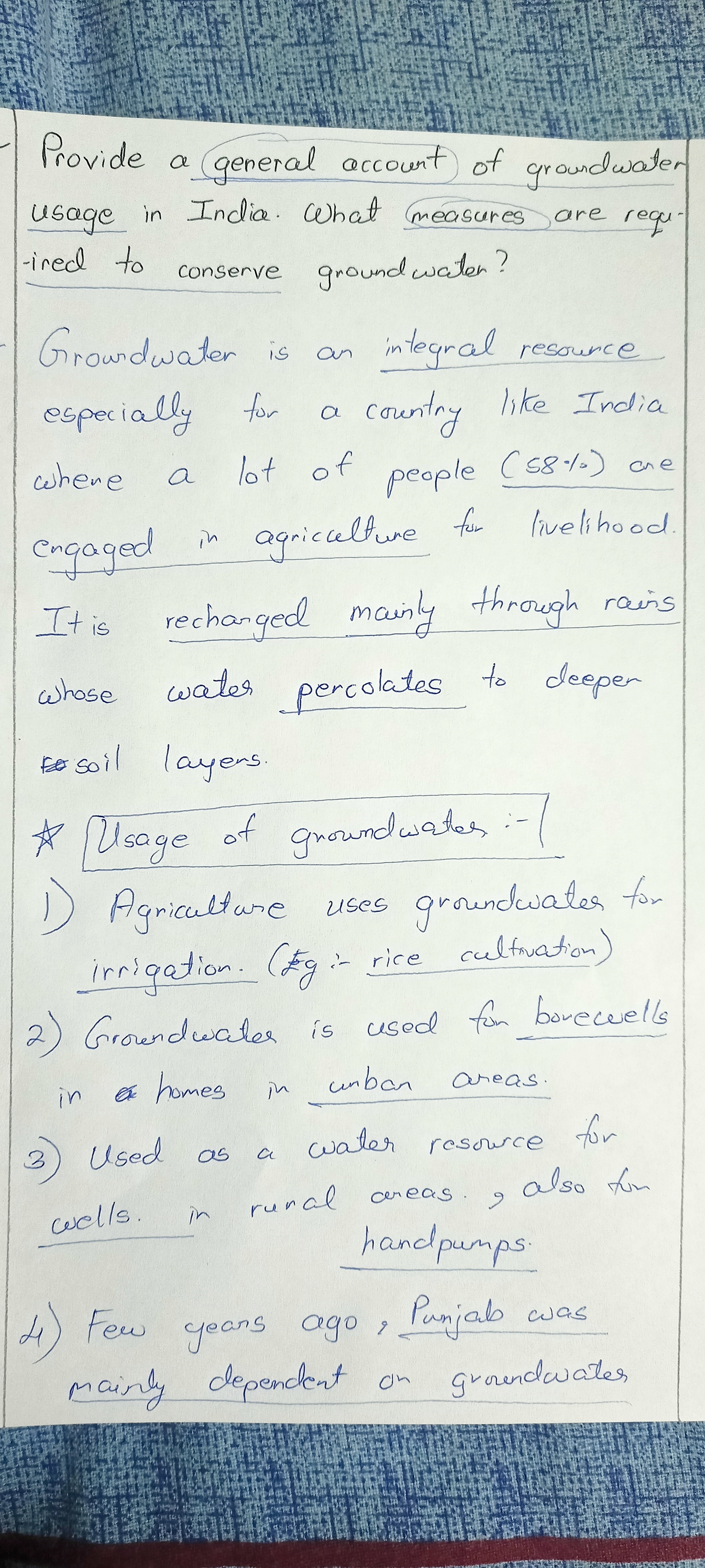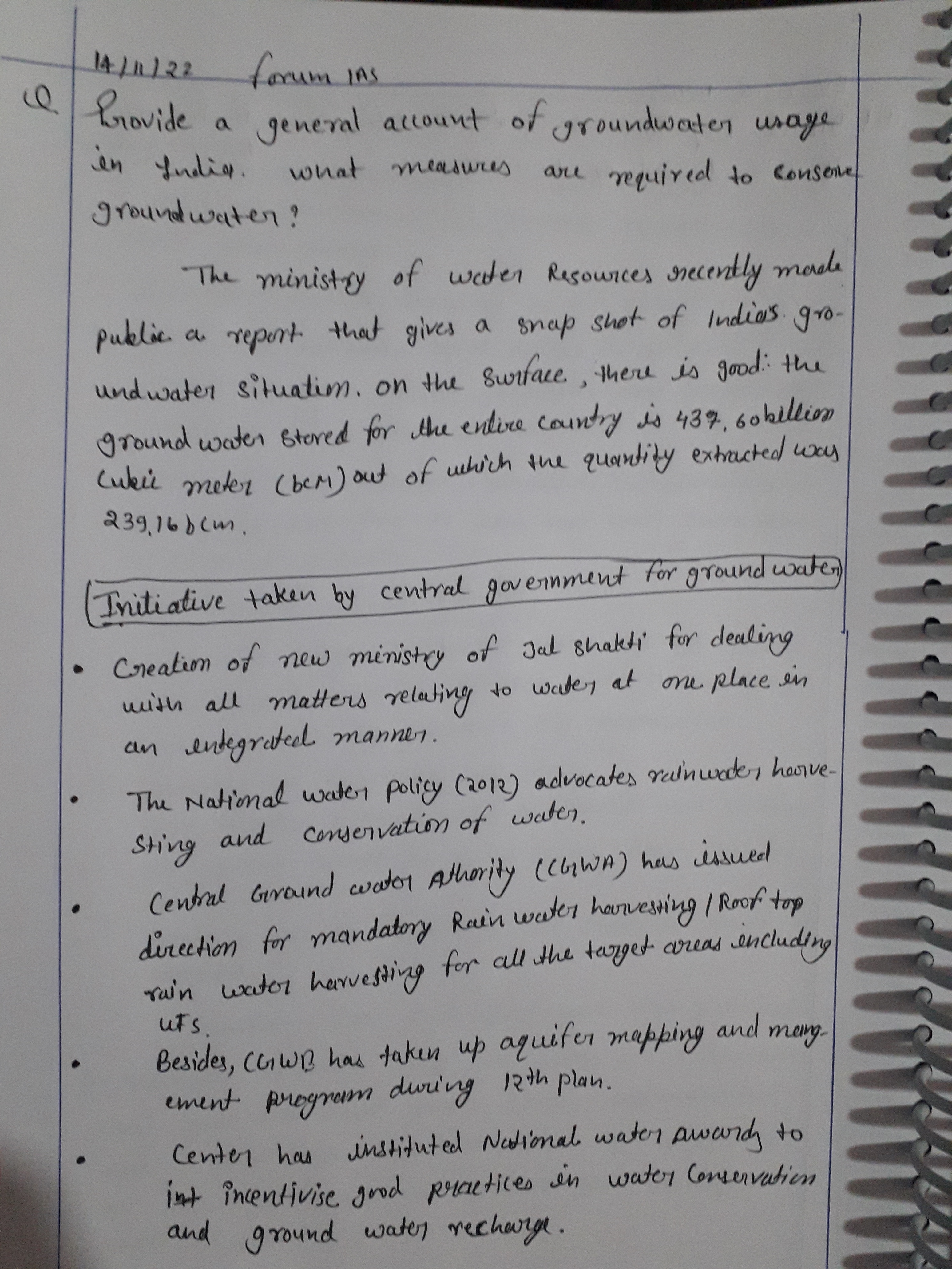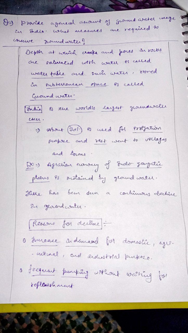 The introductory statement, please confirm the source of info once (groundwater accounting for 20-30% of water resources in India). Question is about groundwater, so don’t mention hydel power (it is surface water). In measures, include steps like judicious use in agriculture, regulation of groundwater extraction through law etc.
