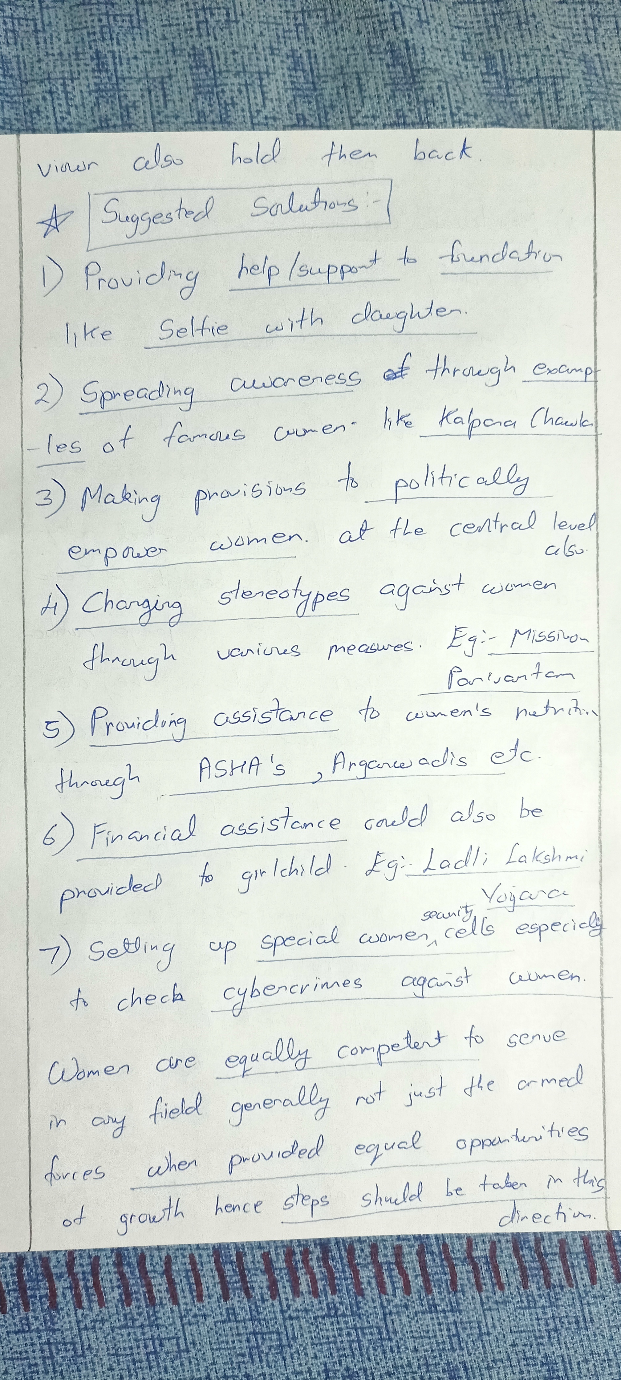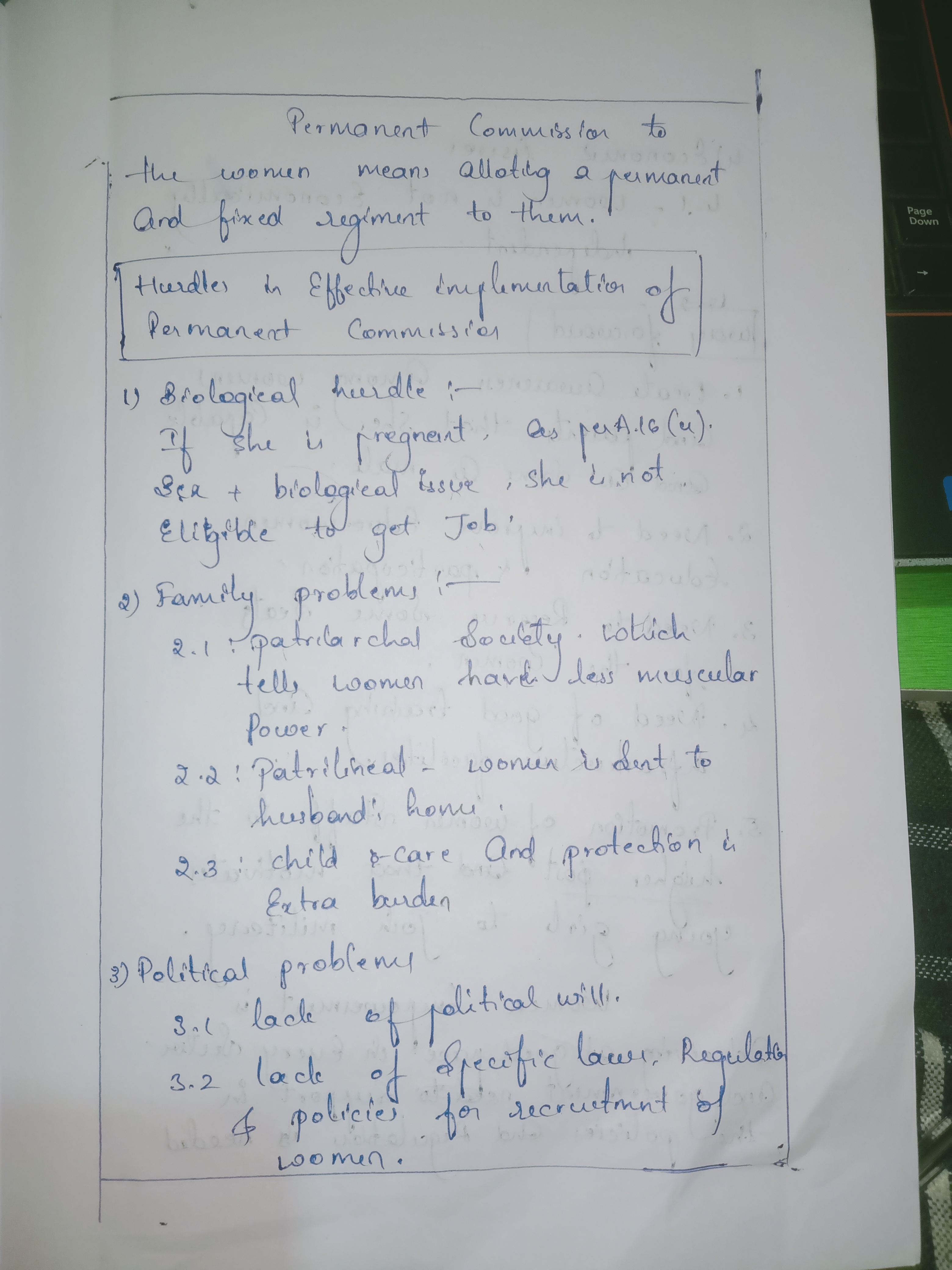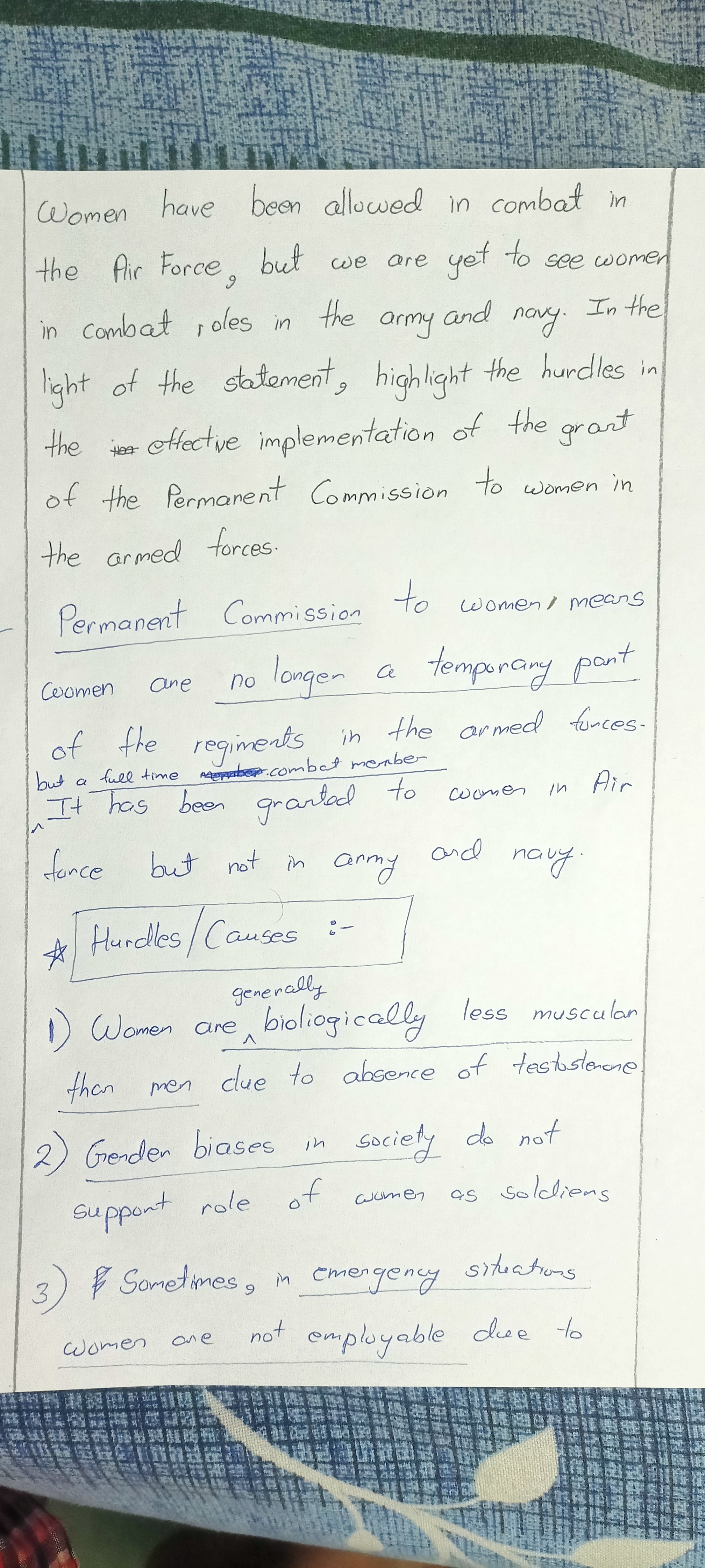 2) Women have been allowed in combat in the Air Force, but we are yet to see women in combat roles in the army and navy. In the light of the statement, highlight the hurdles in the effective implementation of the grant of the Permanent Commission to women in the armed forces.