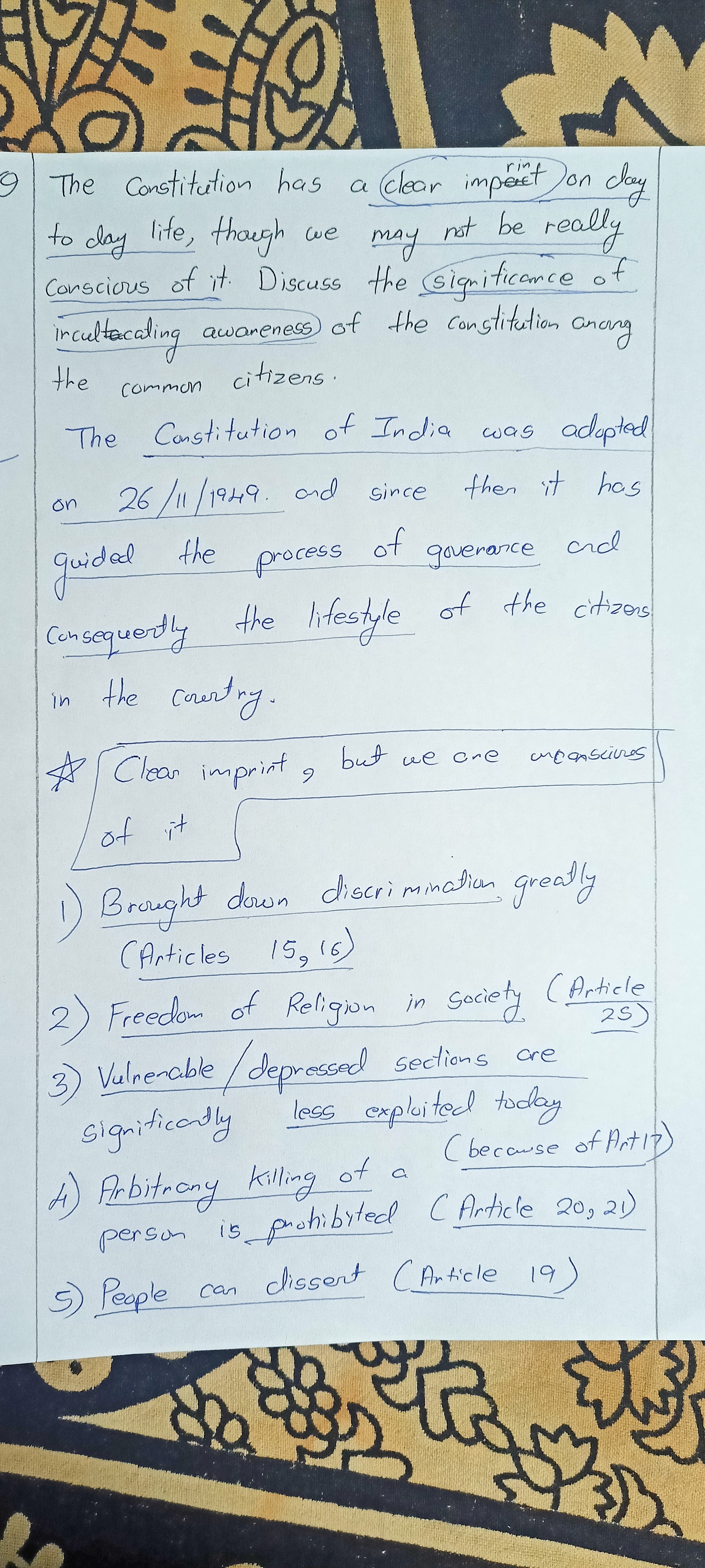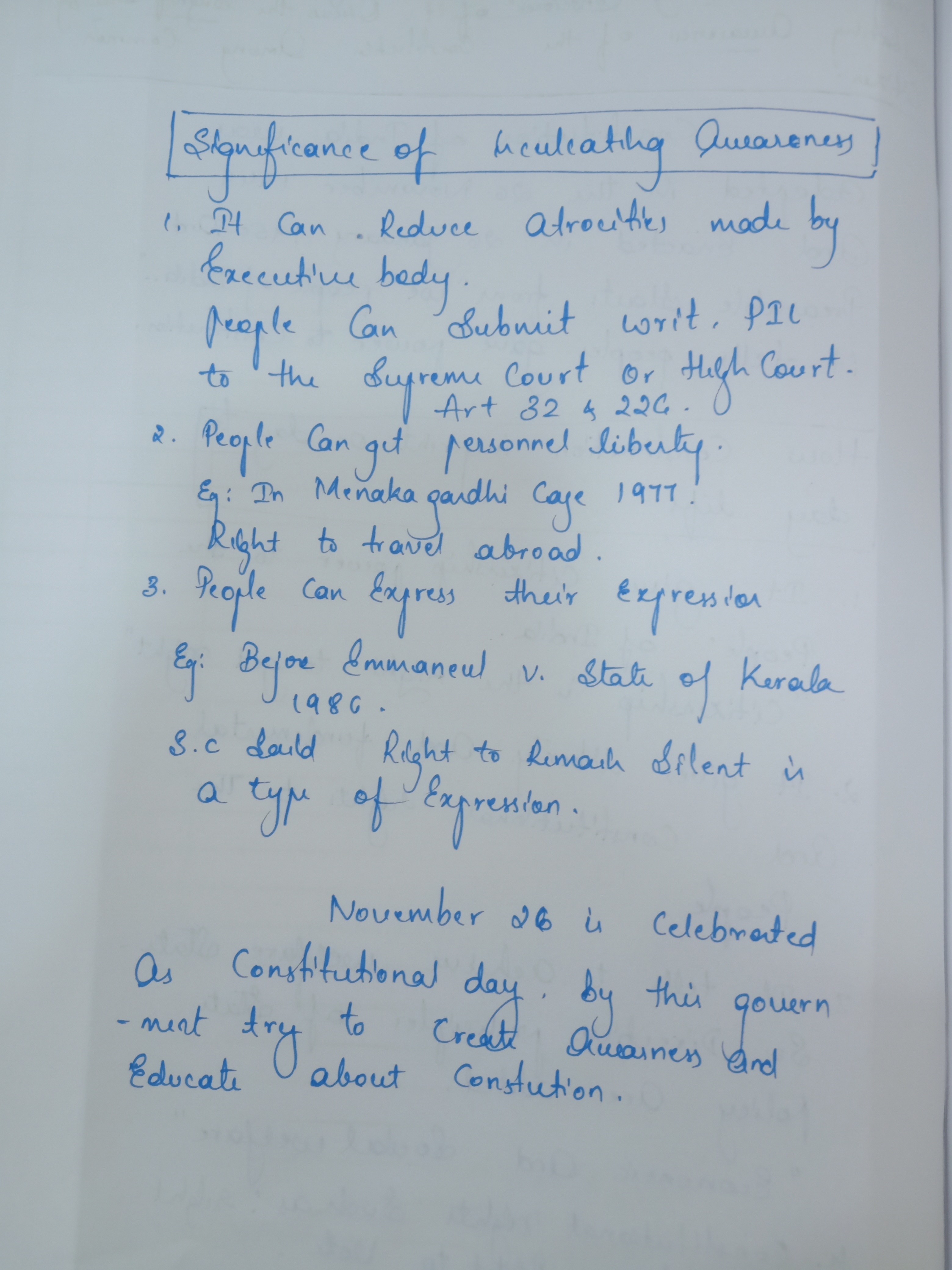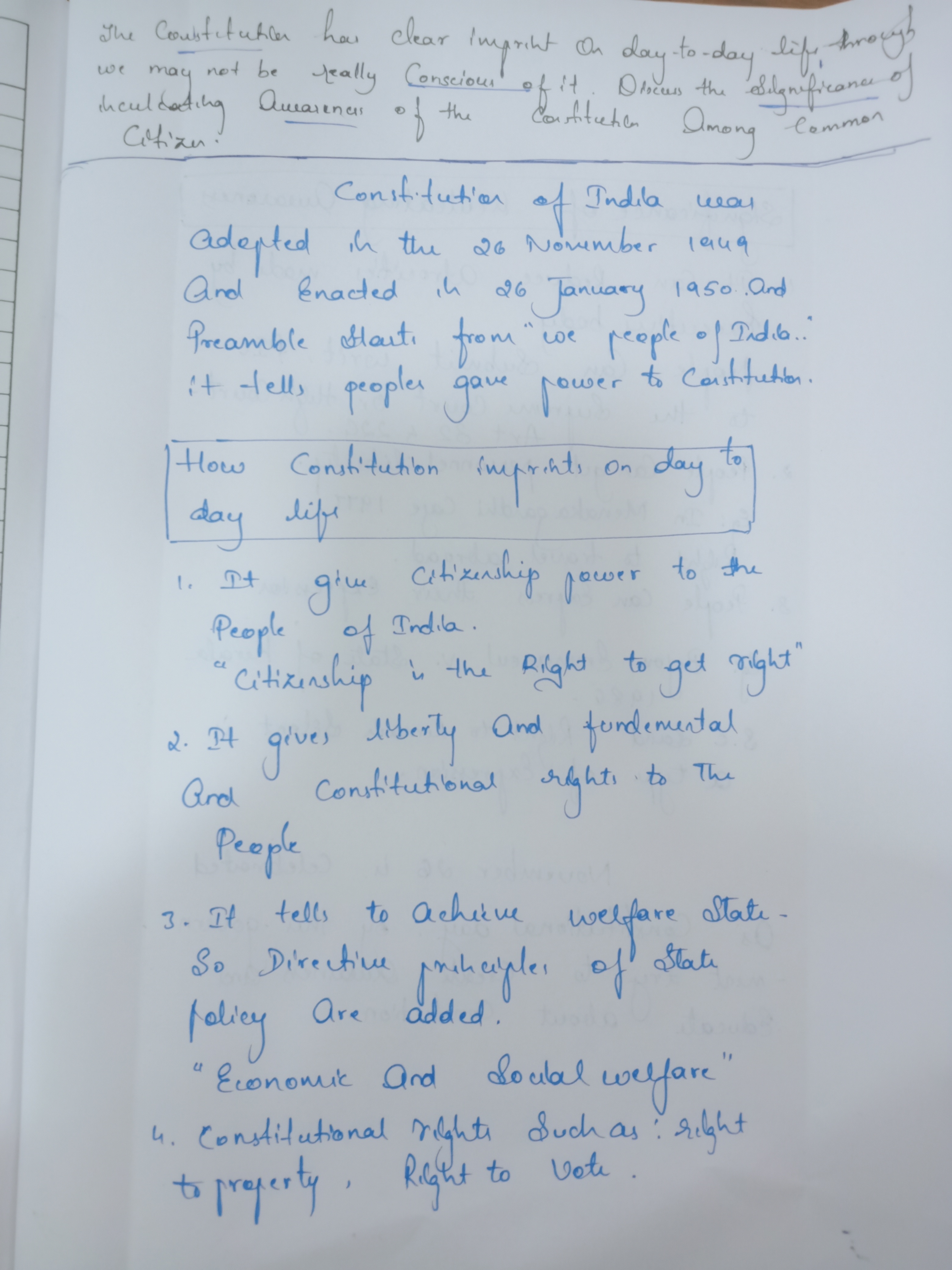 The Constitution has a clear imprint on day-to-day life, though we may not be really conscious of it. Discuss the Significance of inculcating awareness of the constitution among the common citizens.
