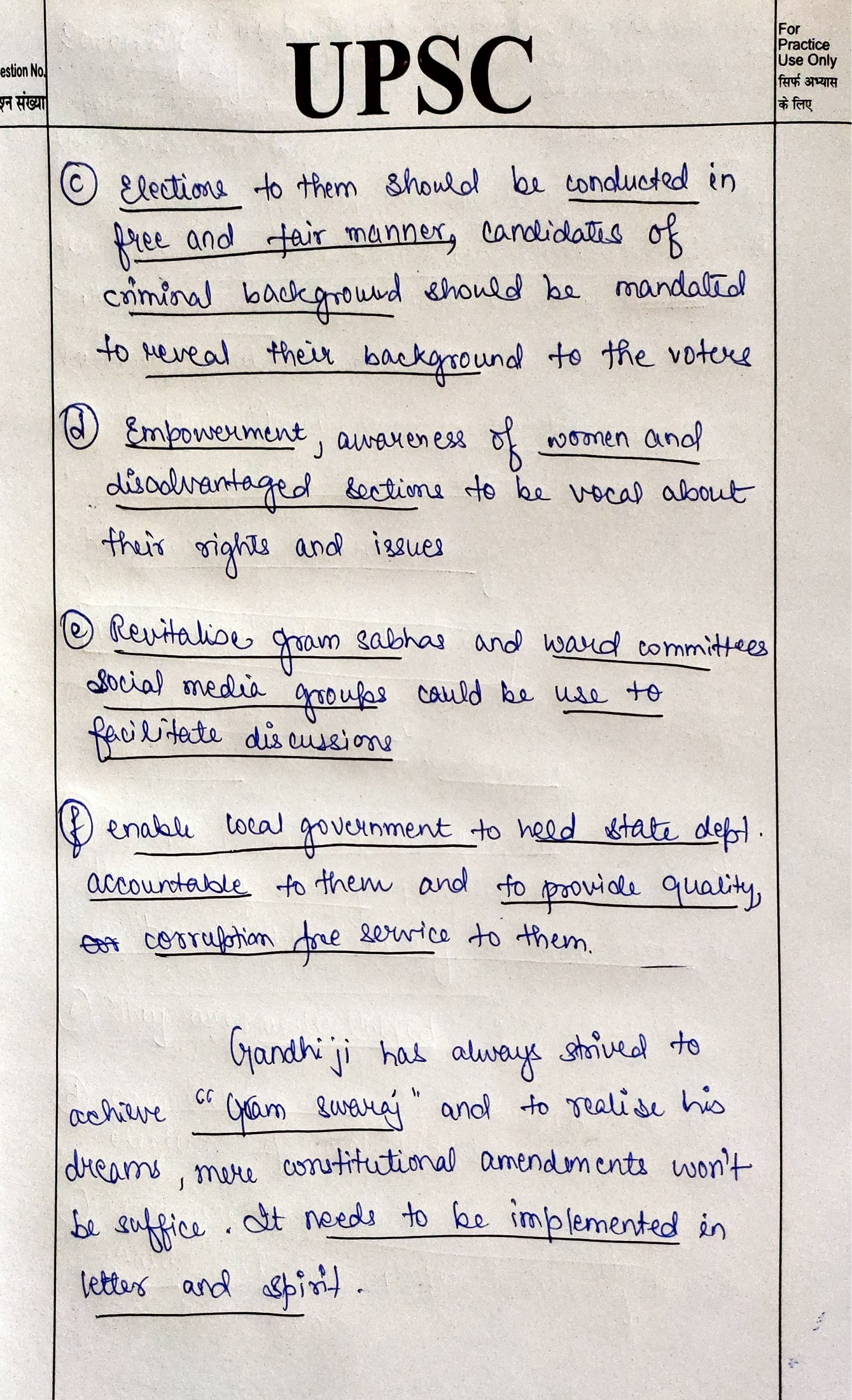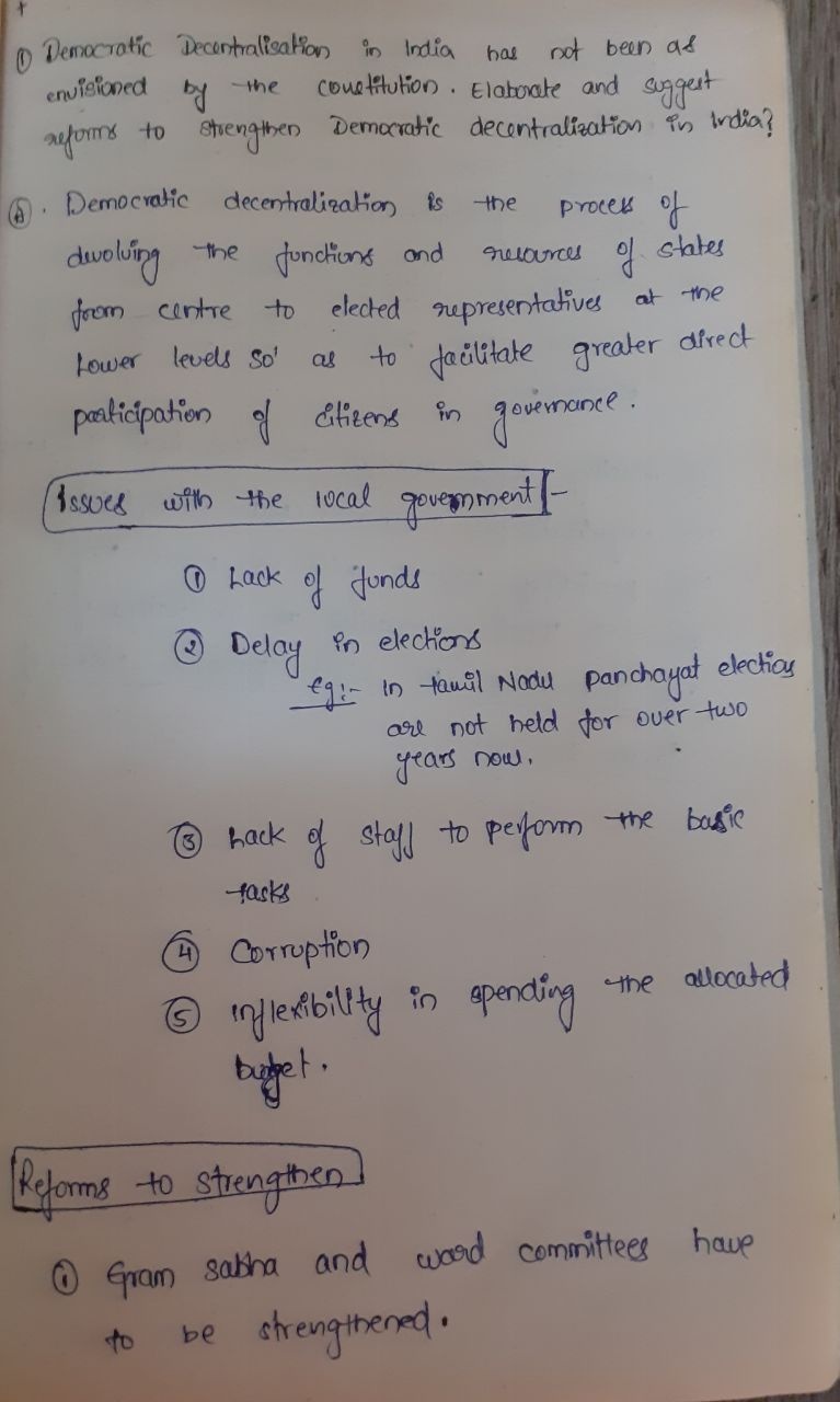 Democratic decentralization in India has not been as envisioned by the Constitution. Elaborate and suggest reforms to strengthen Democratic decentralization in India.
