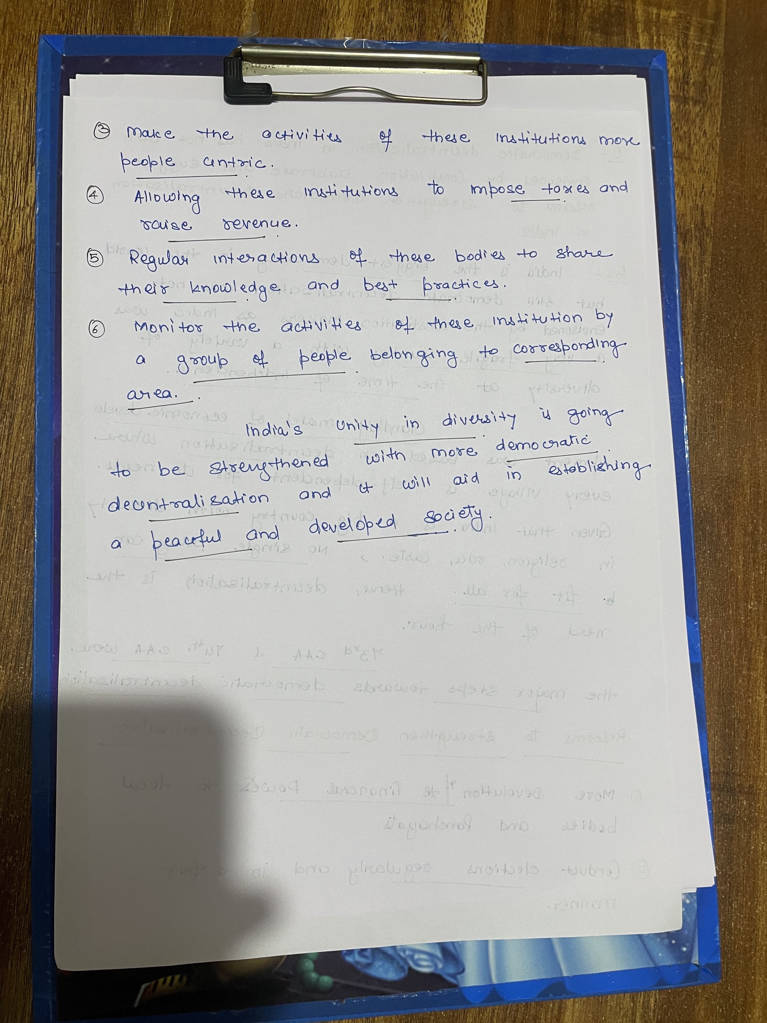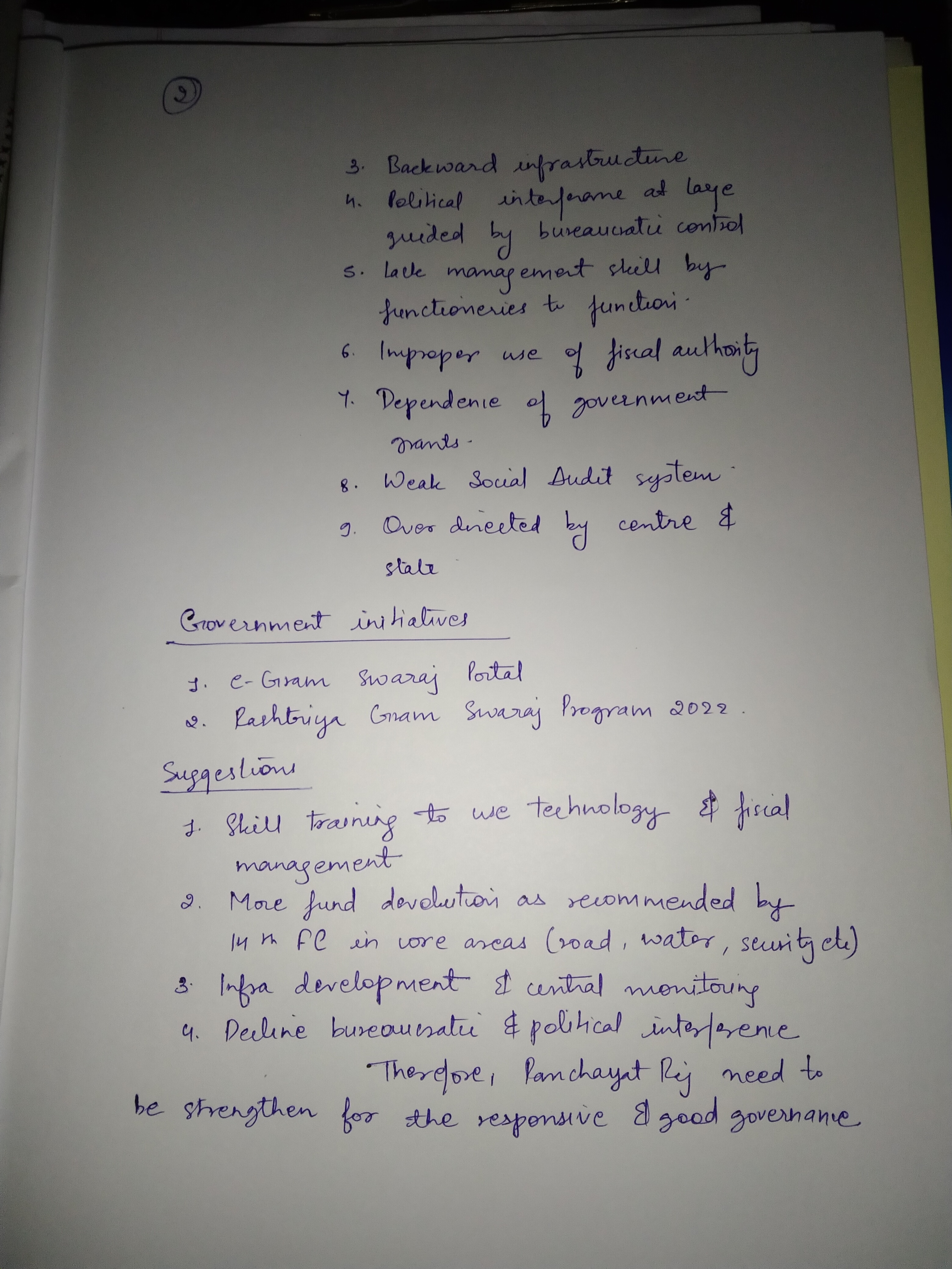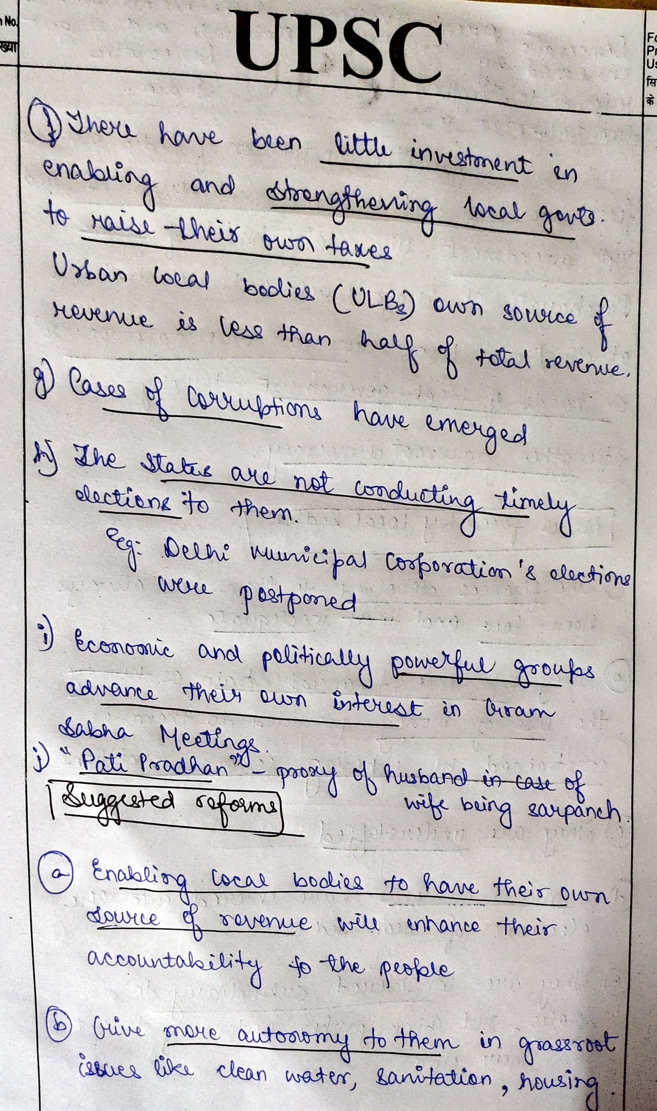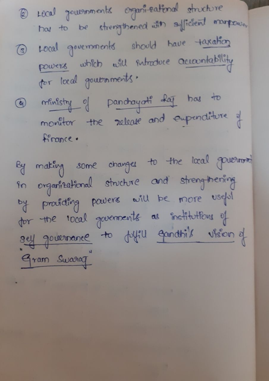 In issues, the aspect of lack of powers to decide on spending the funds can be added (it is top-driven). You can mention 11th/12th Schedules and some subjects on which local bodies can be given taxation powers etc.