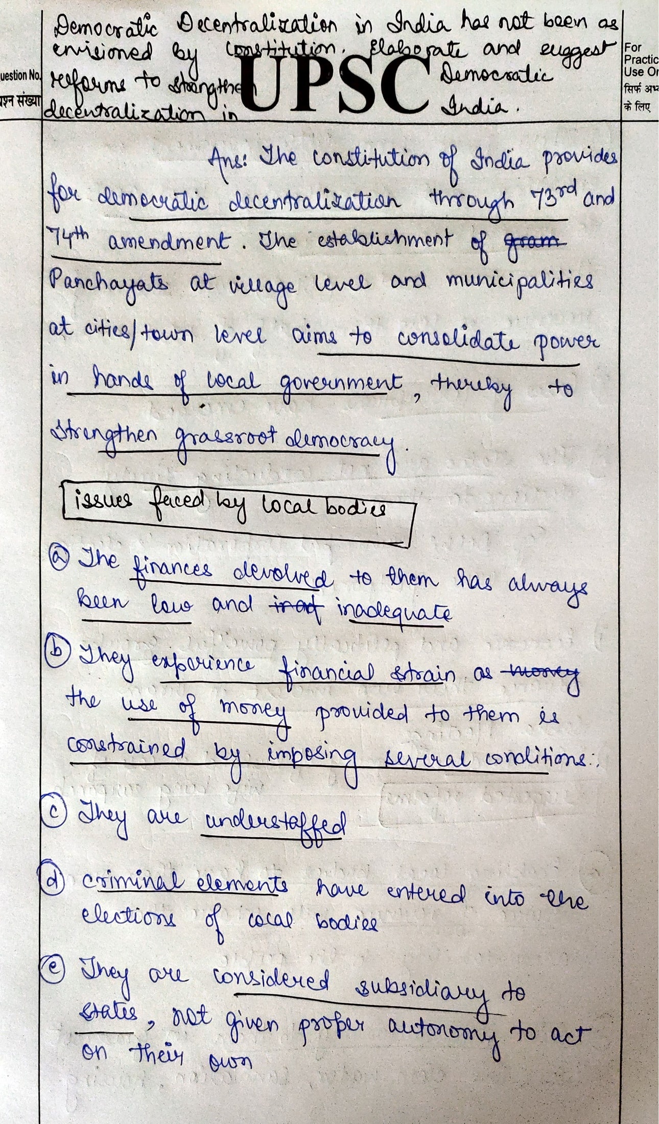 Great answer! You can classify the issues under the headings of Funds/Functions/Functionaries. Also mention that staff is not trained enough to undertake functions. Mention some subjects under 11th and 12th Schedule to be devolved.