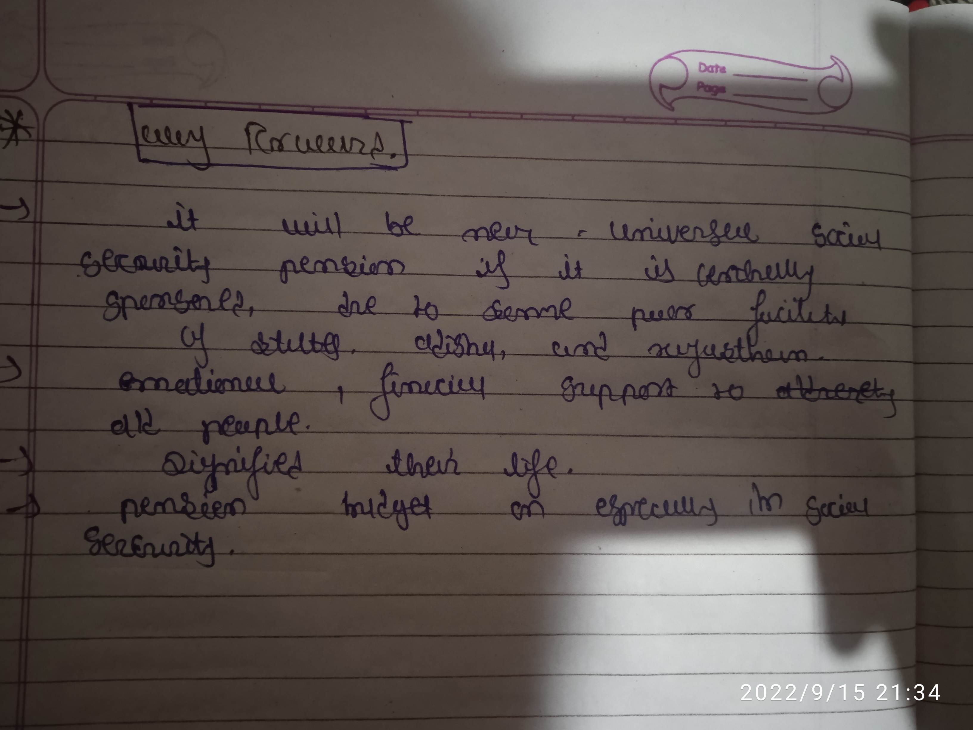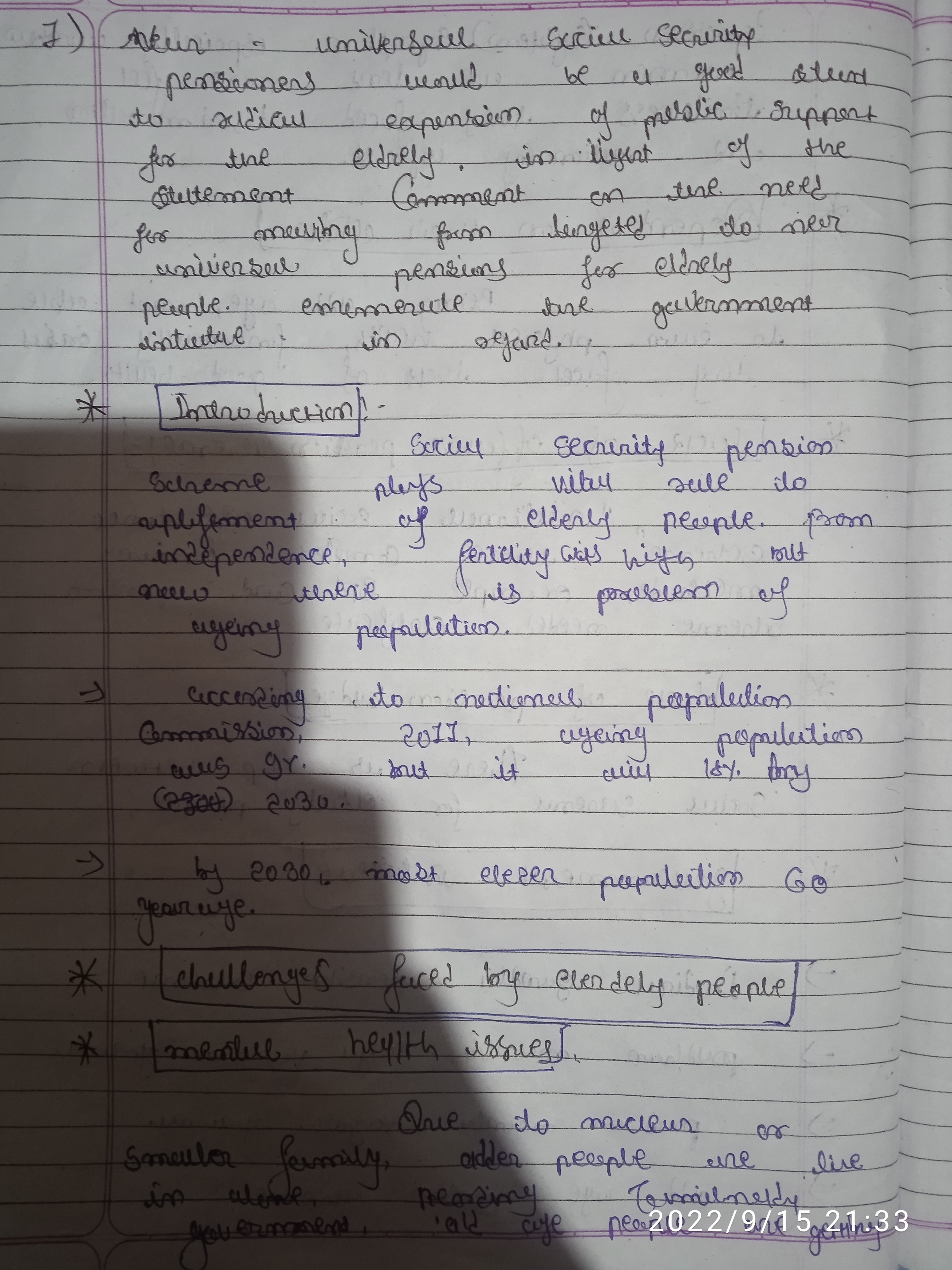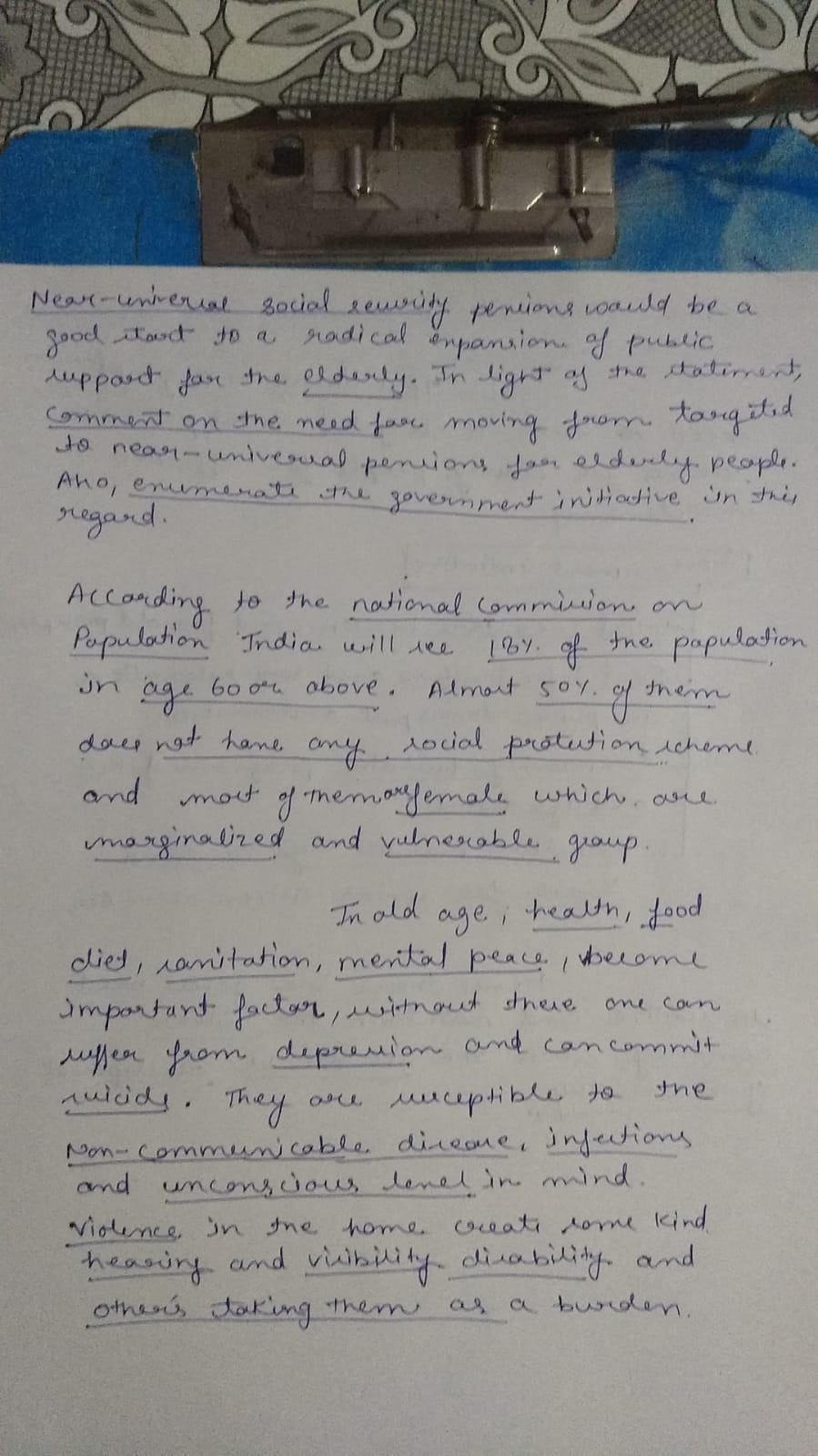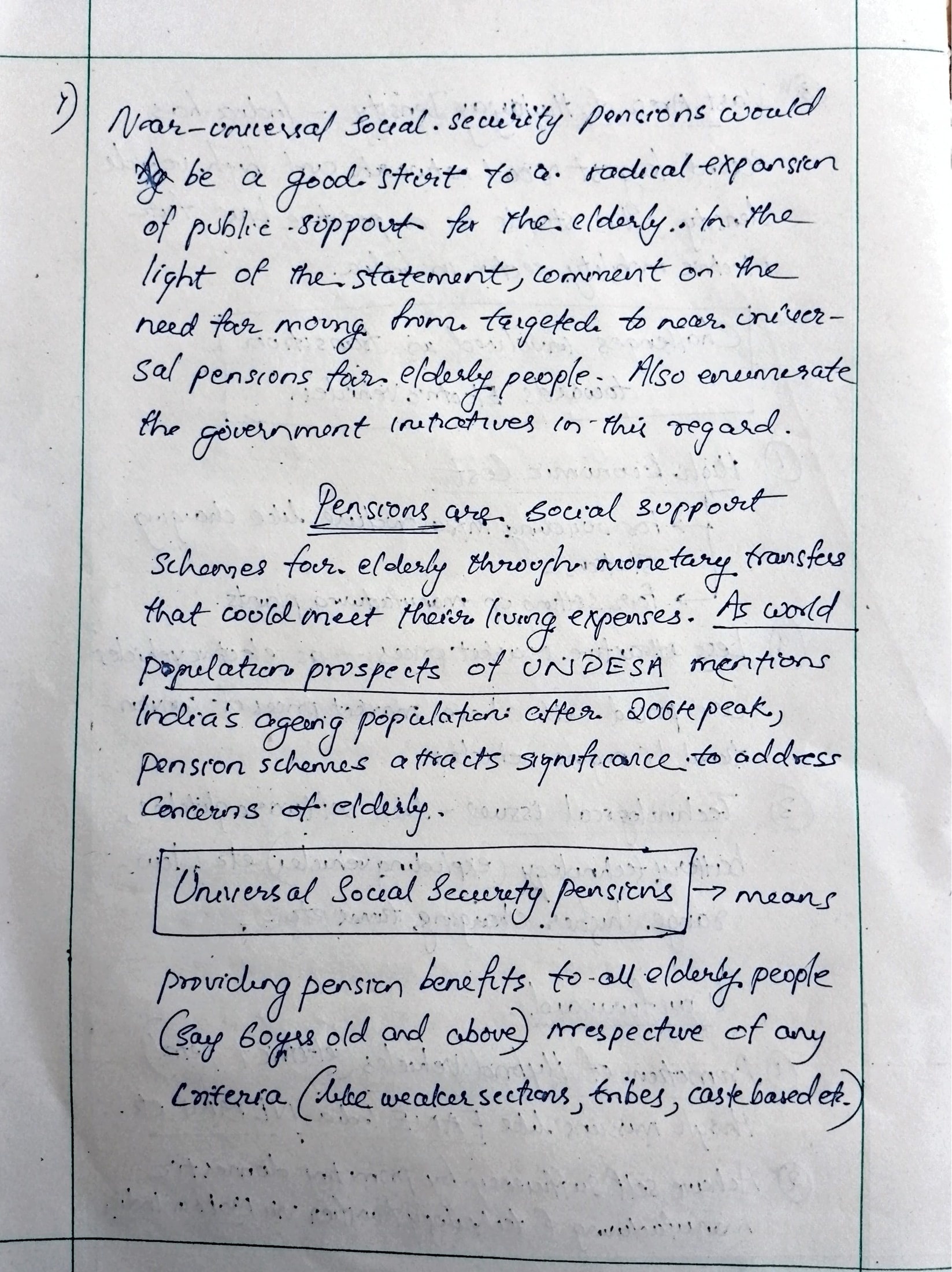 1) Near-universal social security pensions would be a good start to a radical expansion of public support for the elderly. In light of the statement, comment on the need for moving from targeted to near-universal pensions for elderly people. Also, enumerate the government initiatives in this regard.