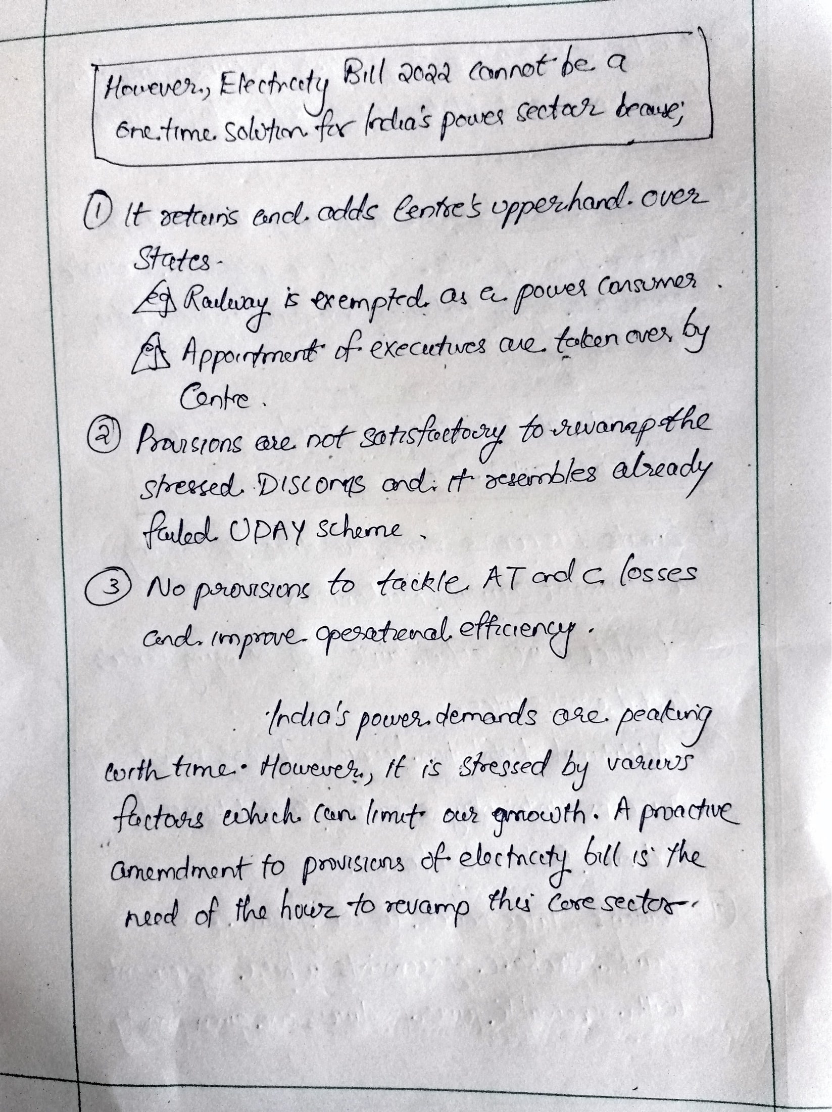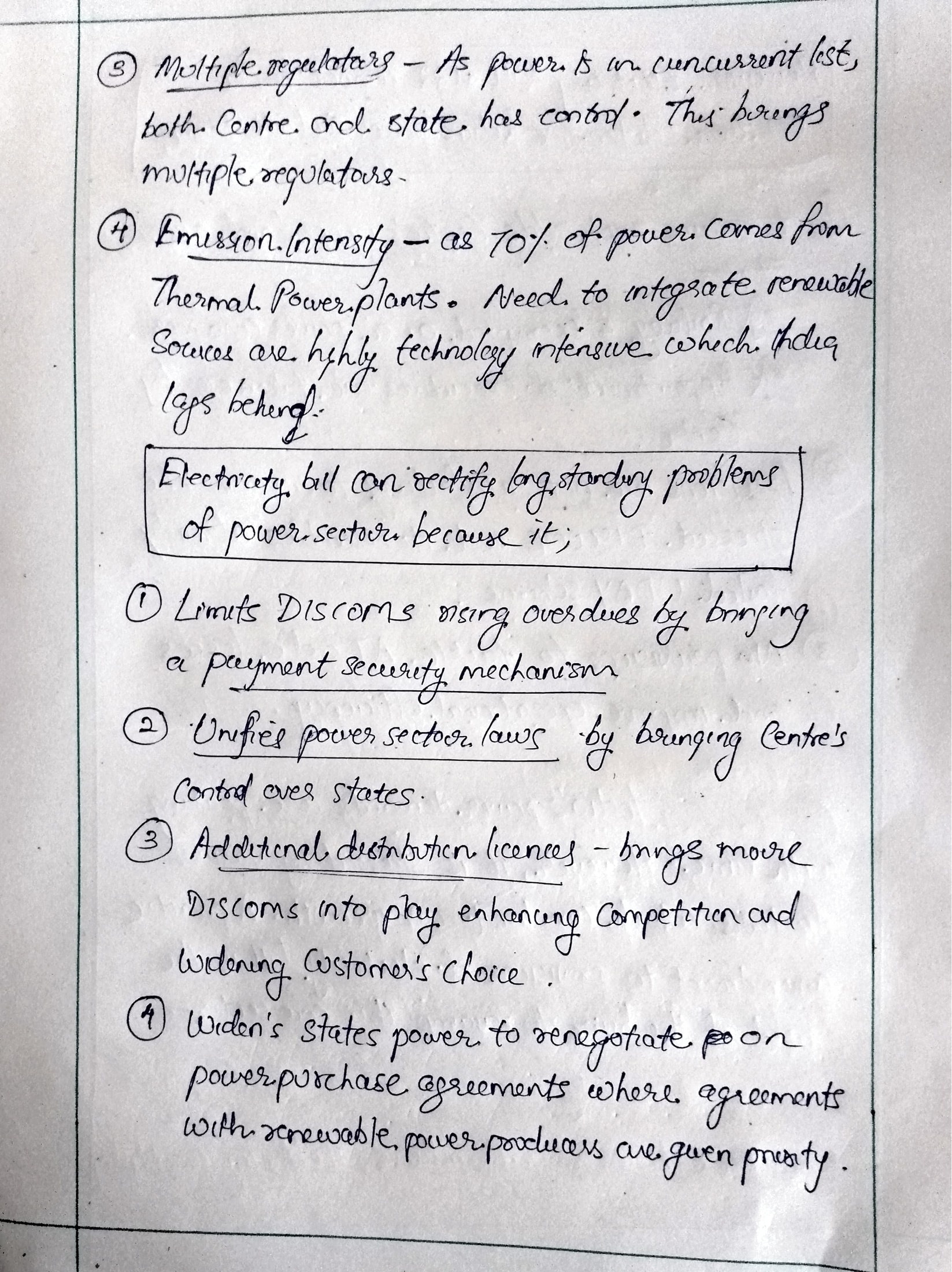 Great answer! You can elaborate the DISCOM issue a bit as it is the biggest concern in the sector. Highlight that poor financial status of discoms has a cascading effect up the chain (producer and then Coal India). You can skip the point of emission intensity here. Electricity Act mostly deals with regulatory regime I think, Govt. is taking care of sustainability through Energy Conservation Act.