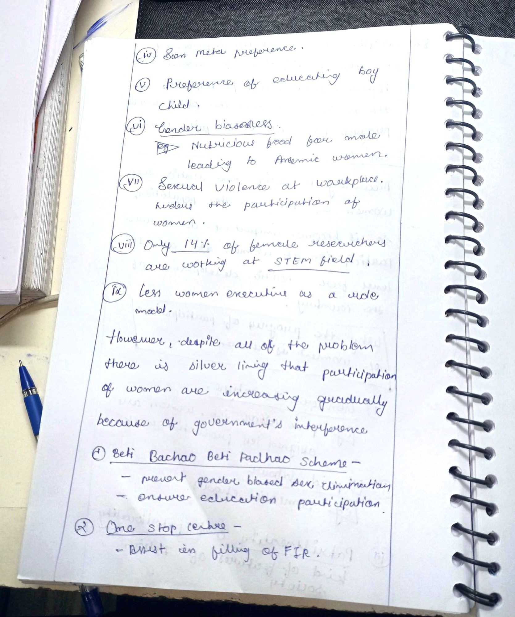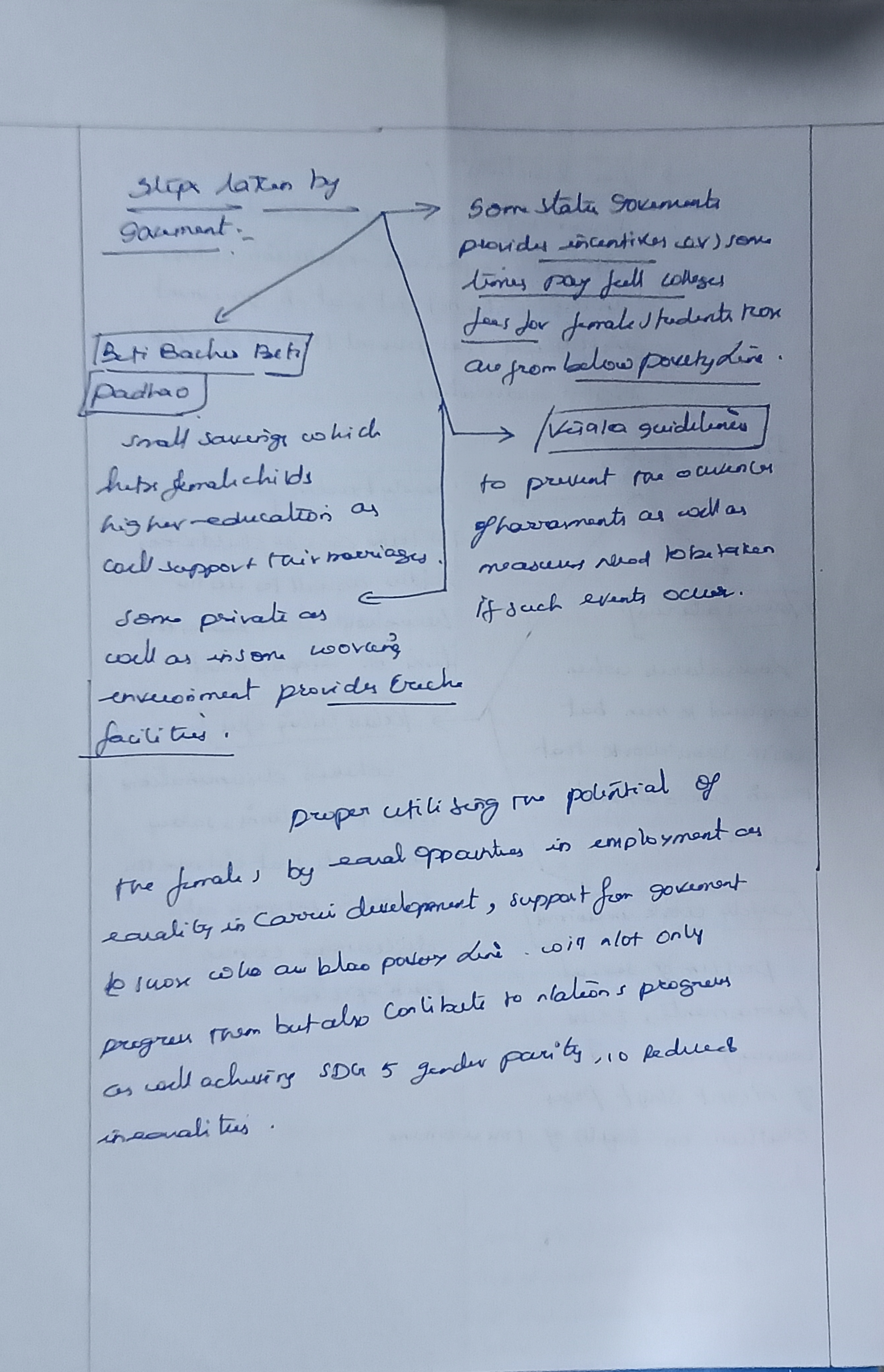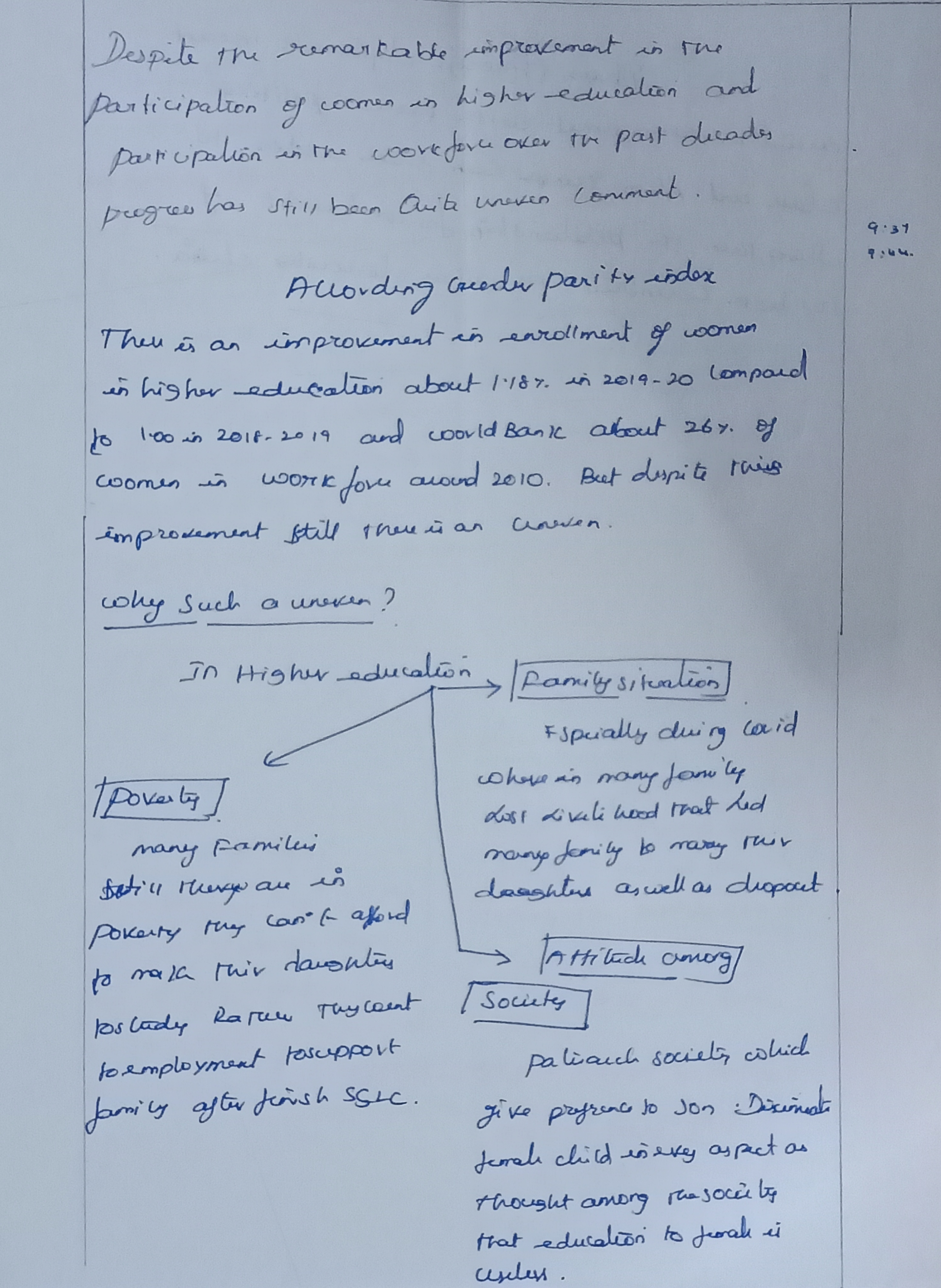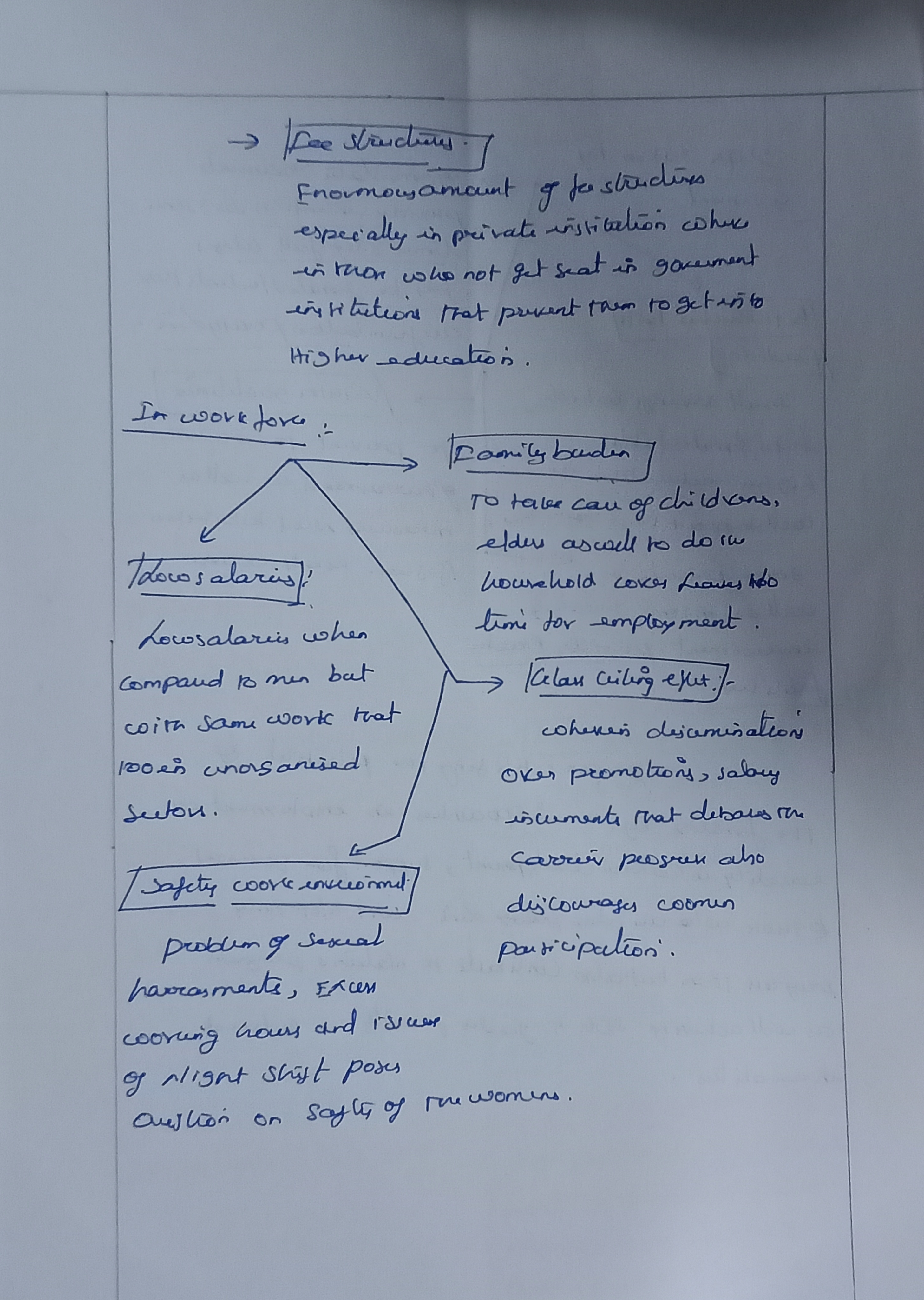 Also (unequal) family responsibility can be an independent point which affects both access to education and career participation ( i.e., don’t mention it under low enrolment, it impacts career as well).