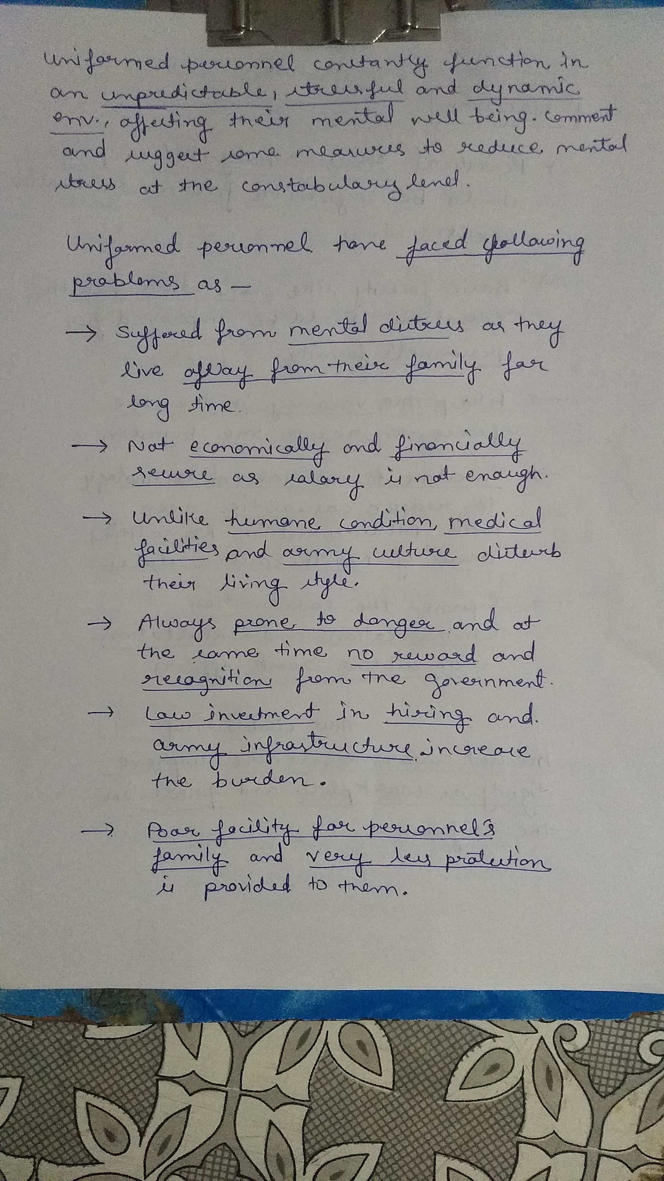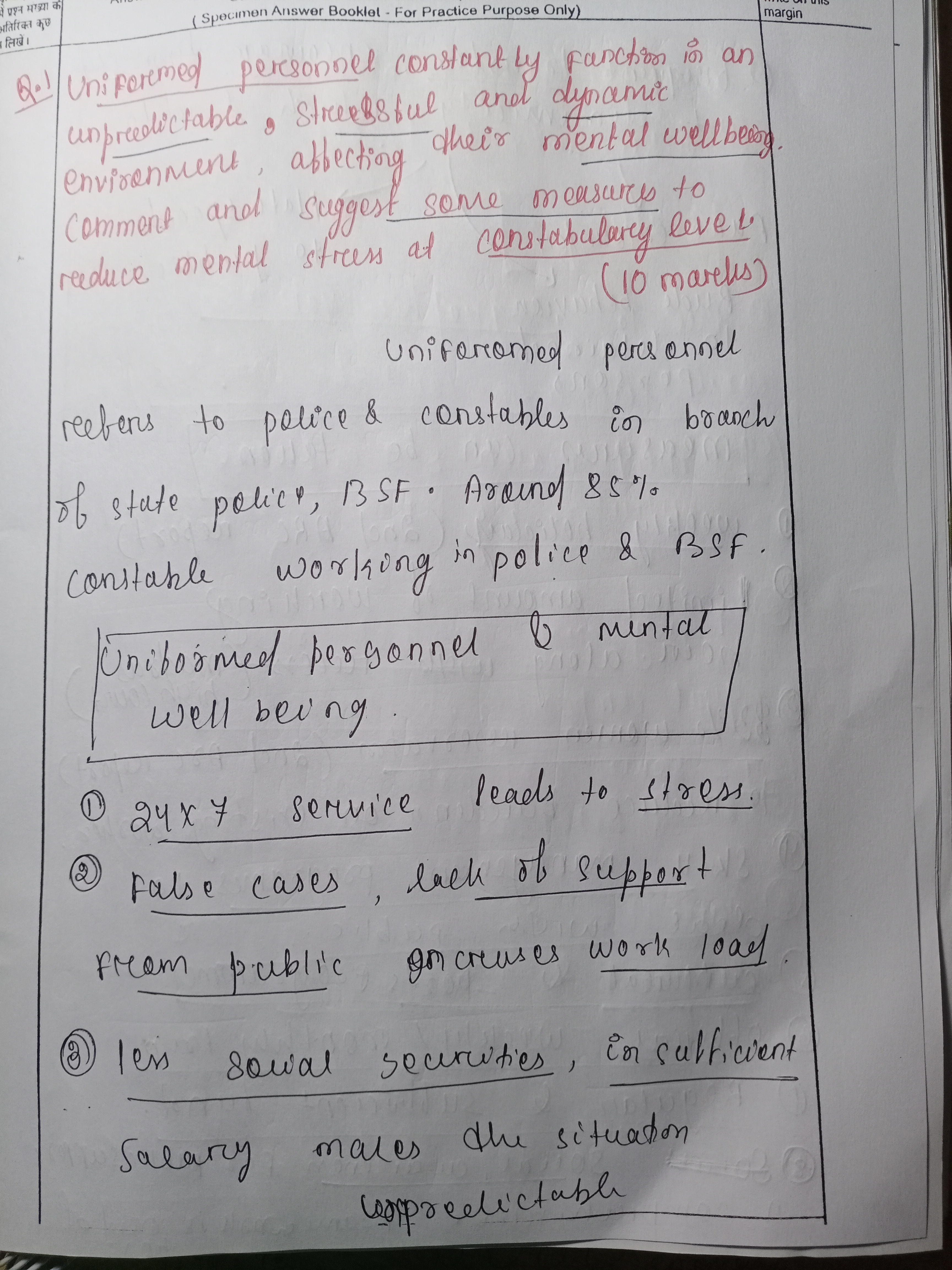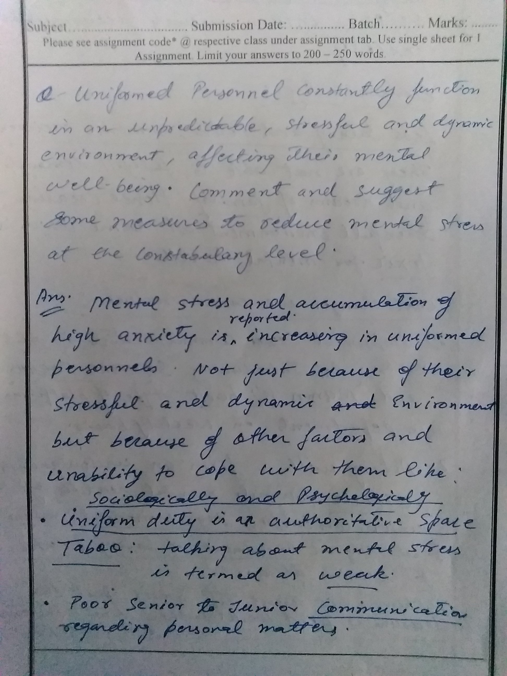 1) Uniformed personnel constantly function in an unpredictable, stressful and dynamic environment, affecting their mental well-being. Comment and suggest some measures to reduce mental stress at the constabulary level.