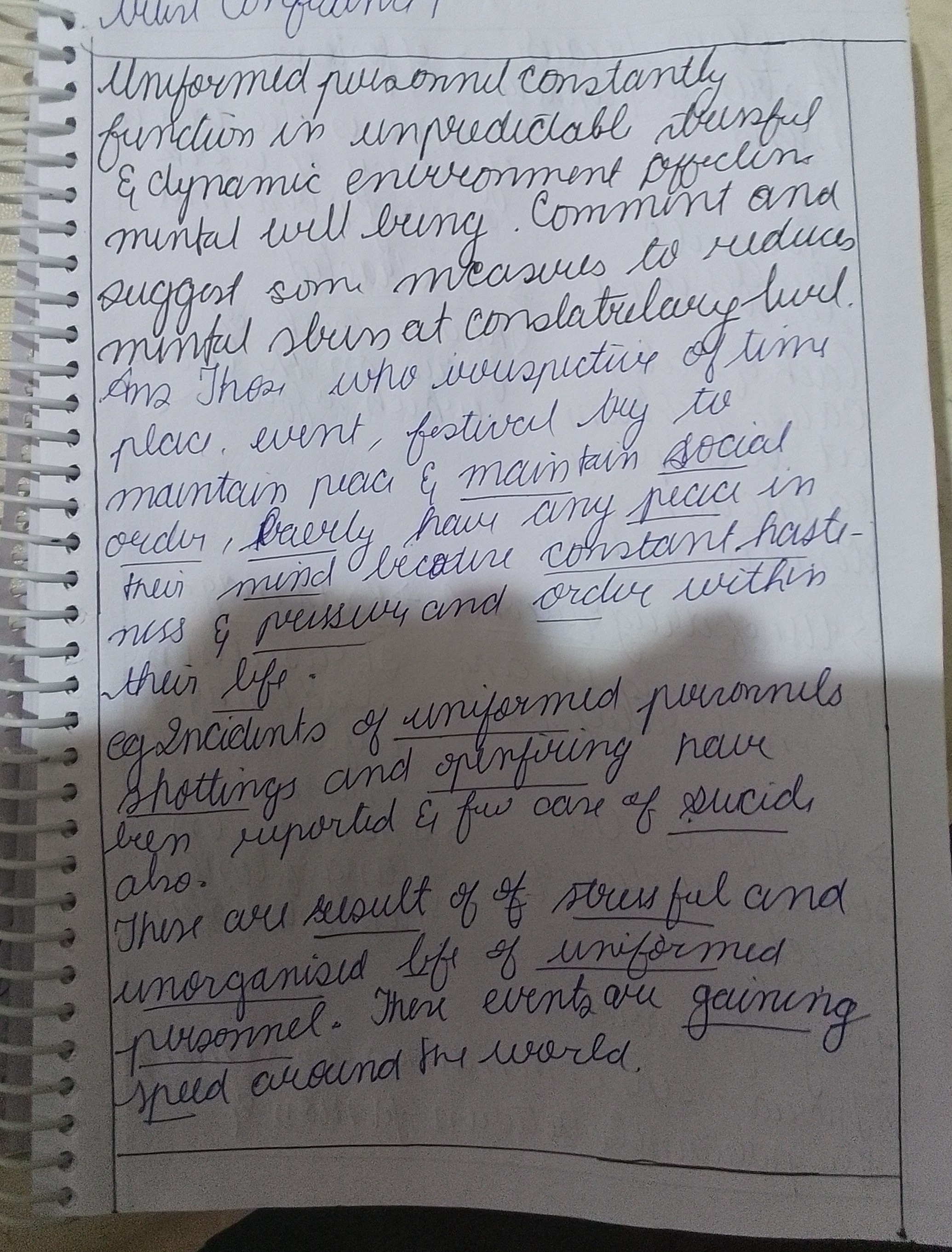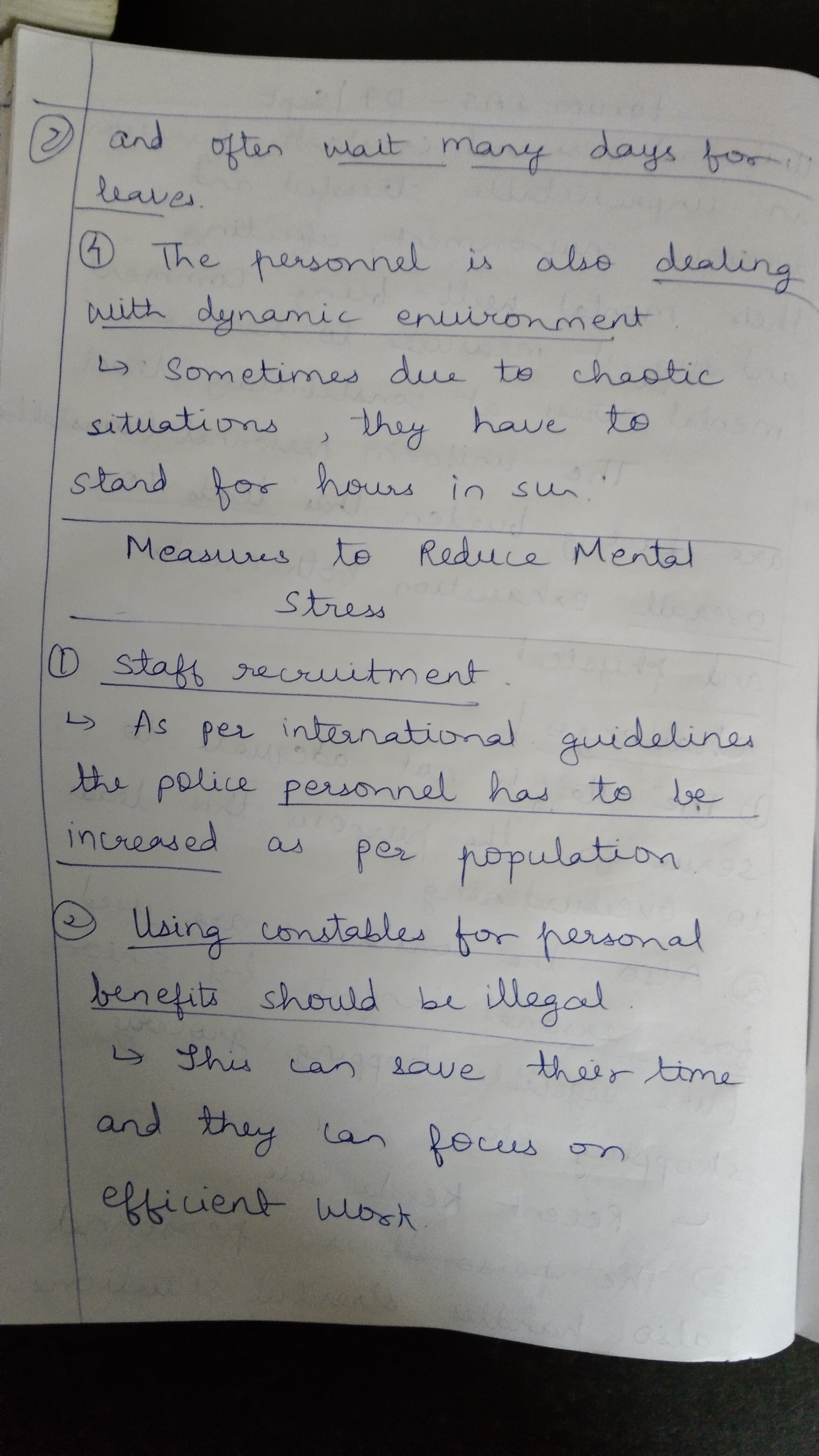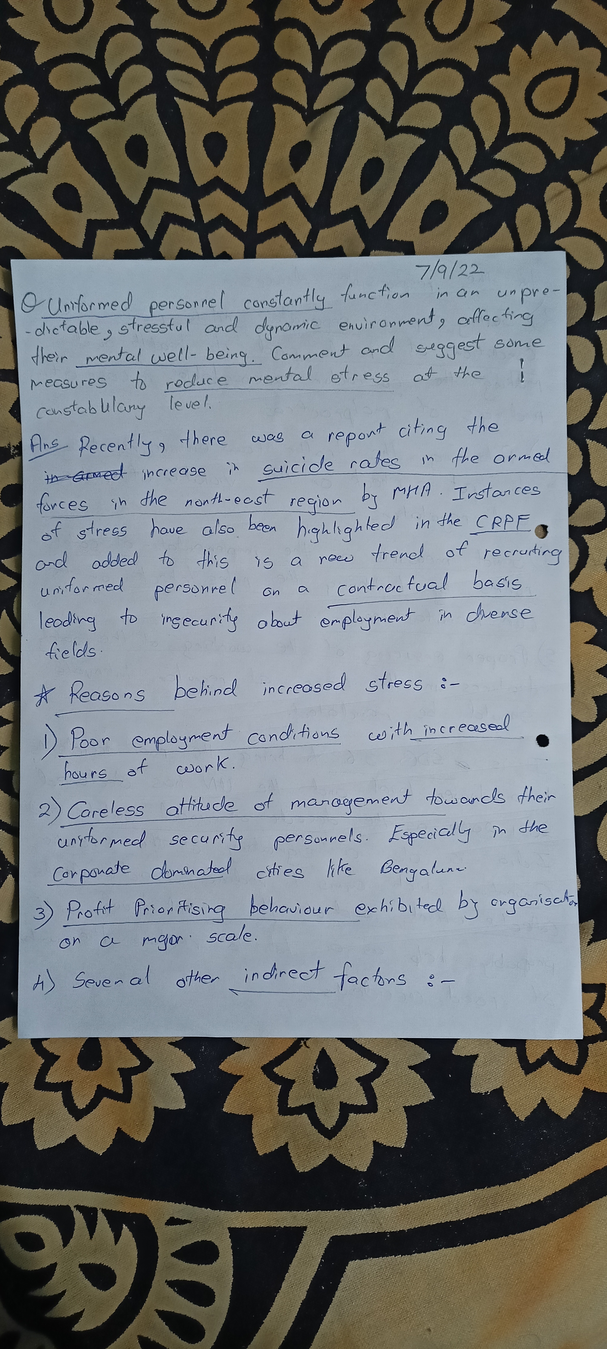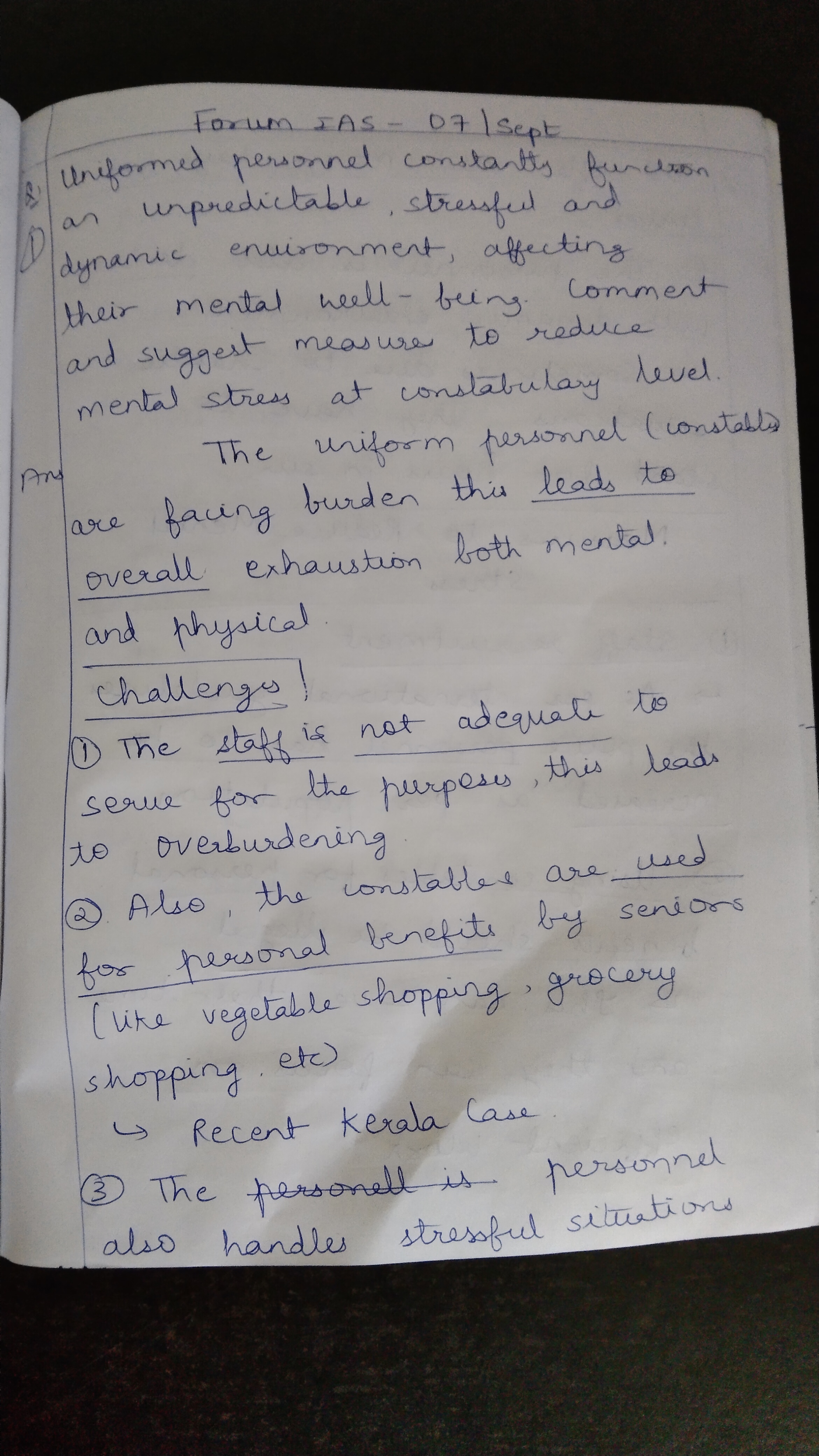 1) Uniformed personnel constantly function in an unpredictable, stressful and dynamic environment, affecting their mental well-being. Comment and suggest some measures to reduce mental stress at the constabulary level.