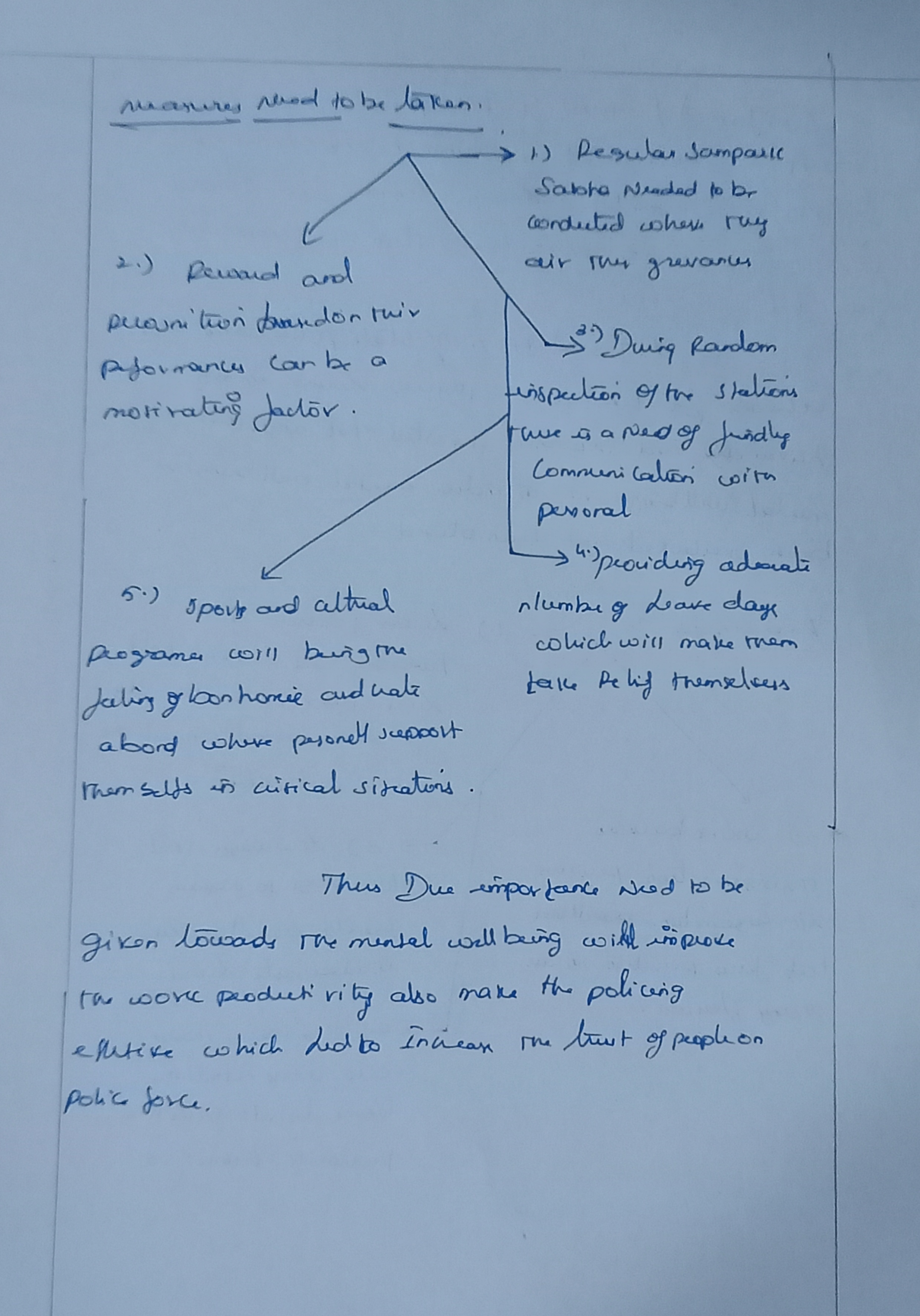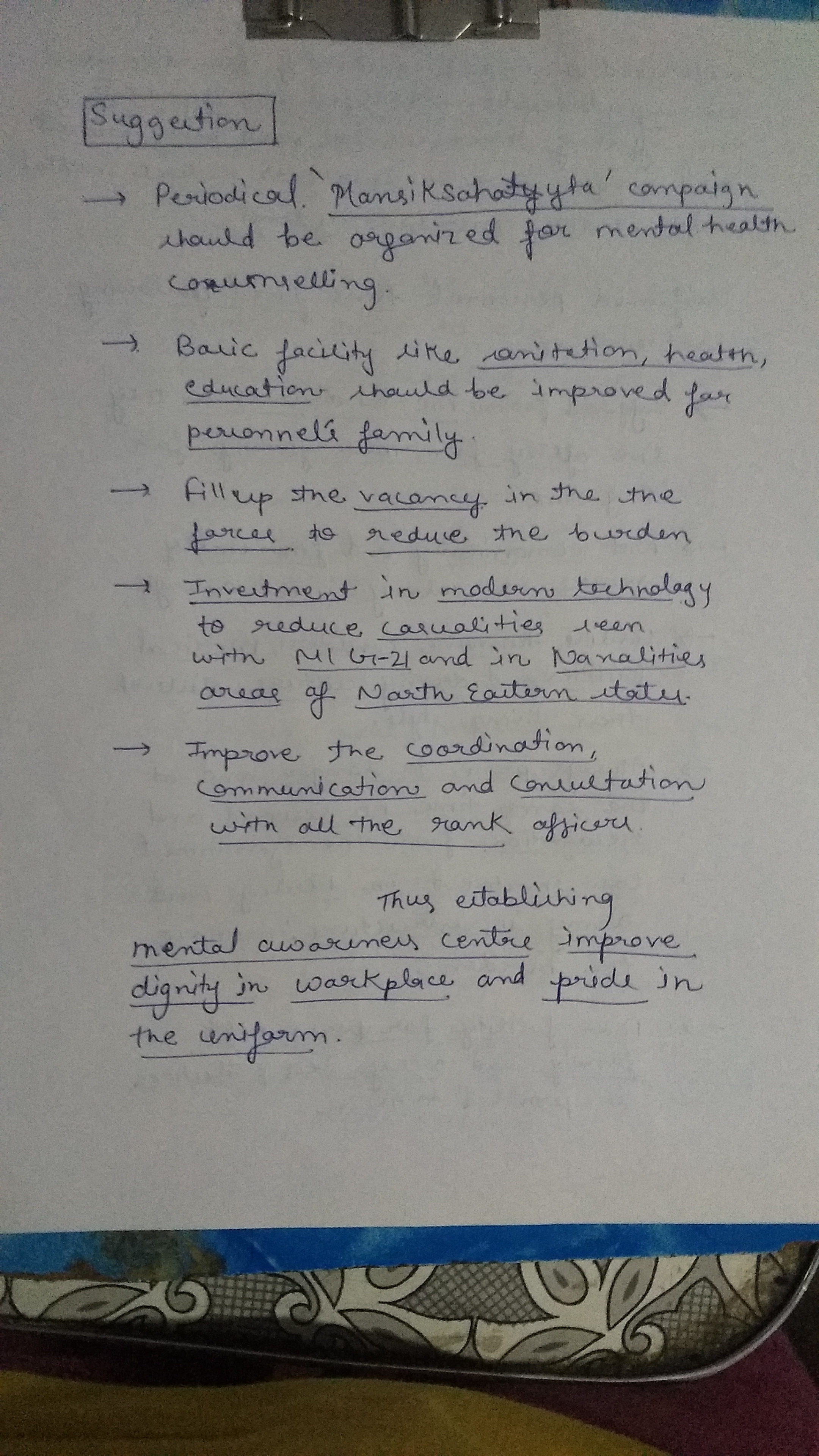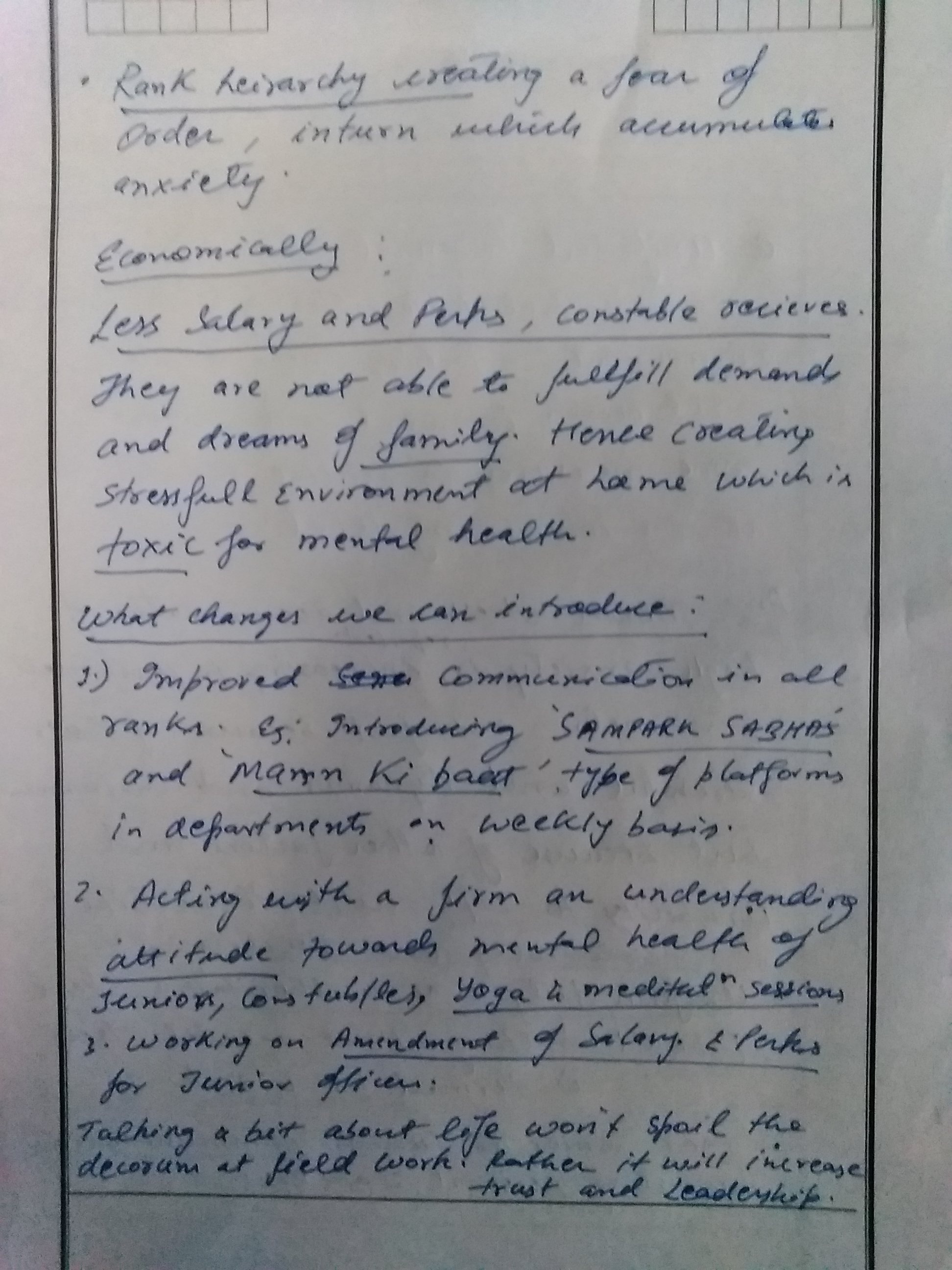 – You can classify the suggestions under separate heads like (a) Improving work conditions: Provisions of regular leave, Emoluments like insurance, extra compensation for extra hours put on duty; (b) Addressing Mental Health: Regular Yoga, Meditation sessions, Helpline numbers to reach out in case of stress etc.