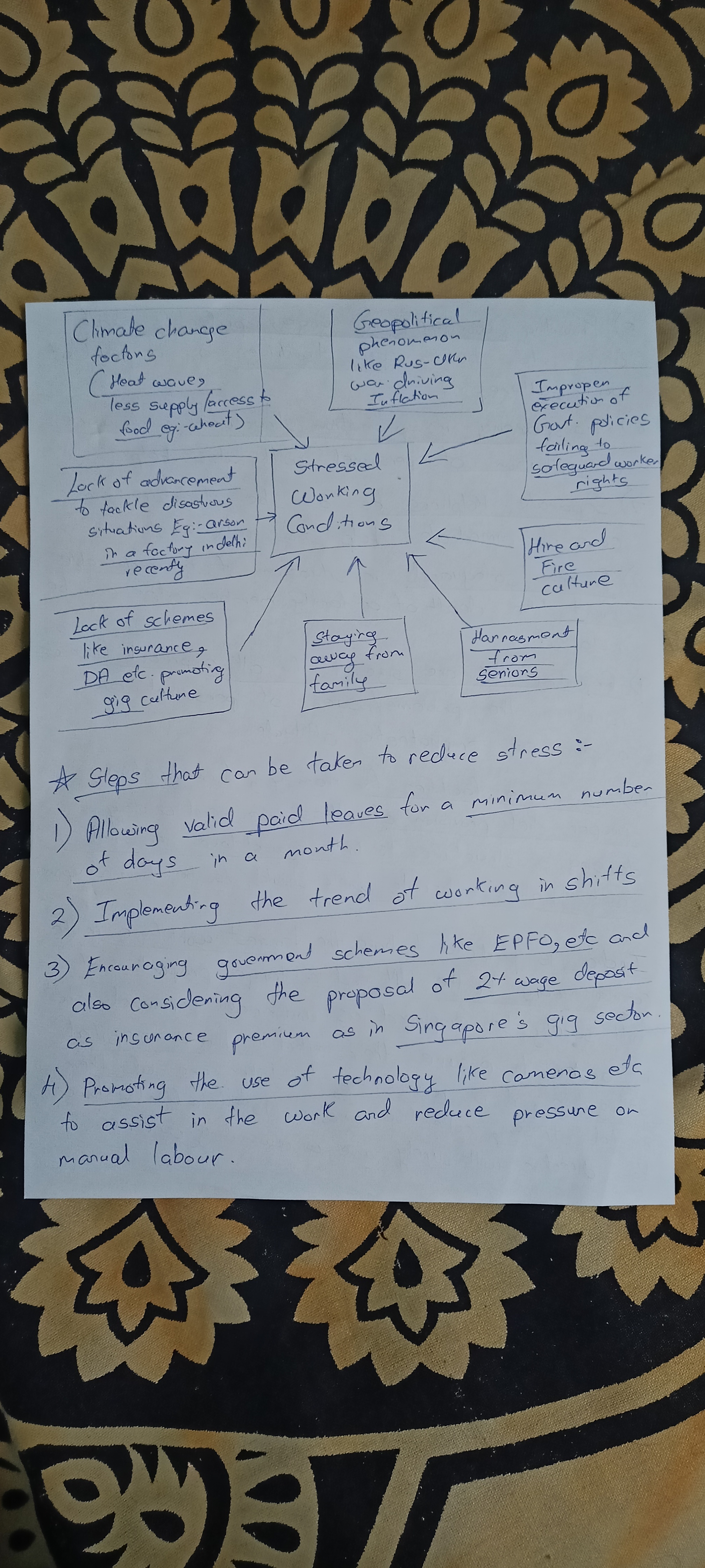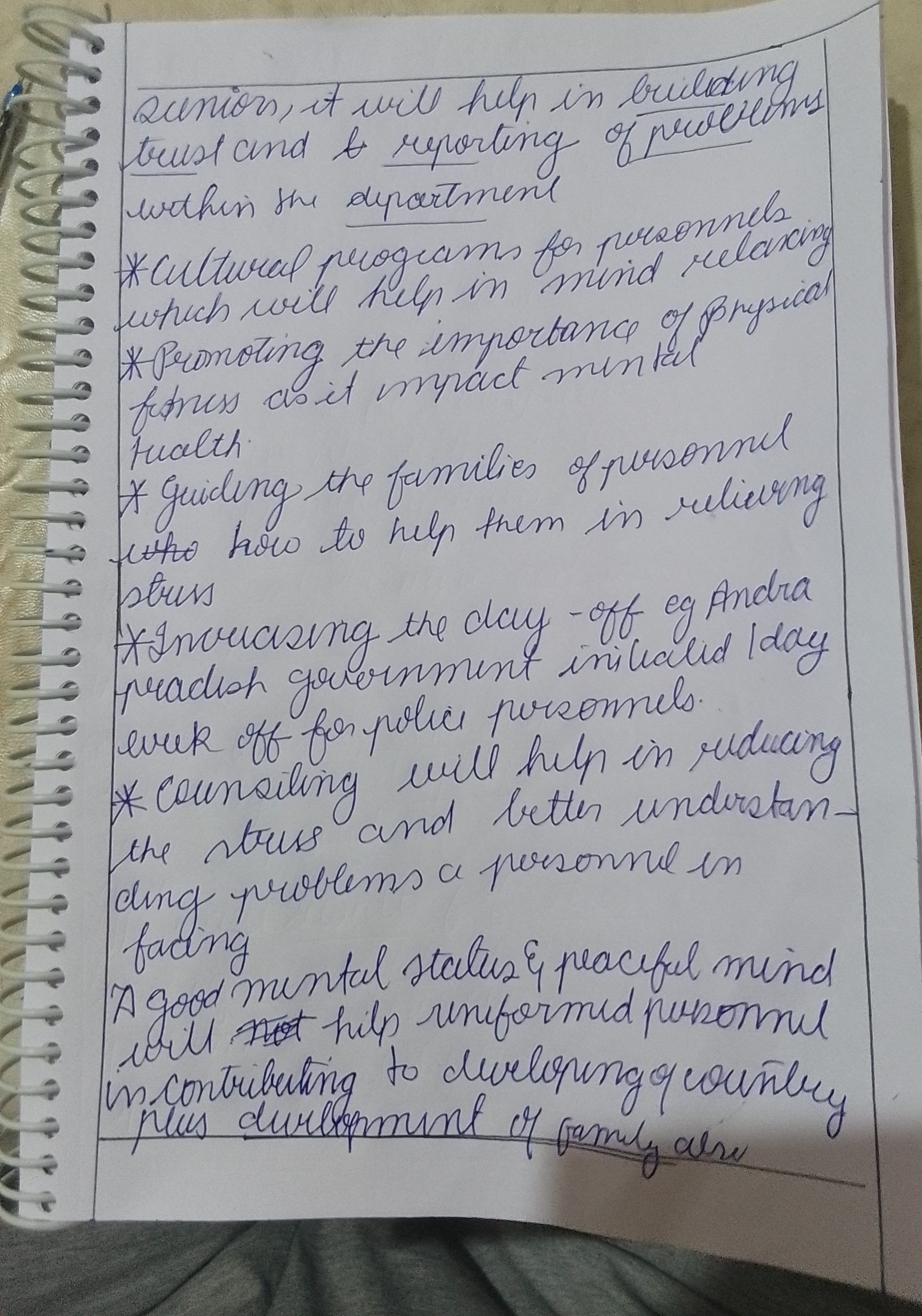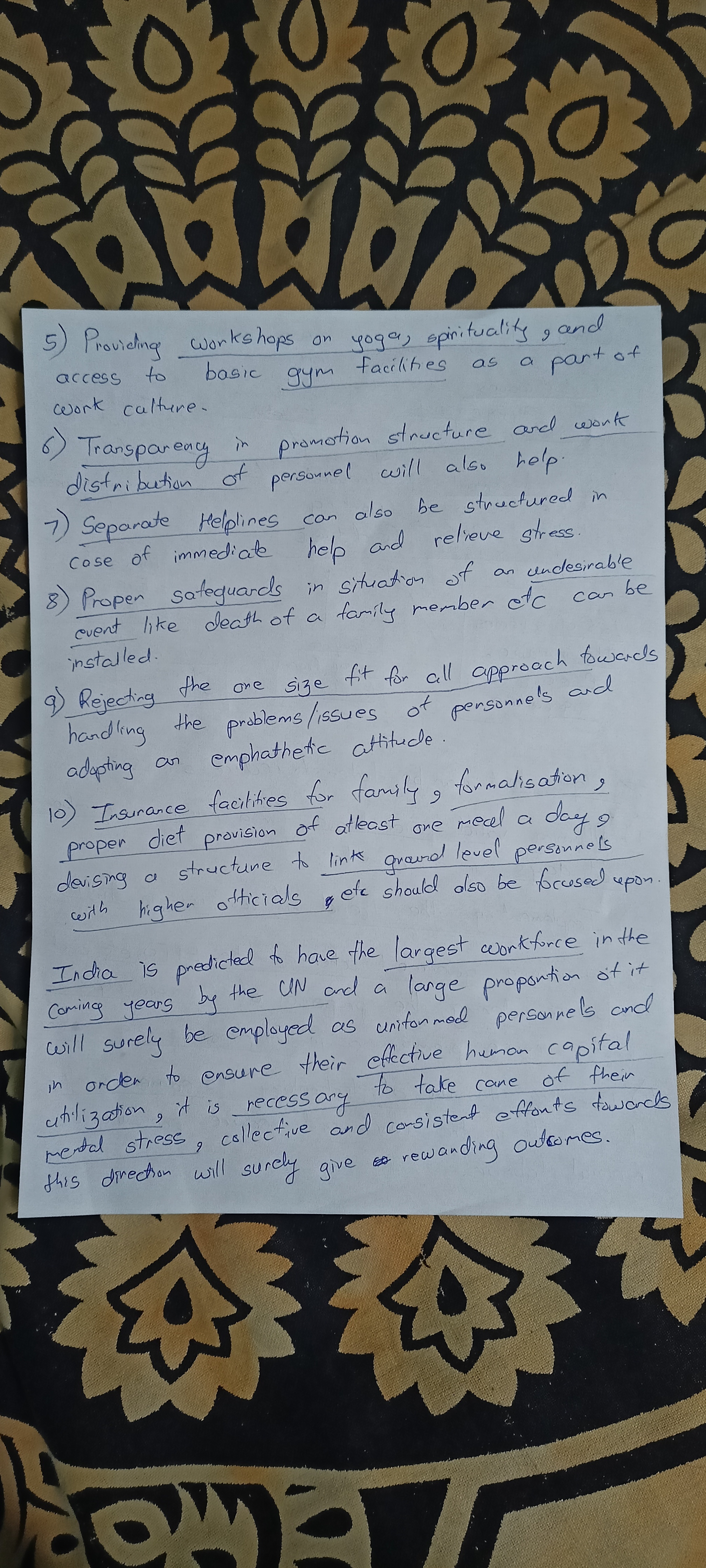 – You can classify the suggestions under separate heads like (a) Improving work conditions: Provisions of regular leave, Emoluments like insurance, extra compensation for extra hours put on duty; (b) Addressing Mental Health: Regular Yoga, Meditation sessions, Helpline numbers to reach out in case of stress etc.