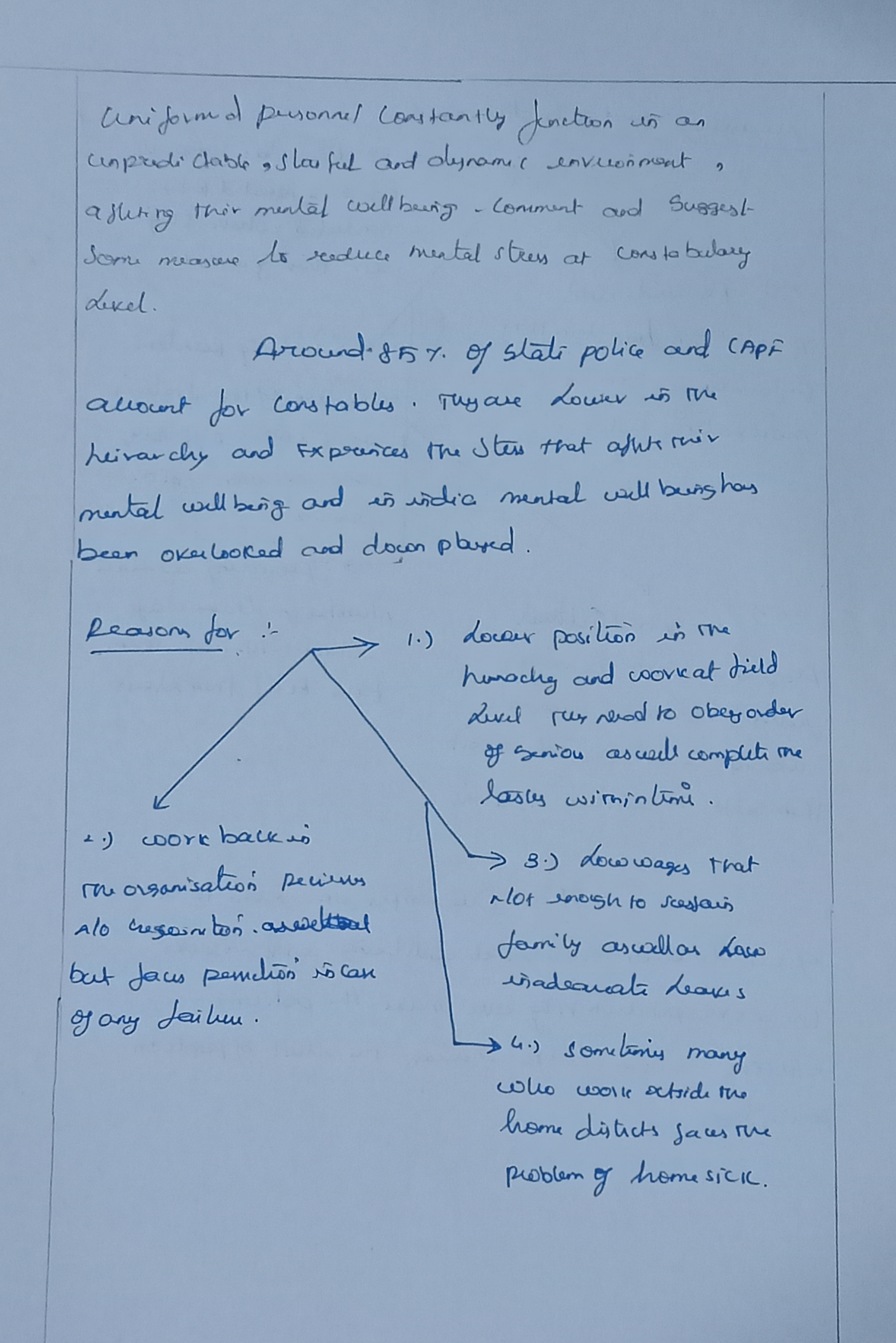 – Mention directly the issue of poor work conditions. The job is physically and mentally stressful and salary/emoluments are not commensurate. Lack of holiday, working away from family add to burden. These points can be added.