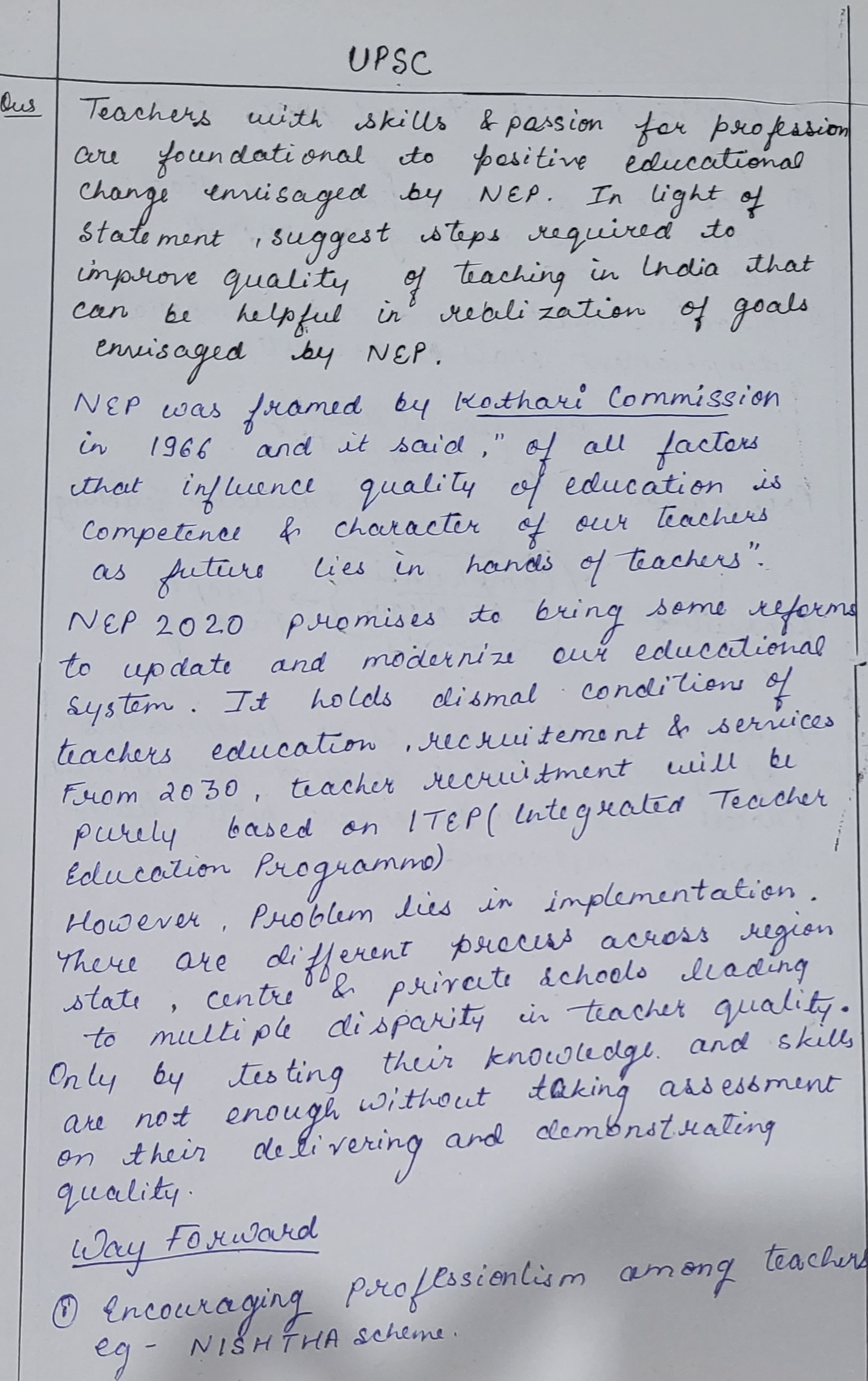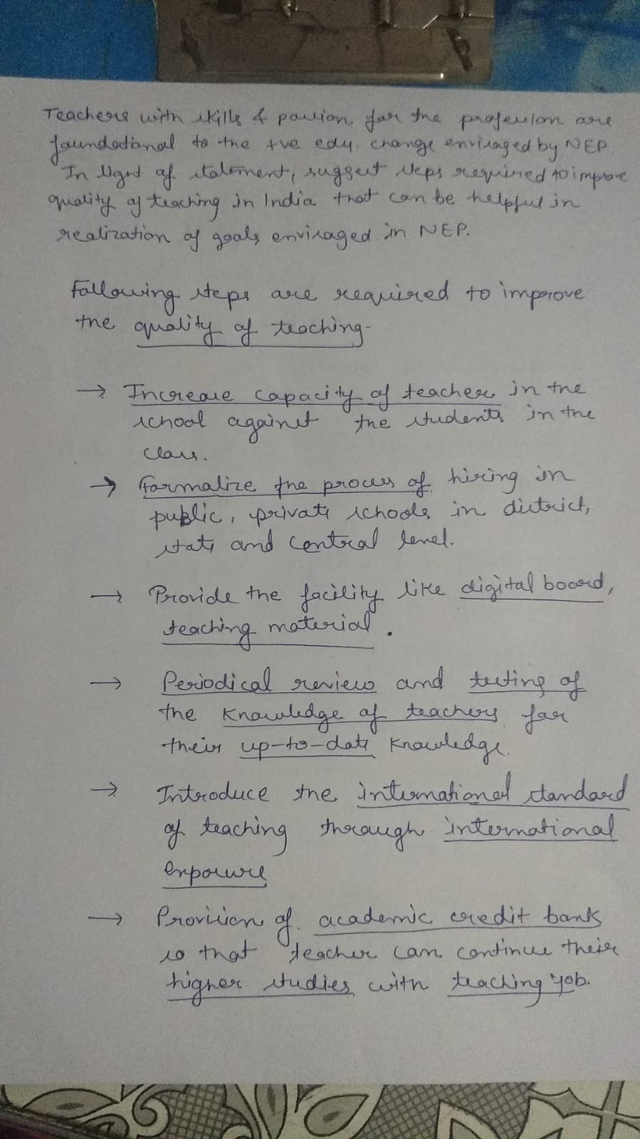 Teachers with skills and passion for the profession are foundational to the positive educational change envisaged by the NEP. In light of the statement, suggest the steps required to improve the quality of teaching in India that can be helpful in the realization of goals envisaged in the National Education Policy.