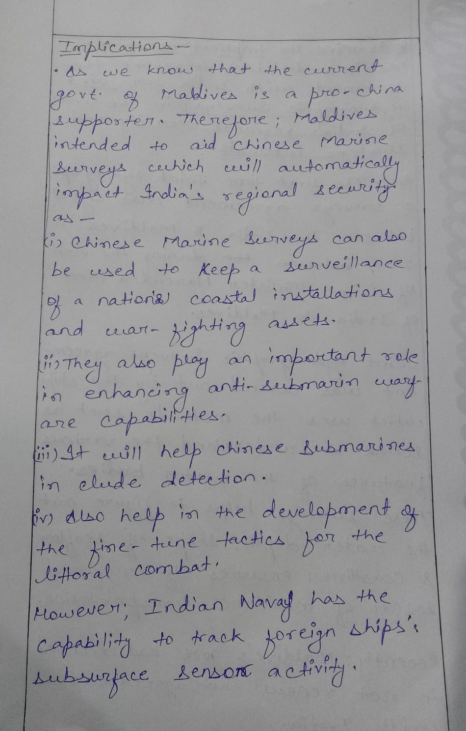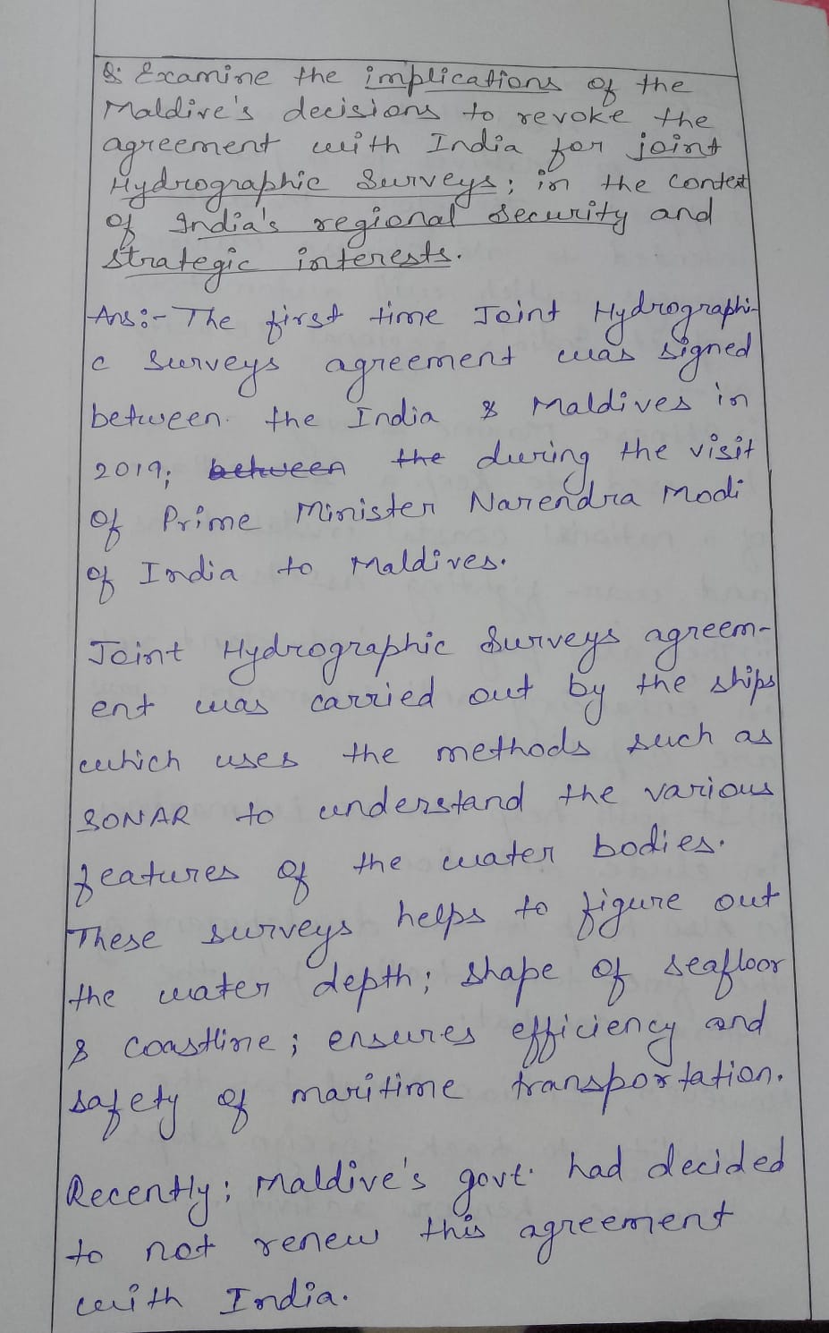 1) Examine the implications of the Maldives’ decision to revoke the agreement with India for joint hydrographic surveys, in the context of India’s regional security and strategic interests.