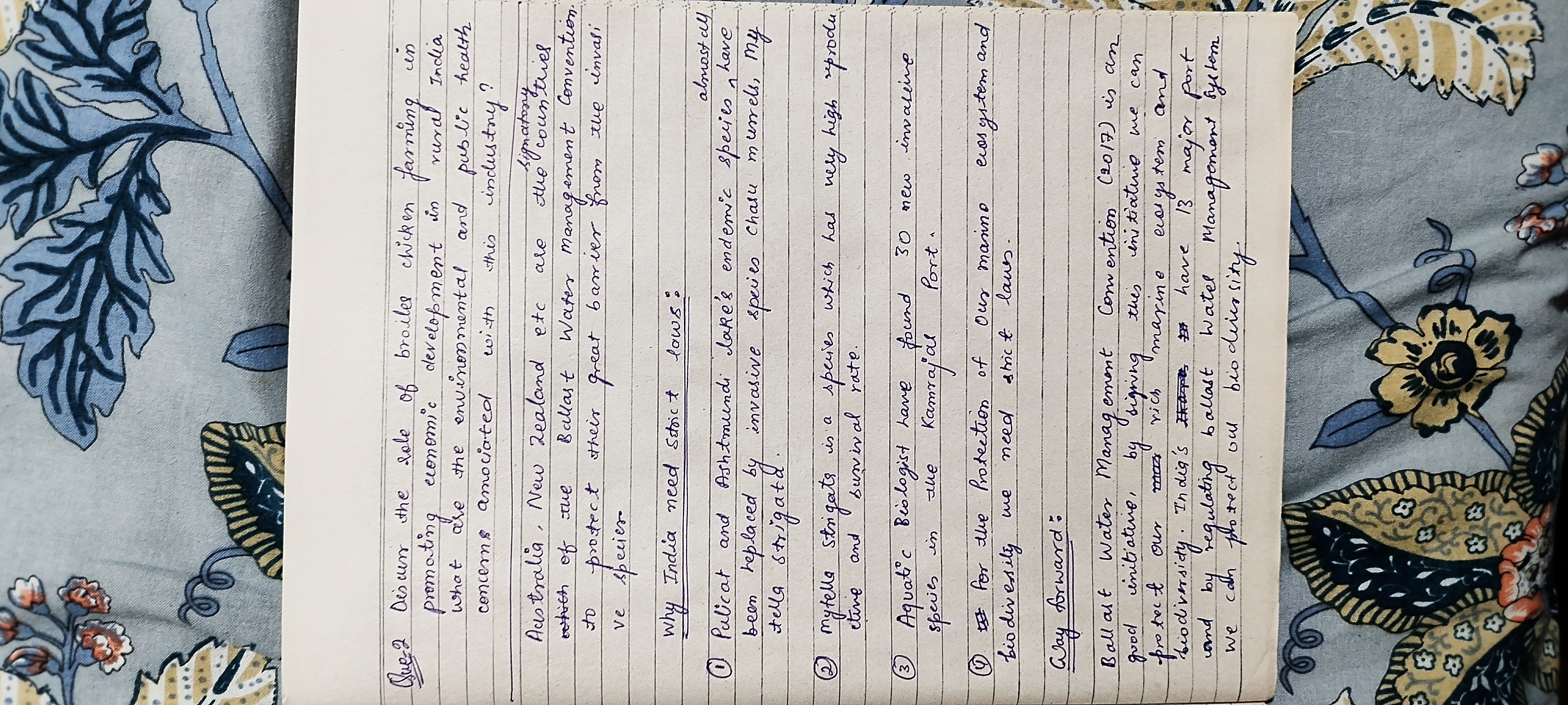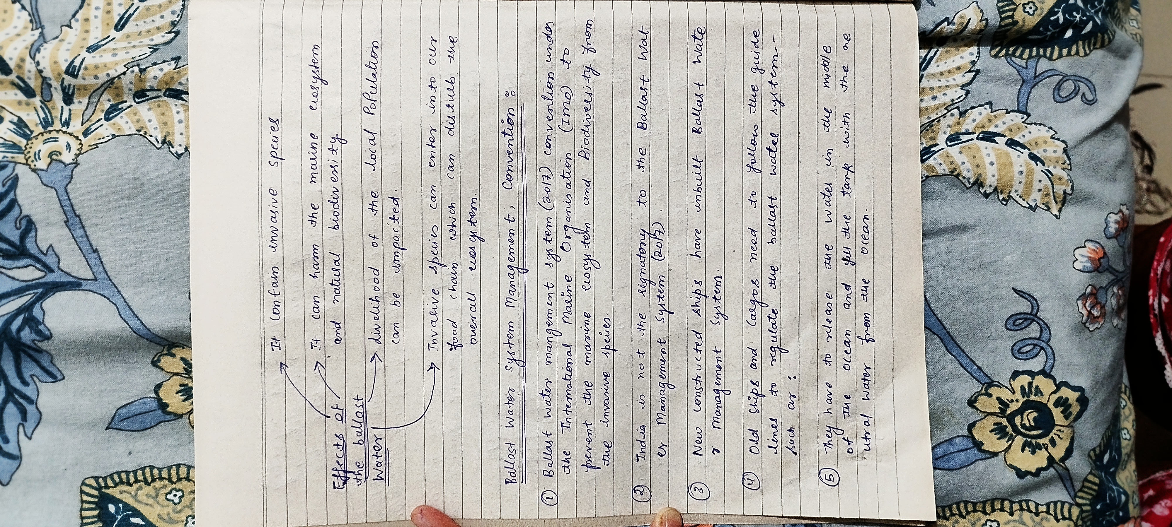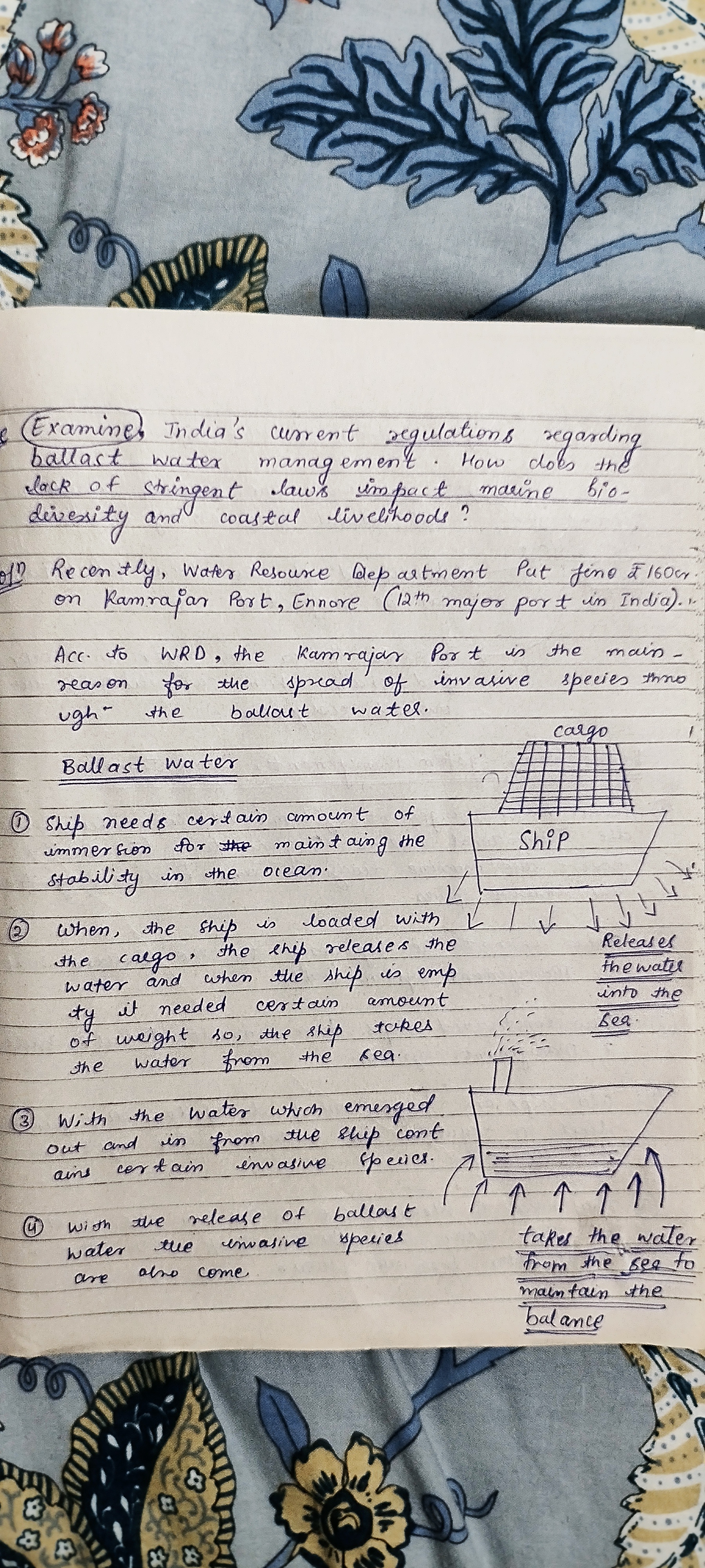 1) Examine India’s current regulations regarding ballast water management. How does the lack of stringent laws impact marine biodiversity and coastal livelihoods?
