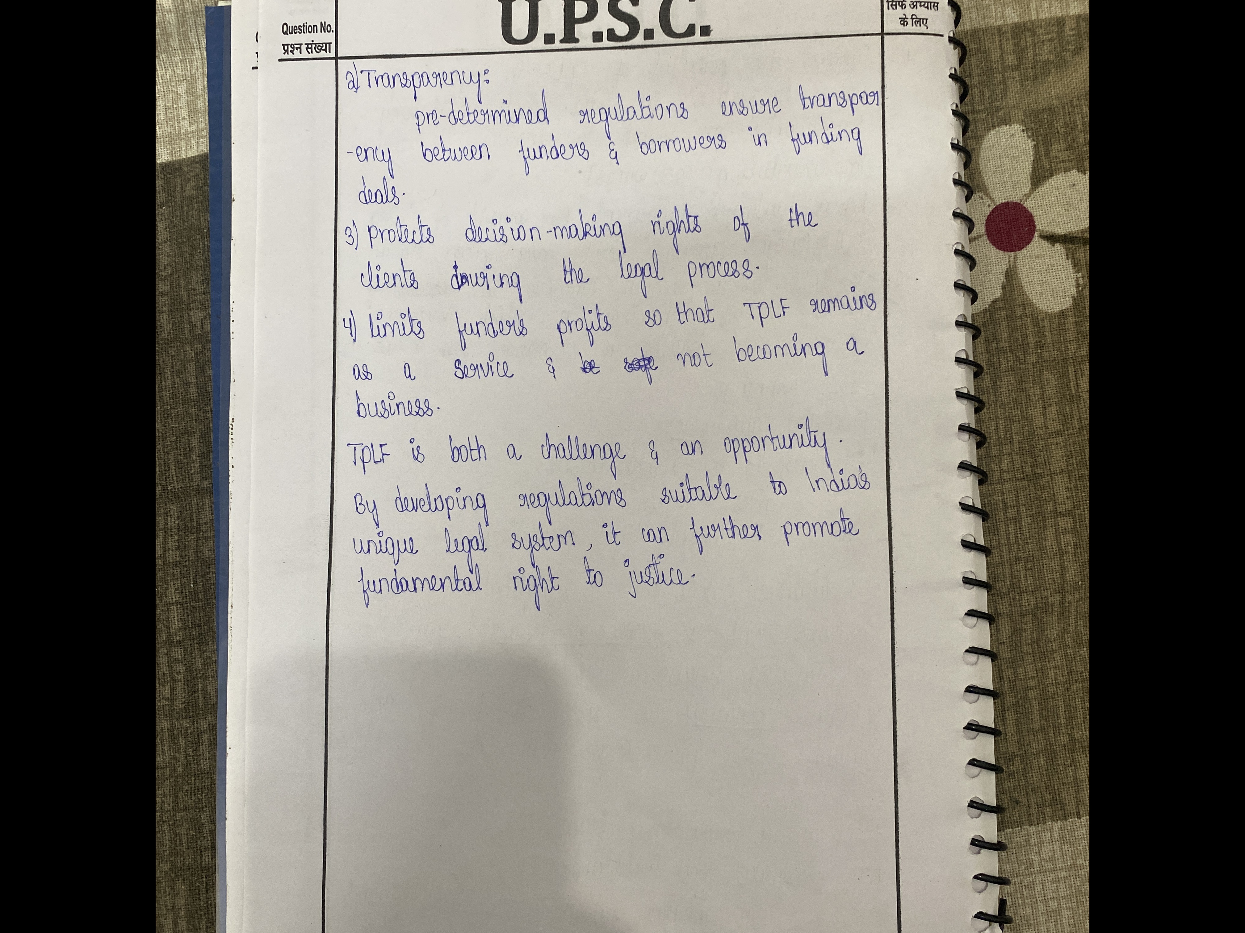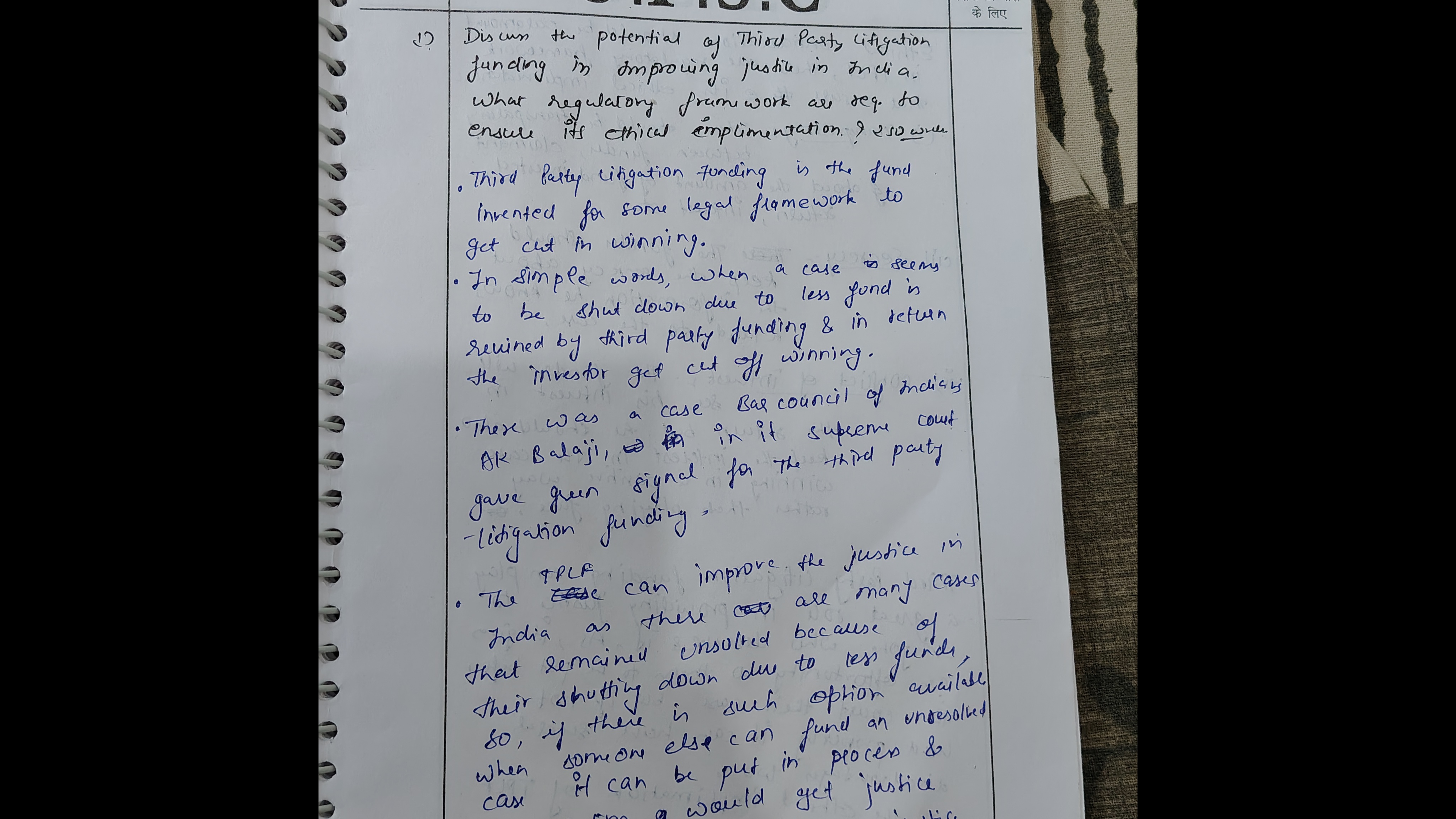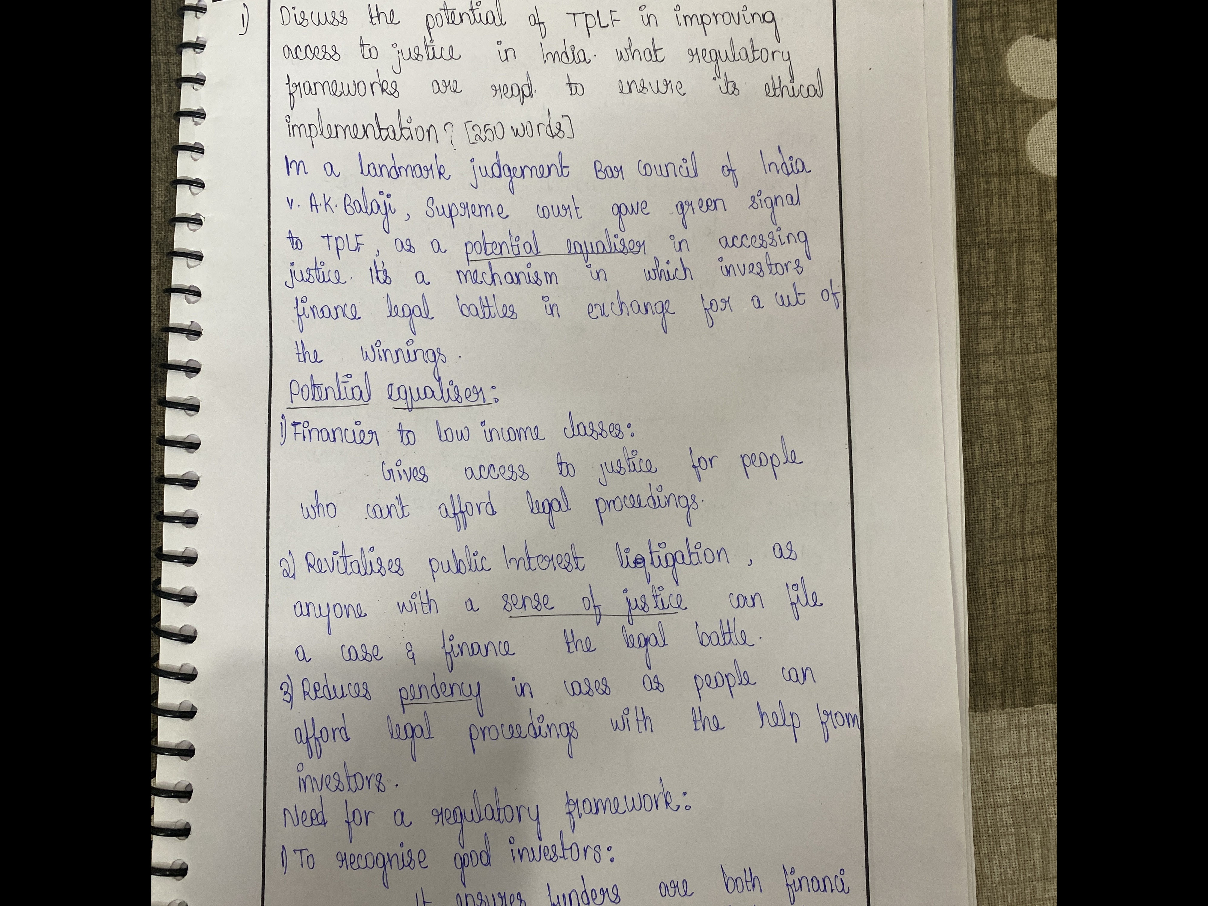 1) Discuss the potential of Third-Party Litigation Funding (TPLF) in improving access to justice in India. What regulatory frameworks are required to ensure its ethical implementation? (250 words)