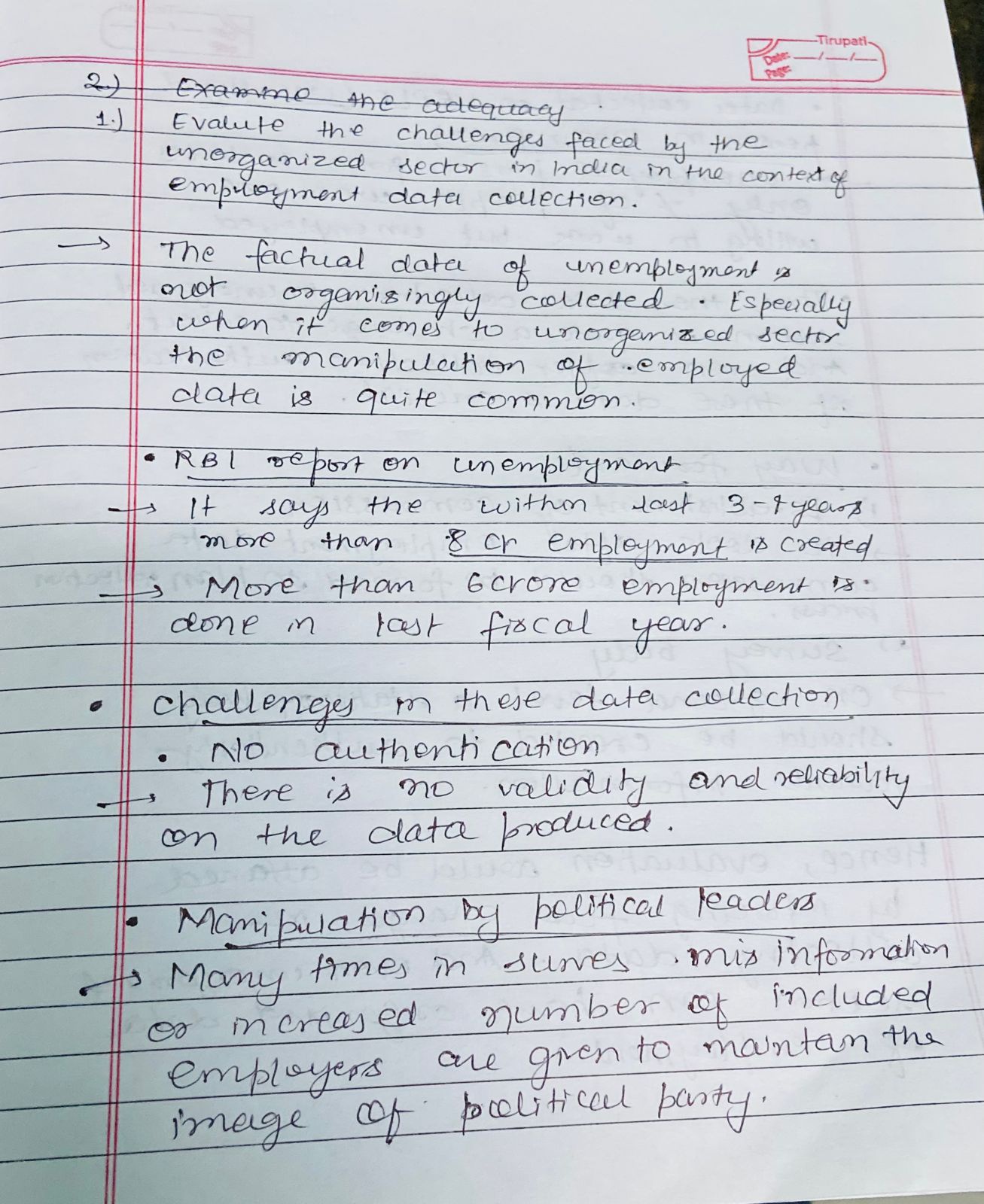 1) Evaluate the challenges faced by the unorganized sector in India in the context of employment data collection. (250 words)