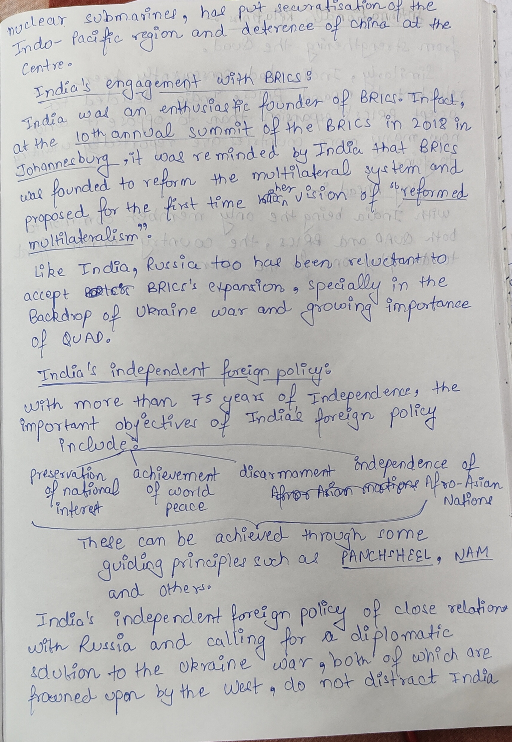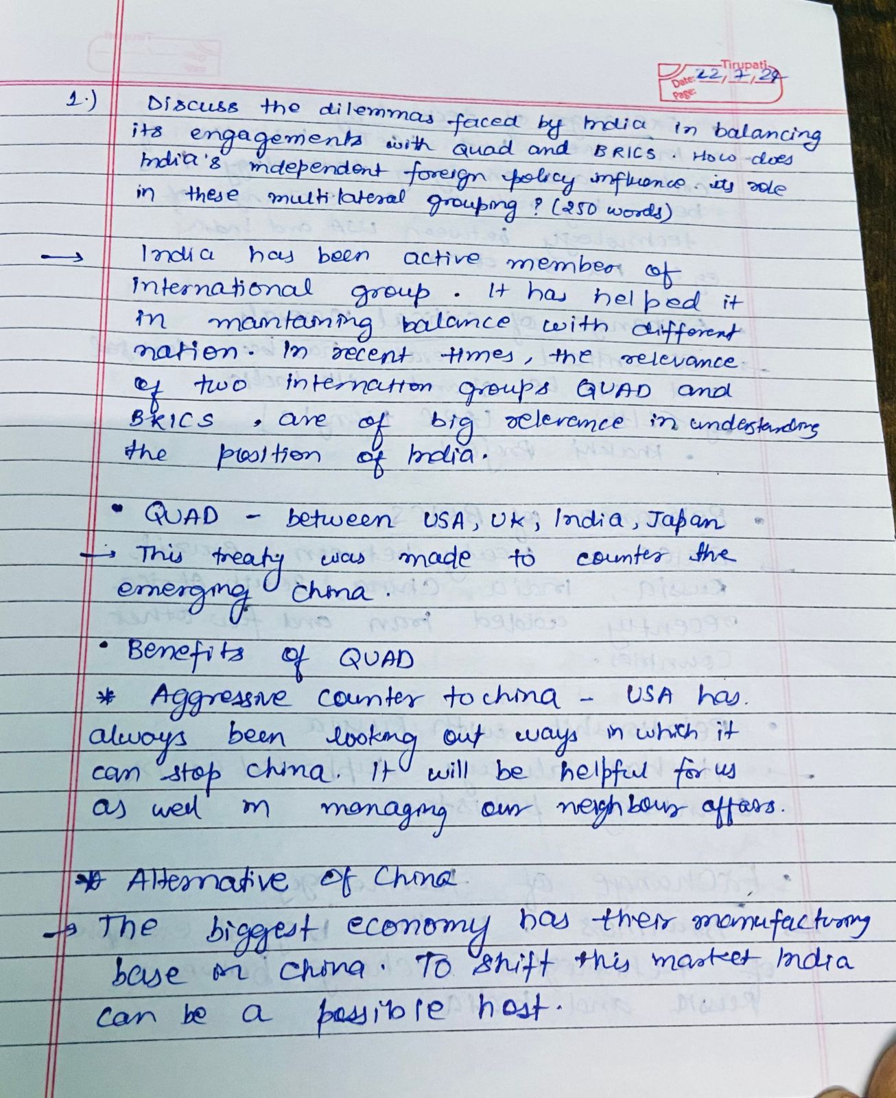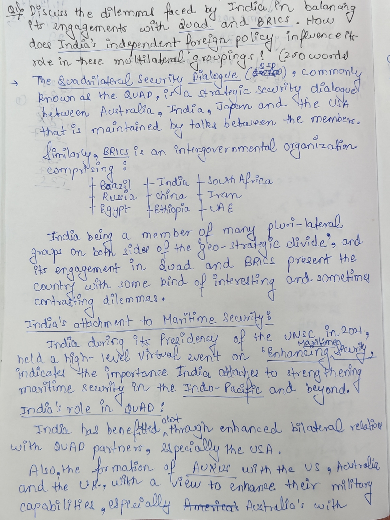 1) Discuss the dilemmas faced by India in balancing its engagements with Quad and BRICS. How does India’s independent foreign policy influence its role in these multilateral groupings? (250 words)