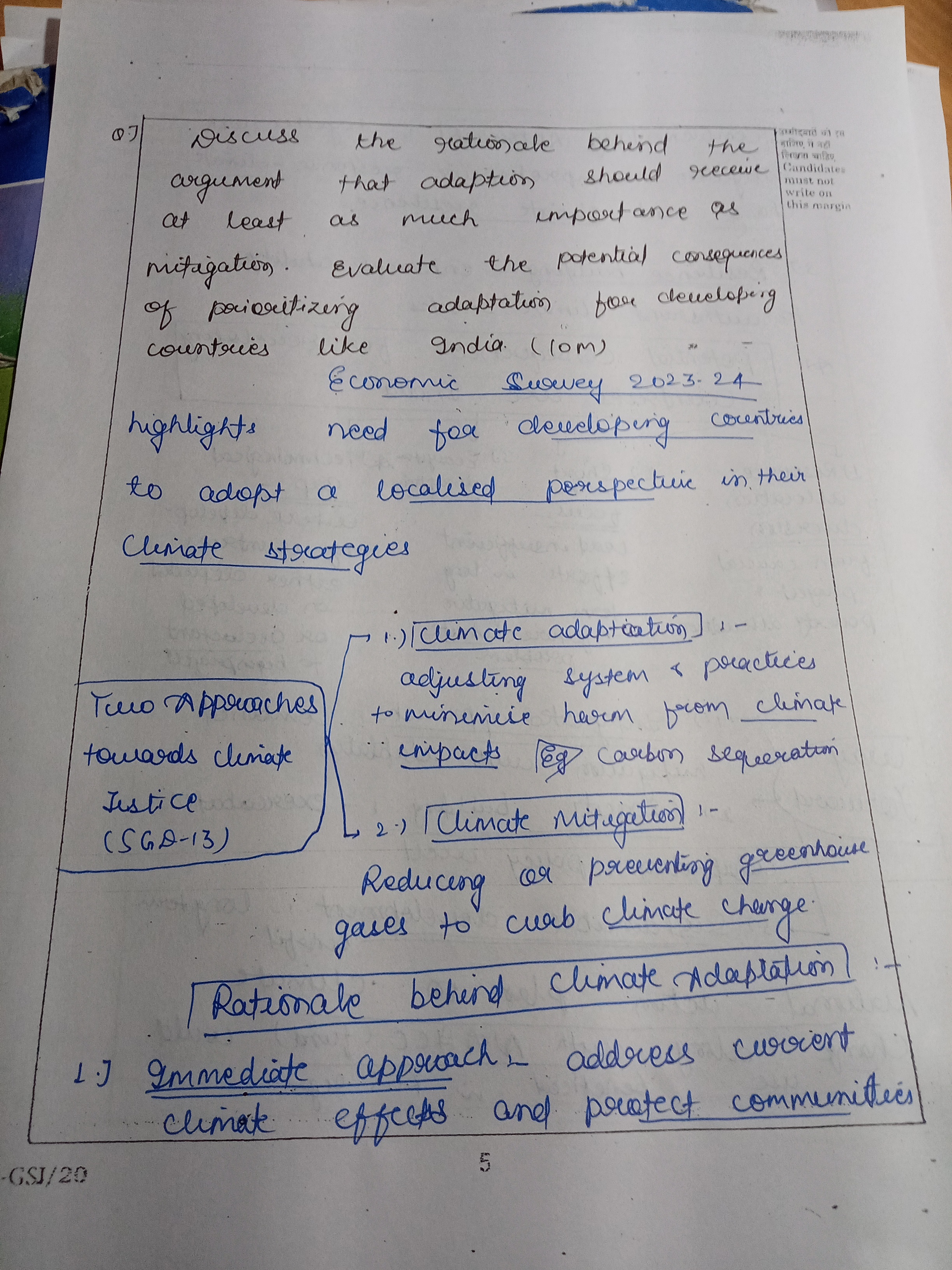 2) Discuss the rationale behind the argument that adaptation should receive at least as much importance as mitigation. Evaluate the potential consequences of prioritizing adaptation for developing countries like India.