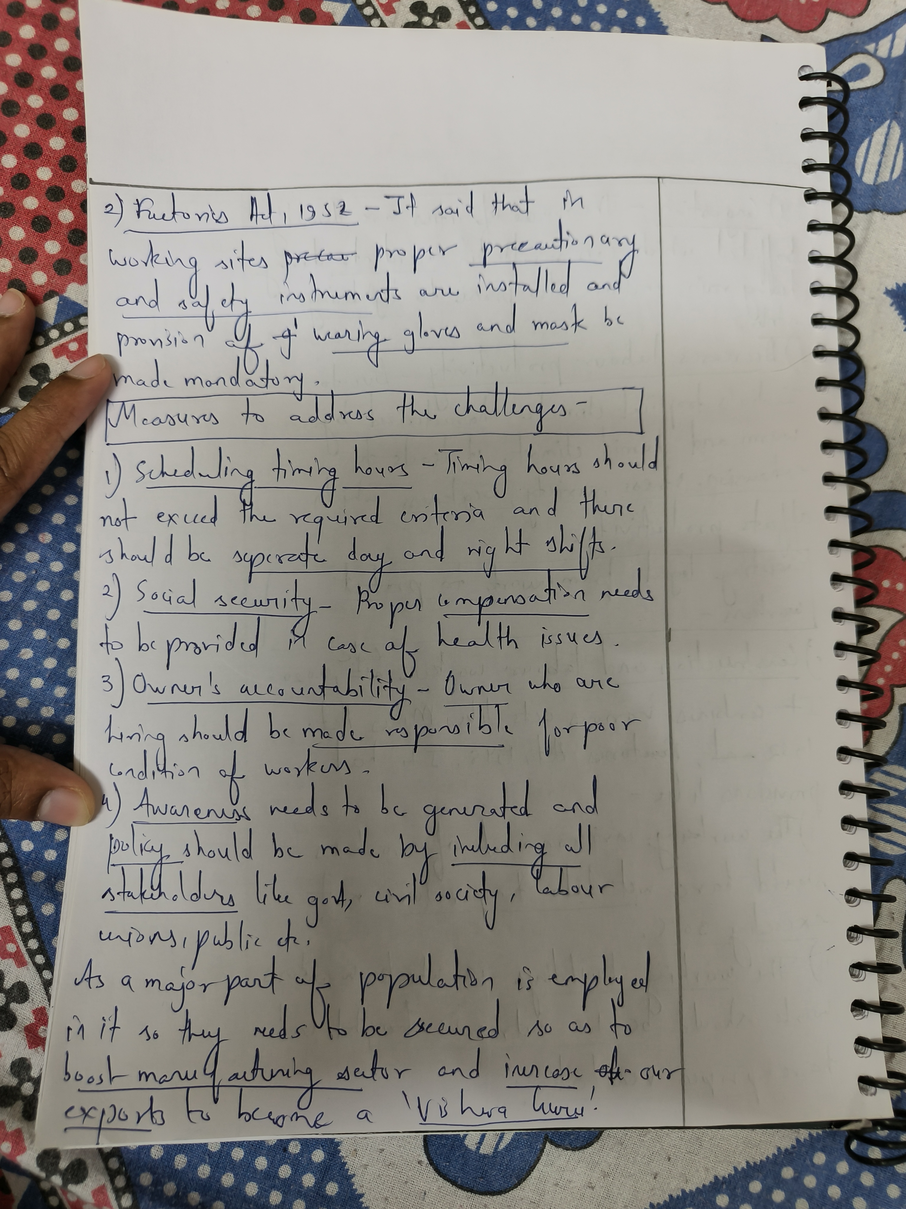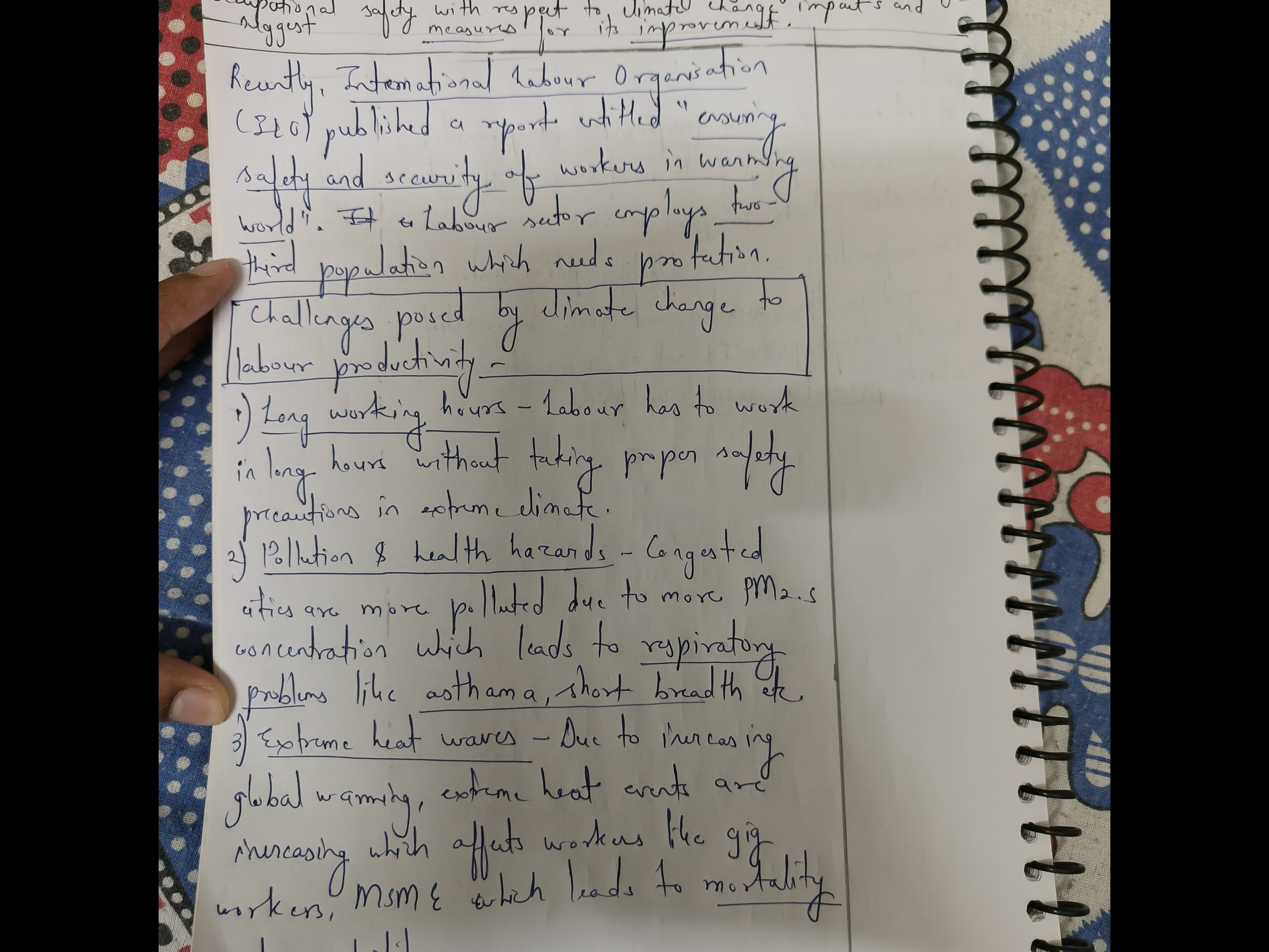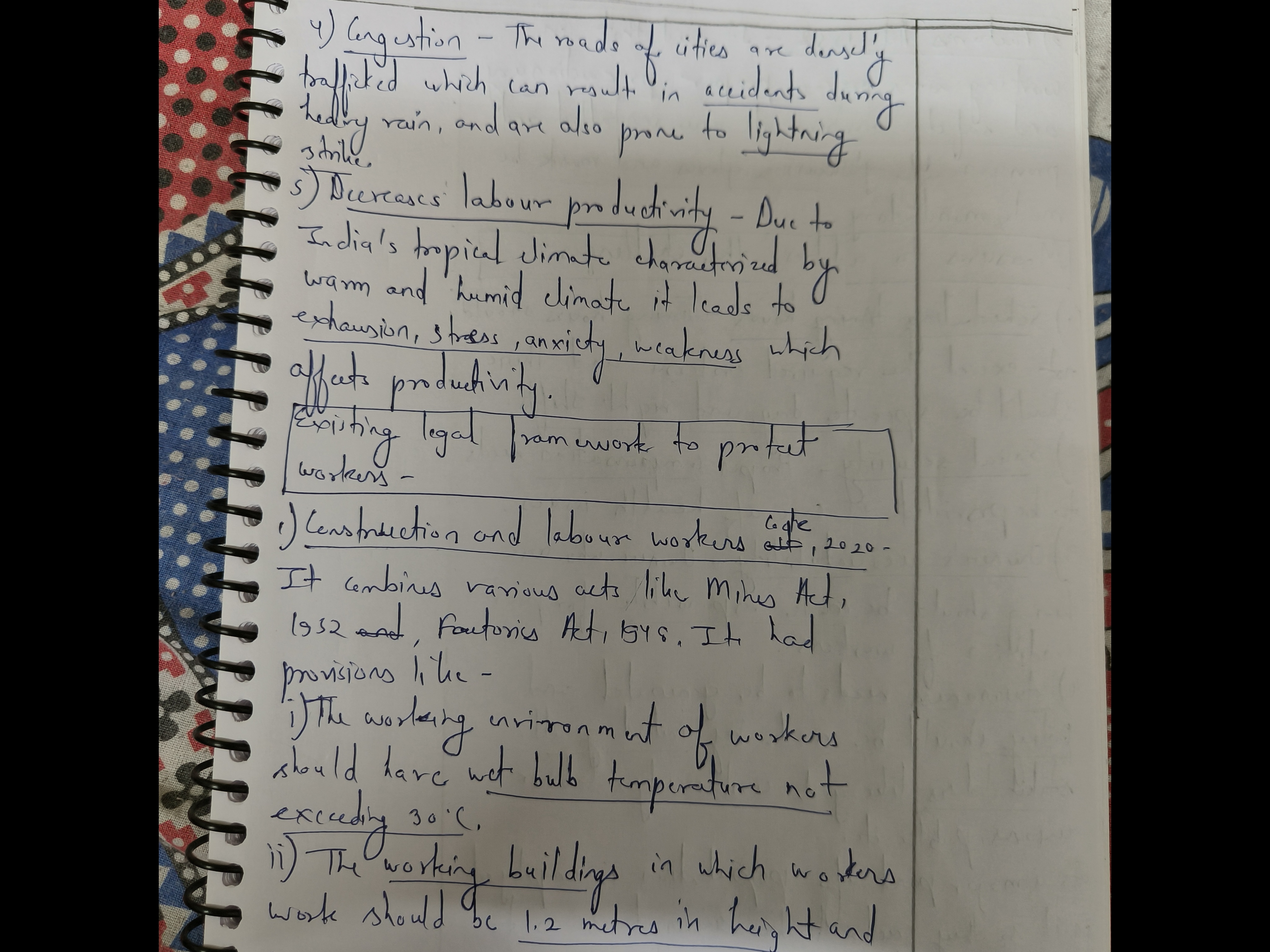 2) Discuss the challenges posed by climate change to labor productivity in India, particularly in the agriculture and construction sectors. Evaluate the existing legal framework governing occupational safety with respect to climate impacts and suggest measures for its improvement.