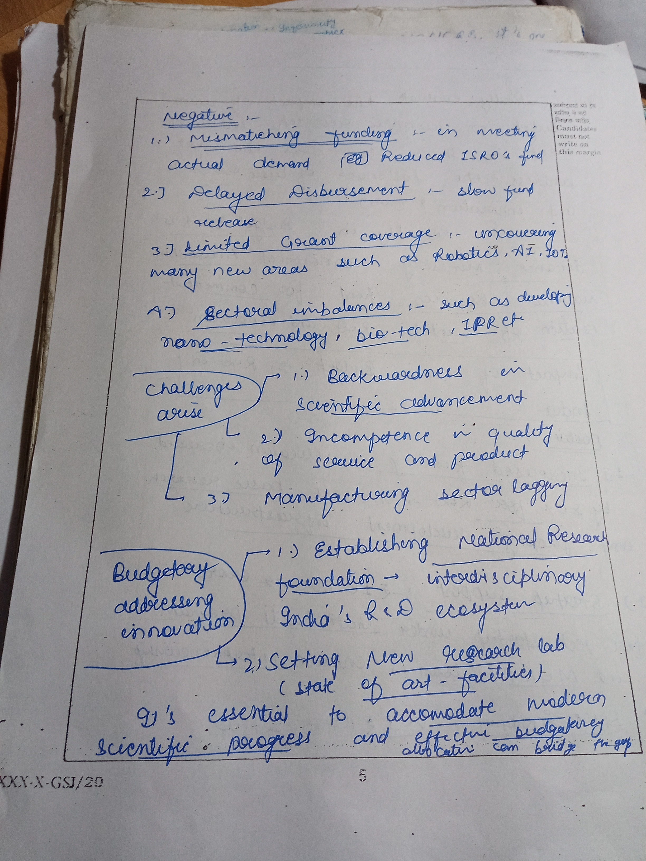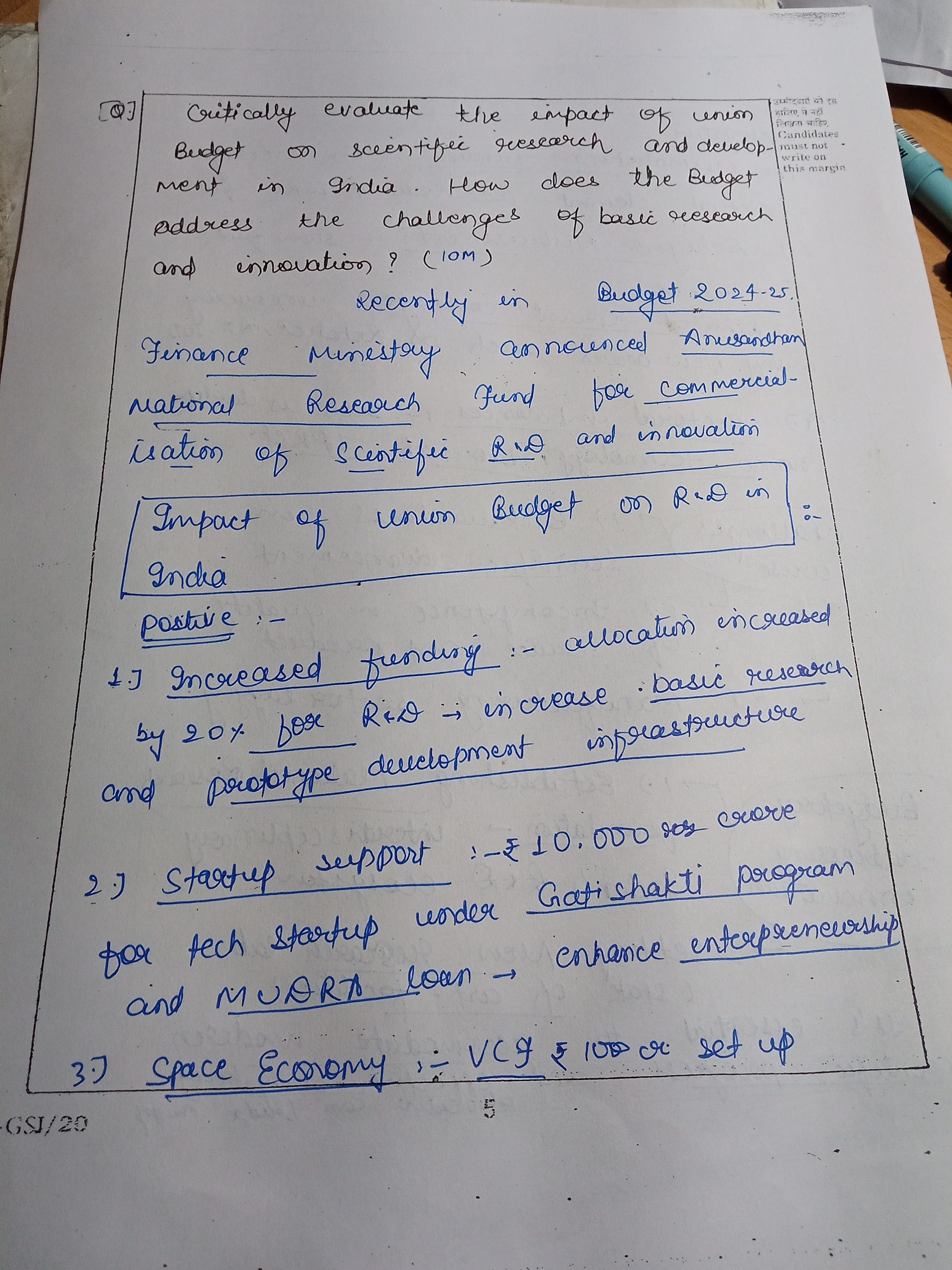 2) Critically evaluate the impact of the Union Budget on scientific research and development in India. How does the budget address the challenges of basic research and innovation? (250 words)