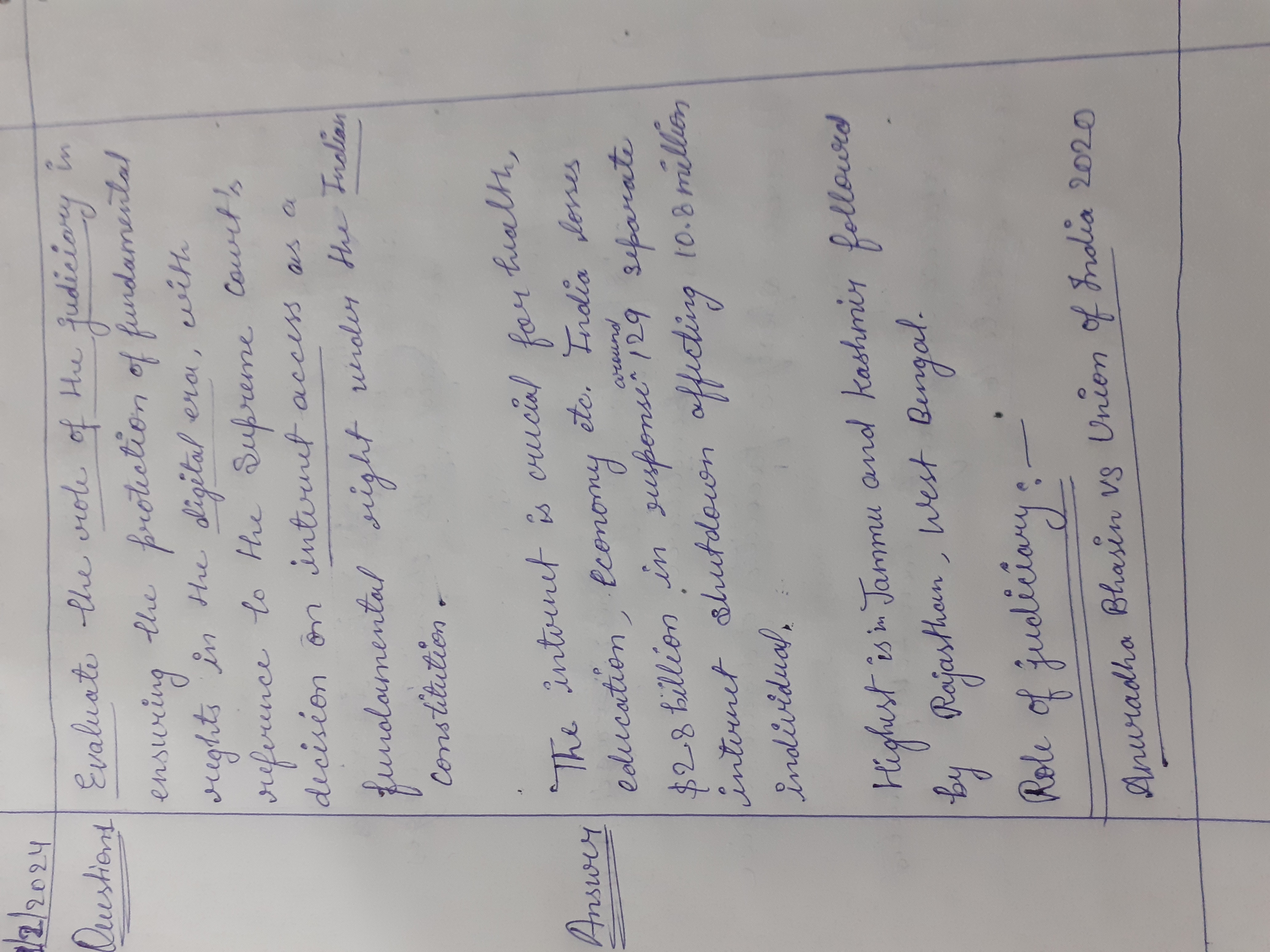 1) Evaluate the role of the judiciary in ensuring the protection of fundamental rights in the digital era, with reference to the Supreme Court’s decision on internet access as a fundamental right under the Indian Constitution.