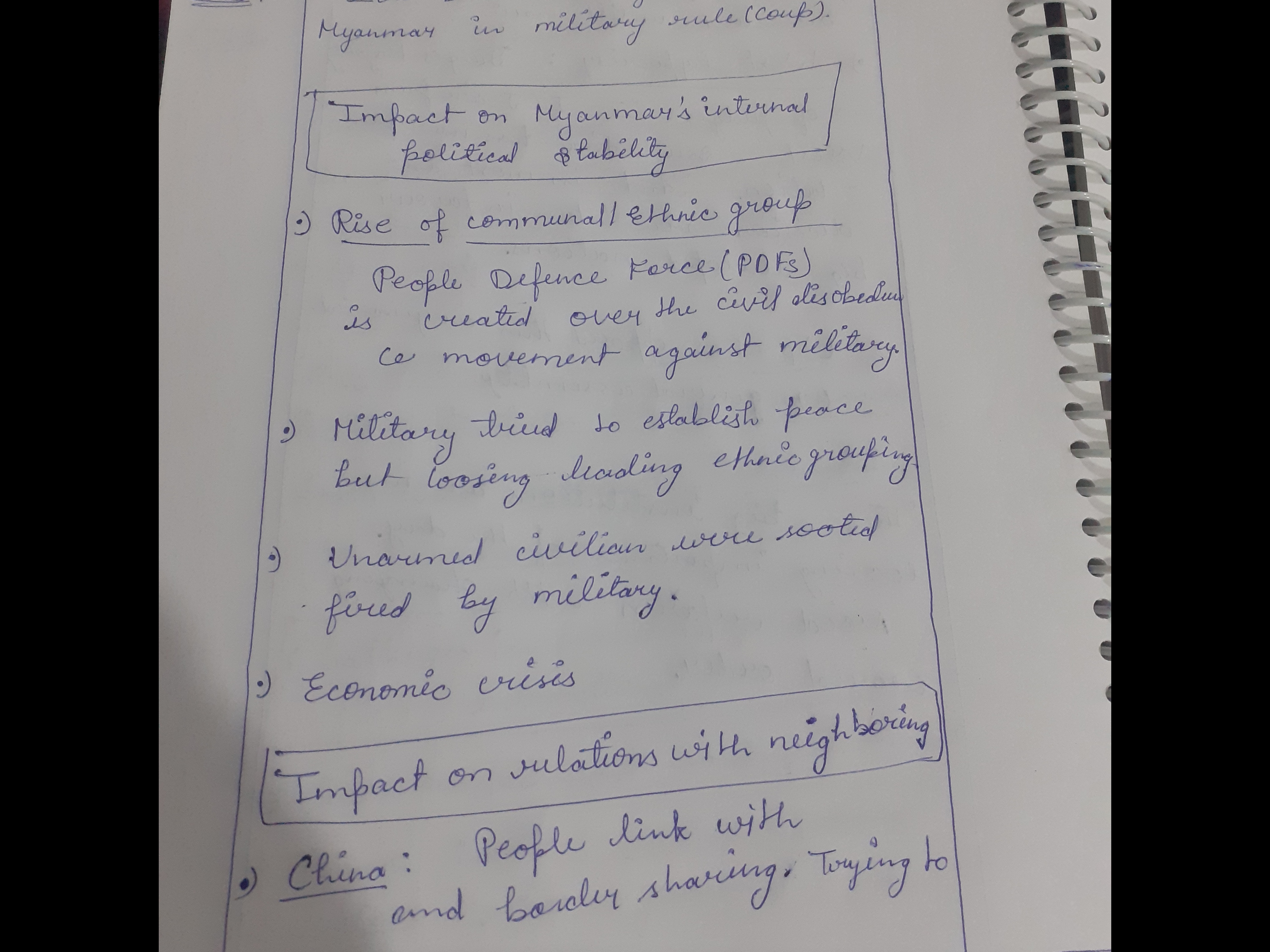 1) Analyze the impact of the military coup in Myanmar on the country’s internal political stability and its relations with neighboring countries, particularly India.