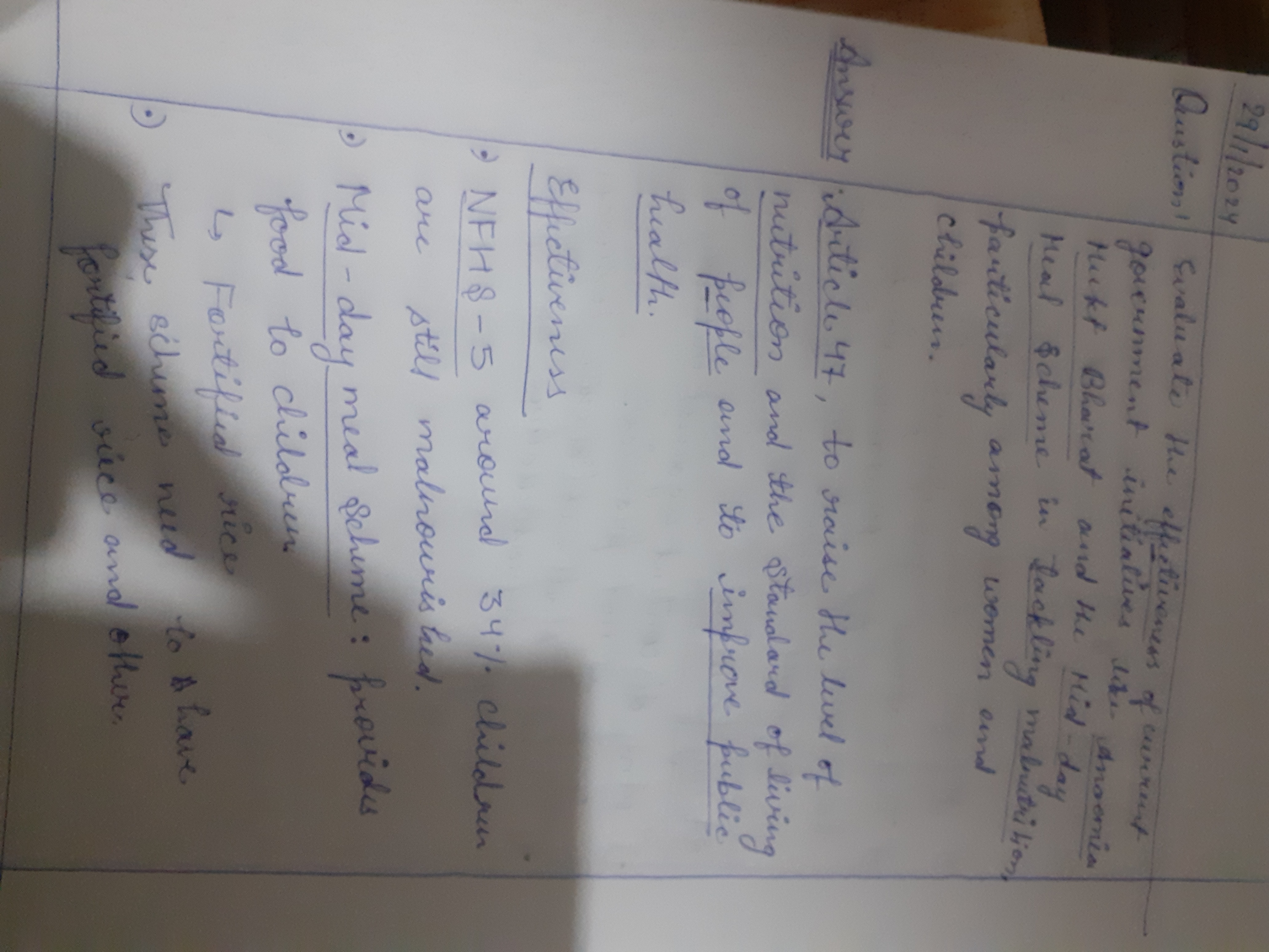 2) Evaluate the effectiveness of current government initiatives like Anaemia Mukt Bharat and the Mid-day Meal Scheme in tackling malnutrition, particularly among women and children.