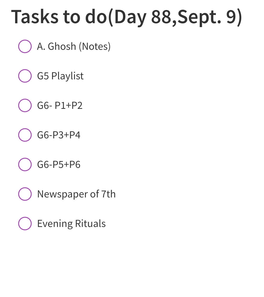 That's it, because I'm sick and don't want to feel overwhelmed. Learning to be patient and easy on myself is one of the things that I battle with almost every day. One day at a time. Monthly mags, optional Monday se dekha jaega. Also, how do you guys manage GS, optional, CA altogether every day, having trouble doing all at once. Have a great day y'all 🌼