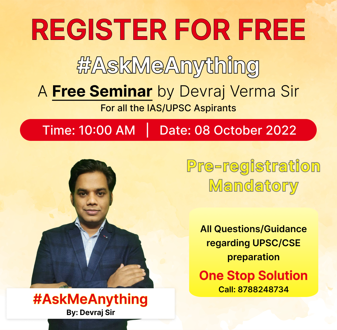 Adhisthan IASis organizing a Free Live Seminar on08 October 2022 at 10:00 AM IST. This seminar will be addressed by the Devraj Verma who is having12+ years of faculty experience in UPSC/IAS Stream. In this Live Seminar, following topics would be covered: