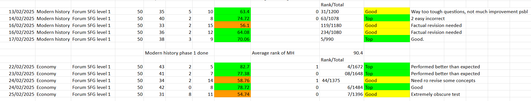 History - Weakness, not that much - kinda fair with the ideas of mains and flow but have to organise prelims centric facts. wasn't able to revise before tests (fell sick) (only place to go is up)
